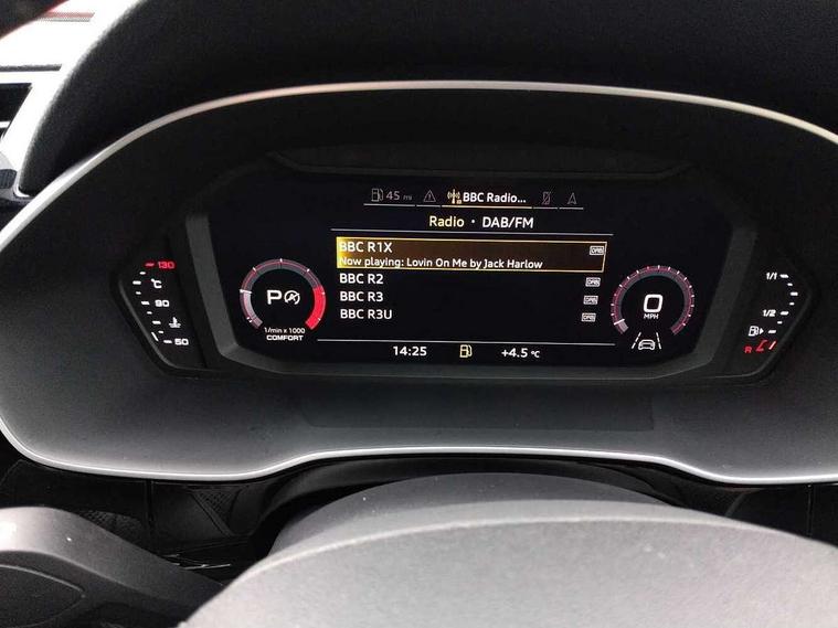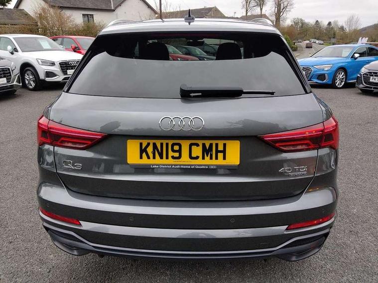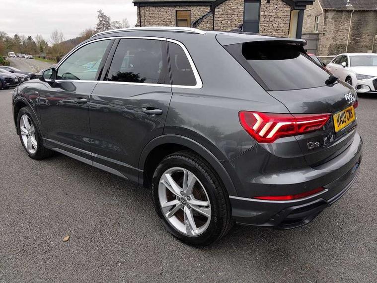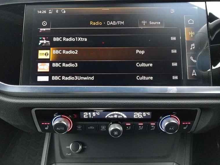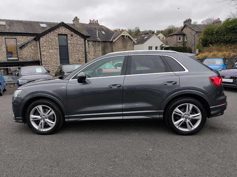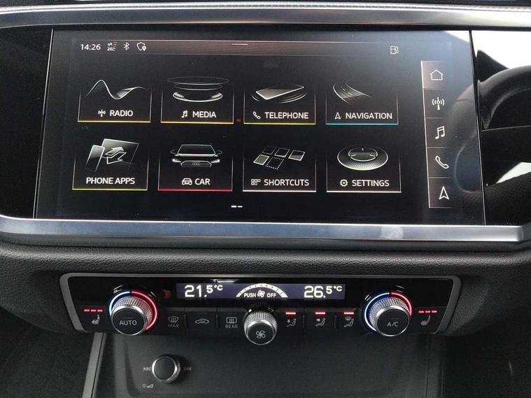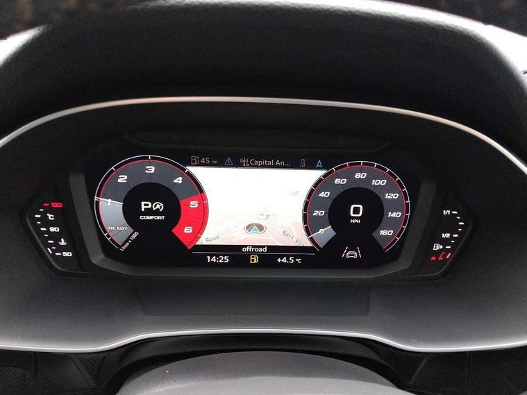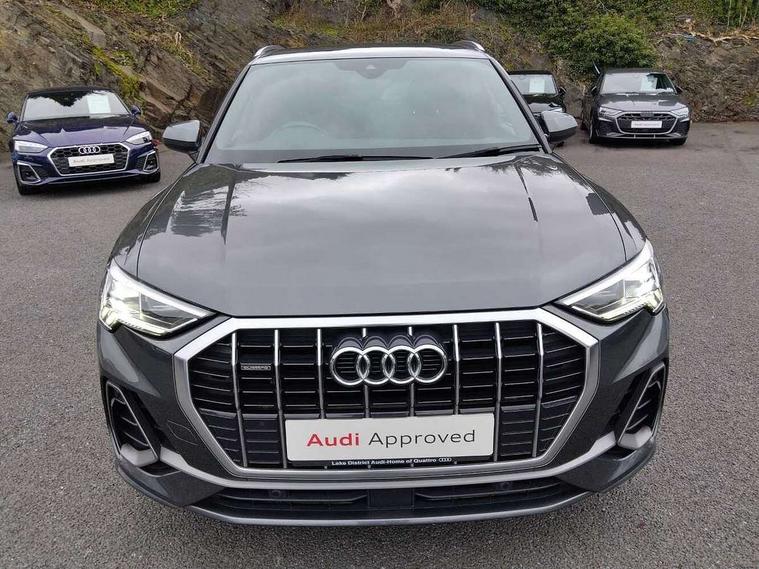 Audi connect safety and service (e-call), Audi drive select, Audi lane departure warning, Audi side assist, Audi smartphone interface, Bluetooth interface, Camera based traffic sign recognition, MMI navigation plus with MMI touch, Power opening/closing tailgate, Progressive steering, Rear parking sensors, Service interval indicator, Stop/start system, Voice control system, Diesel particulate filter, Sports suspension, 1 x USB type C and 1 USB type A charging points, 6 speakers, DAB digital radio module, Acoustic windscreen, Aluminium roof rails, Aluminium window trim, Auto dimming rear view mirror, Body coloured bumpers, Diffuser in matt Platinum grey, Electrically adjustable and heated door mirrors with integrated LED side indicators, Front and rear electric windows, Front fog lights, Front side air inlets in matt platinum grey, Front spoiler blade in matt platinum grey, Grille vertical bars in aluminium silver/Matt, High gloss black finish B and C pillars, LED headlights with LED daytime running lights and dynamic rear indicator, LED rear lights, Privacy glass, Rain and light sensors, Rear diffuser strip in matt titanium black, S Line badge on wings, S Line front and rear bumpers, Side skirt insert in matt Platinium grey, Titanium black radiator grille, 12V socket in rear centre console, 40:20:40 split folding rear bench seat, Adjustable rear seat bench/backrest with centre armrest and cupholder, Aluminium door sill trims, Black cloth headlining, Dual zone climate control, Front and rear black floor mats with contrast stitching in rock grey, Front and rear headrests, Front centre armrest with storage compartment and angle adjustment, Illuminated door sill trims with S logo, ISOFIX child seat mounting and Top Tether with front passenger airbag deactivation, Manual front seats with height adjustment, Perforated leather gearknob, Stainless steel luggage compartment sill finisher, Stainless steel pedals, Non smoking pack - Q3, 3x3 point rear seatbelts, 6 airbags - Driver, front passenger, curtain and side windows, Audi pre-sense front with pedestrain and cyclist recognition, Electrically operated child locks on rear doors, Electromechanical parking brake, Electronic stabilisation control including ABS, ASR and EDL, Hill hold assist, Pre sense basic, Seatbelt monitoring, Tyre pressure warning, Warning triangle and first aid kit, Anti theft alarm, Anti theft wheel bolts, Remote central locking, Dark matt brushed aluminium inlay, MMI touch colour display in gloss black with aluminium surround,
