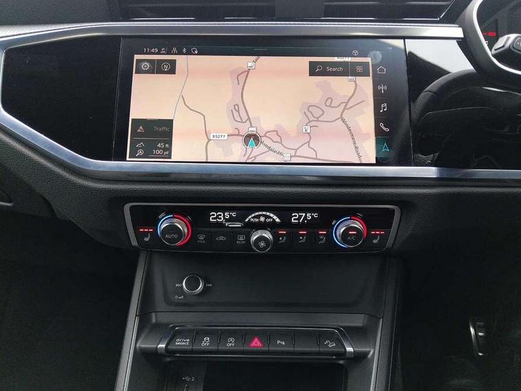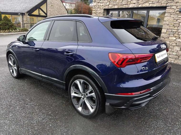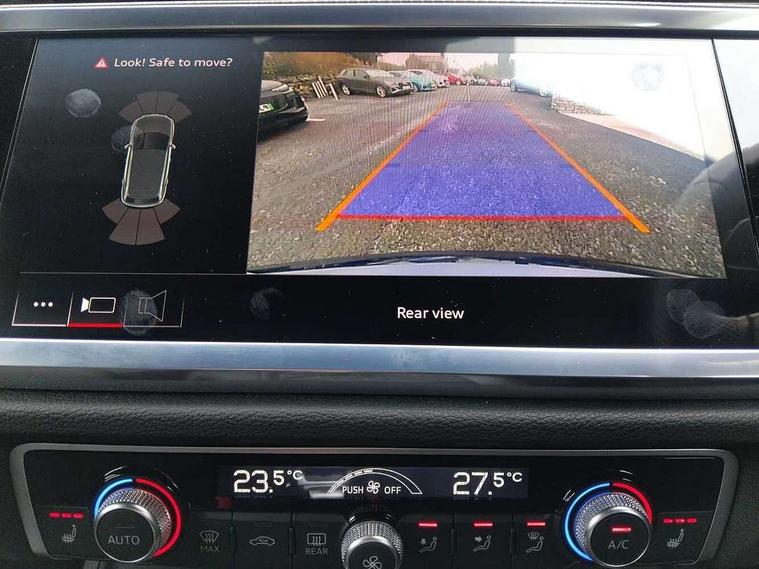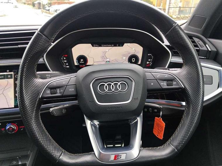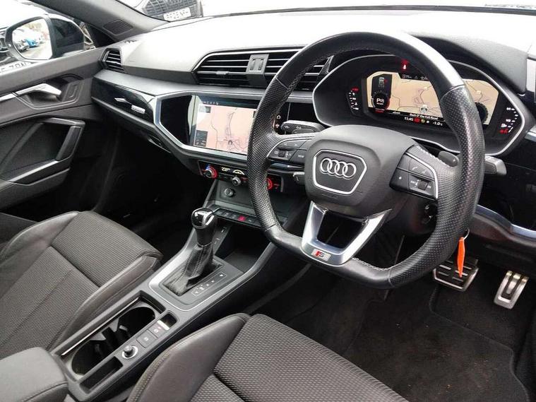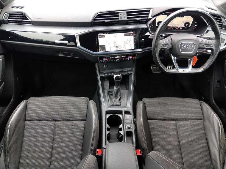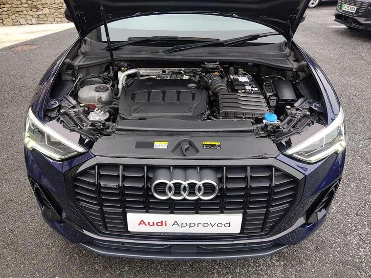 Amazon alexa Integration, Audi connect safety and service (e-call), Audi drive select, Audi lane departure warning, Audi Virtual Cockpit - 10.25" display, Bluetooth interface, Camera based traffic sign recognition, MMI Navigation Plus with high resolution 10.1 inch touchscreen colour display, Power operated tailgate, Progressive steering, Service interval indicator, Smartphone interface includes wireless Apple carplay/Android Auto, Start stop system with recuperation, Voice control system with natural language interaction, Diesel particulate filter, Sports suspension, 2 USB-C ports with charge and data functions, 6 passive loudspeakers, DAB digital radio module, Acoustic windscreen, Auto dimming frameless rear view mirror, Black roof rails, Electrically folding, adjustable and heated door mirrors with integrated LED side indicators and kerb view function for passenger side, Front and rear electric windows, Front fog lights, Grille vertical bars in aluminium silver/Matt, High gloss black finish B and C pillars, LED headlights with LED daytime running lights and dynamic rear indicator, LED rear lights, Privacy glass dark tinted rear and rear-side windows (from B-pillar backwards), Rain and light sensors, Rear diffuser strip in matt titanium black, S line bumpers in contrasting Manhattan grey, 12V socket in rear centre console, 40:20:40 folding with manual adjustment for 60:40 forwards/backwards position and backrest angle, Adjustable rear seat bench/backrest with centre armrest and cupholder, Black cloth headlining, Dual zone electronic climate control, Front and rear black floor mats with contrast stitching in rock grey, Front and rear headrests, Front and rear roof module including reading lights, Front centre armrest, Glove compartment lighting, Height and reach adjustable steering wheel, Illuminated door sill trims with S logo, ISOFIX child seat mounting for front passenger with airbag deactivation and outer rear seat including top tether attachment point for outer rear seats, Luggage compartment light, Manual front seats with height adjustment, Perforated leather gearknob, Stainless steel luggage compartment sill finisher, Stainless steel pedals, Black styling pack - Q3, Non smoking pack - Q3, 3x3 point rear seatbelts, 6 airbags - Driver, front passenger, curtain and side windows, Audi pre-sense front with pedestrain and cyclist recognition, Electrically operated child locks on rear doors, Electromechanical parking brake, Electronic stabilisation control including ABS, ASR and EDL, Hill descent control, Hill hold assist, Pre sense basic, Seatbelt monitoring, Tyre pressure warning, Warning triangle and first aid kit, Anti theft alarm, Anti theft wheel bolts, Remote central locking, Detail dashboard around MMI touch colour display in glass look, black with surround in aluminium look, Leatherette door armrest, Piano black inlay,