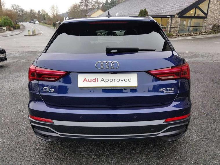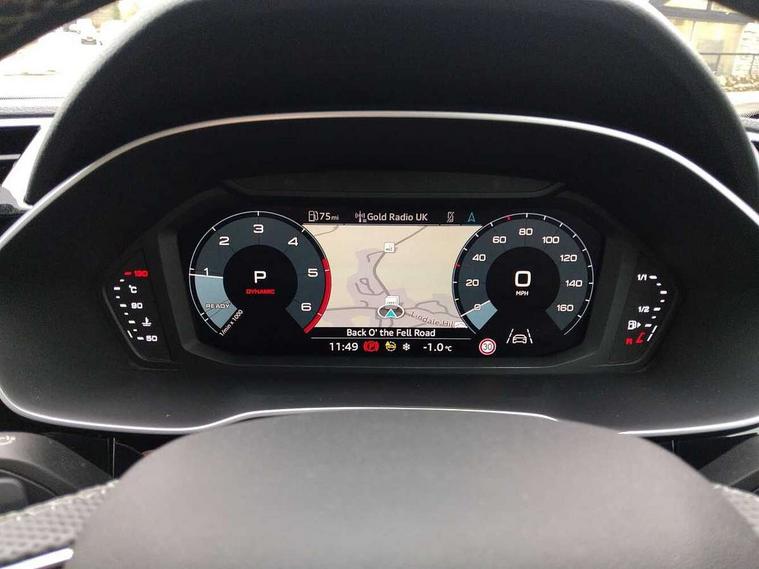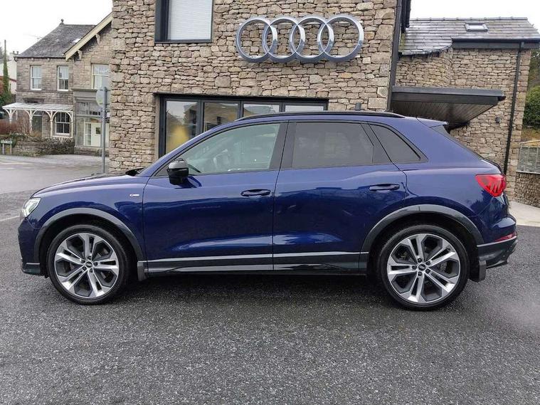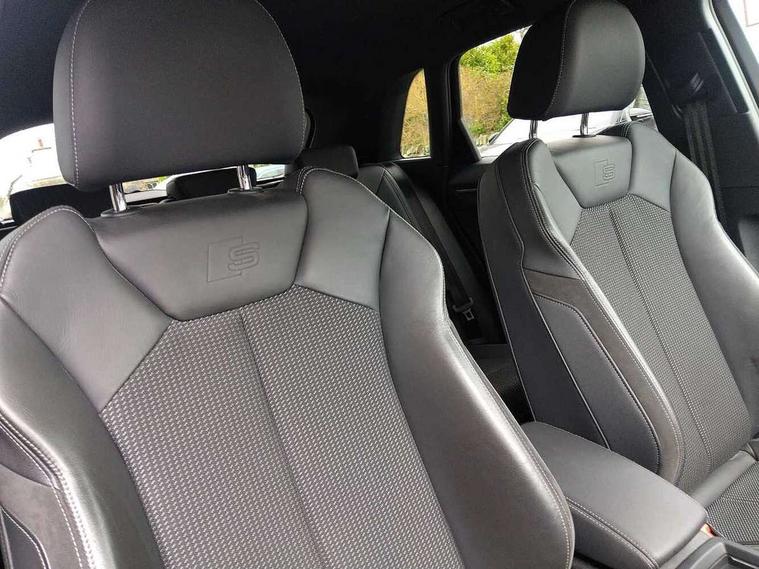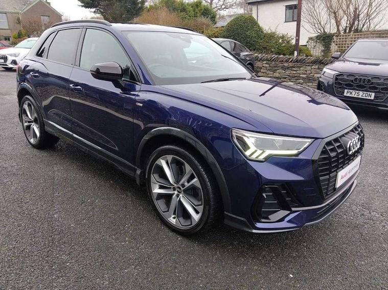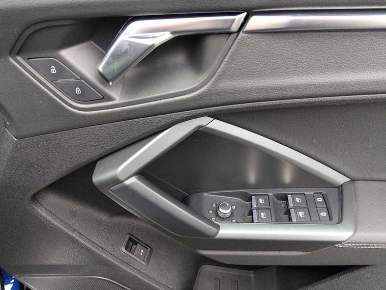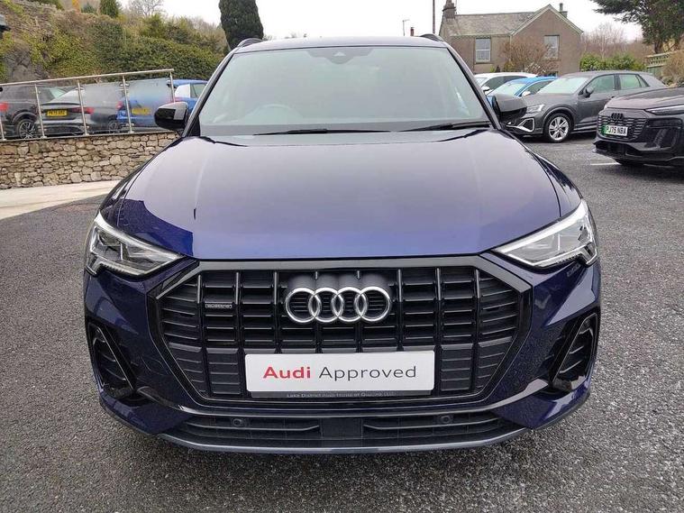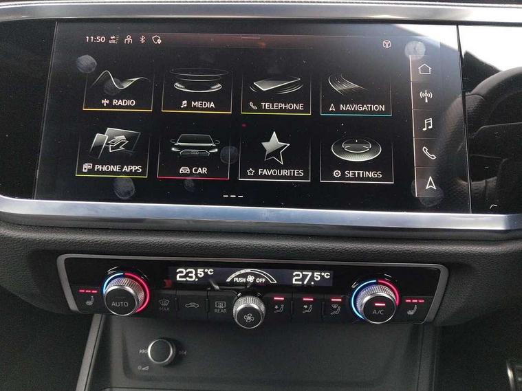 Amazon alexa Integration, Audi connect safety and service (e-call), Audi drive select, Audi lane departure warning, Audi Virtual Cockpit - 10.25" display, Bluetooth interface, Camera based traffic sign recognition, MMI Navigation Plus with high resolution 10.1 inch touchscreen colour display, Power operated tailgate, Progressive steering, Service interval indicator, Smartphone interface includes wireless Apple carplay/Android Auto, Start stop system with recuperation, Voice control system with natural language interaction, Diesel particulate filter, Sports suspension, 2 USB-C ports with charge and data functions, 6 passive loudspeakers, DAB digital radio module, Acoustic windscreen, Auto dimming frameless rear view mirror, Black roof rails, Electrically folding, adjustable and heated door mirrors with integrated LED side indicators and kerb view function for passenger side, Front and rear electric windows, Front fog lights, Grille vertical bars in aluminium silver/Matt, High gloss black finish B and C pillars, LED headlights with LED daytime running lights and dynamic rear indicator, LED rear lights, Privacy glass dark tinted rear and rear-side windows (from B-pillar backwards), Rain and light sensors, Rear diffuser strip in matt titanium black, S line bumpers in contrasting Manhattan grey, 12V socket in rear centre console, 40:20:40 folding with manual adjustment for 60:40 forwards/backwards position and backrest angle, Adjustable rear seat bench/backrest with centre armrest and cupholder, Black cloth headlining, Dual zone electronic climate control, Front and rear black floor mats with contrast stitching in rock grey, Front and rear headrests, Front and rear roof module including reading lights, Front centre armrest, Glove compartment lighting, Height and reach adjustable steering wheel, Illuminated door sill trims with S logo, ISOFIX child seat mounting for front passenger with airbag deactivation and outer rear seat including top tether attachment point for outer rear seats, Luggage compartment light, Manual front seats with height adjustment, Perforated leather gearknob, Stainless steel luggage compartment sill finisher, Stainless steel pedals, Black styling pack - Q3, Non smoking pack - Q3, 3x3 point rear seatbelts, 6 airbags - Driver, front passenger, curtain and side windows, Audi pre-sense front with pedestrain and cyclist recognition, Electrically operated child locks on rear doors, Electromechanical parking brake, Electronic stabilisation control including ABS, ASR and EDL, Hill descent control, Hill hold assist, Pre sense basic, Seatbelt monitoring, Tyre pressure warning, Warning triangle and first aid kit, Anti theft alarm, Anti theft wheel bolts, Remote central locking, Detail dashboard around MMI touch colour display in glass look, black with surround in aluminium look, Leatherette door armrest, Piano black inlay,