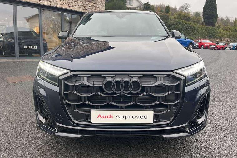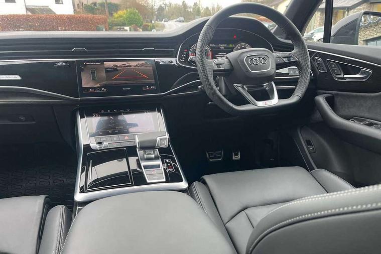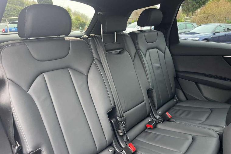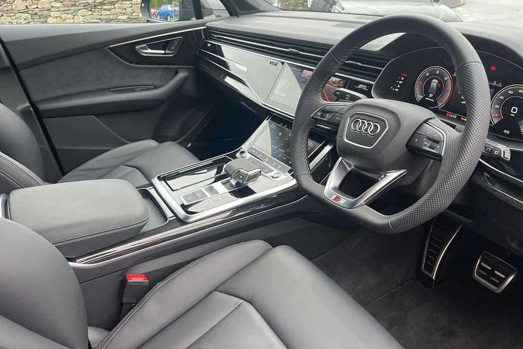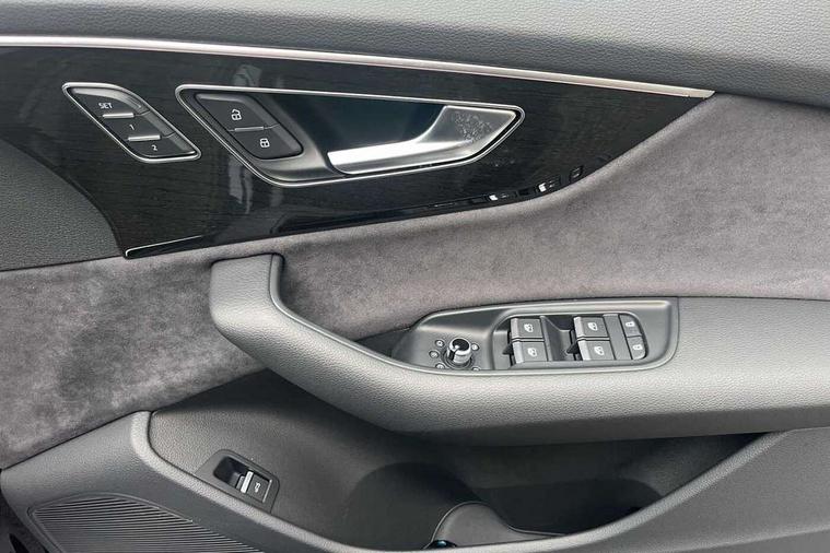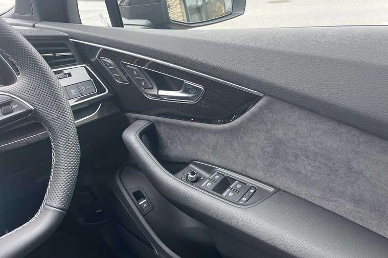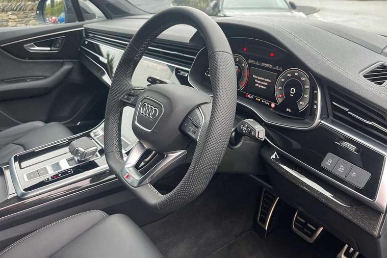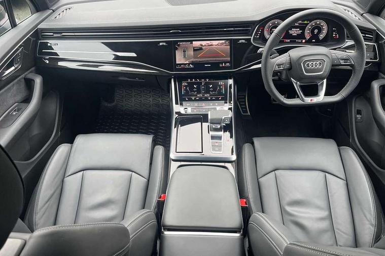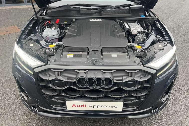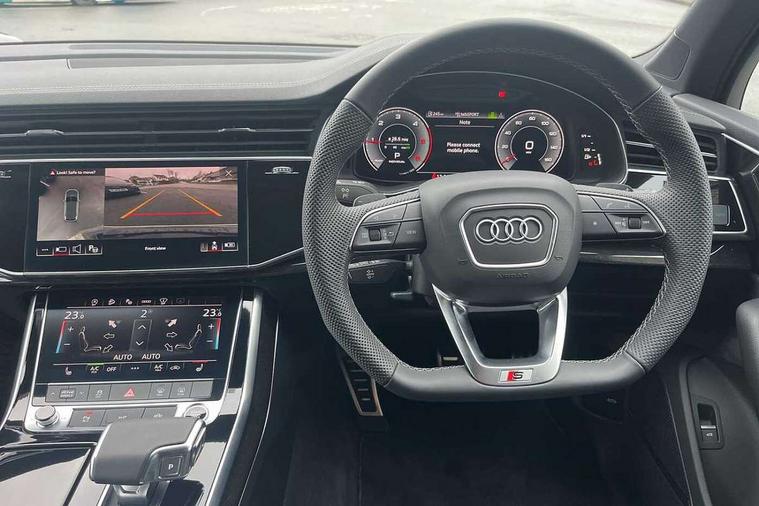 Audi connect safety and service (e-call), Audi connect with Amazon Alexa Integration, Audi drive select (Auto, Comfort, Dynamic, Efficiency, Individual, Off-road and All road), Audi phone box light with wireless charging, Audi virtual cockpit - 12.3" high-resolution LCD display with fully customisable instrument cluster, Bluetooth interface, Camera based traffic sign recognition, Electromechanical power steering, MMI navigation plus with MMI touch screens includes 10.1" and 8.6" screens with haptic feedback, Natural voice recognition, Operating buttons in Matte black, Parking system plus with 360 degree display (front, rear and side sensors) - acoustic and visual park assist system, Power operated tailgate, Rear view camera, Smartphone interface includes wireless Apple carplay/Android Auto, Start/stop system, 48V Mild hybrid technology, Adaptive air sports suspension, Quattro all wheel drive with self locking centre differential, Audi music interface - front 2 USB-C ports with charger and data functions, Audi sound system with 6 channel amplifier, 180 watt amplifying capacity and 10 loudspeakers including subwoofer, DAB digital radio module, Aluminium window trim, Audi Beam uses LEDs to project S emblem with red rhombus onto the ground when opening the side doors (front/rear), Auto dimming frameless rear view mirror, Black exhausts, Black roof rails, Electrically adj heated/folding + automatically dimming exterior mirrors with memory + automatic kerb side function for passenger side exterior mirror, Heat insulating glass in windshield, Integrated LED indications in door mirrors, LED 3rd brake light, LED daytime running lights, LED rear tail lights, Loading edge protection in stainless steel, Matrix LED headlights with dynamic front and rear indicators, Privacy glass - dark tinted rear and rear side windows from B-pillar backwards, Rear side wing doors, Rear wiper, 2 seat bench in 3rd row, 2 zone automatic climate control, 3 seat bench in 2nd row, 7 seat layout with ISOFIX points for the front passenger seat and rear passenger seat, Black carpets, Black cloth headlining, Comfort front centre armrest, Electric adjustable front seat with 4 way lumbar support, driver memory functionality, Folding rear seats, Front head restraints, Front/rear floor mats, Heated front seats, Illuminated door sill trims with S logo, ISOFIX child seat mounting for front passenger seat and 2 outer rear seats with top tether child seat mounting for all 3 rear seats, LED interior ambient lighting, Luggage compartment cover, Luggage compartment sill protection in stainless steel, Rear head restraints, Rear seat bench plus for the second row, with forwards/backwards sliding adjustment and backrest angle adjustment, Single front passenger seat, Stainless steel pedals, Sunvisors with illuminated vanity mirrors, Black styling pack plus - Q7, 3 point seatbelts on all rear seats, Audi pre sense basic, Audi pre sense front, Child locks on rear doors, Convenience key with safelock and gesture tailgate, Driver and front passenger, front side and curtain airbags, Electromechanical parking brake, Electronic Stabilisation Control (ESC) including ABS, ASR and EDL, Extended pedestrian protection measures, Hill hold assist, Seatbelt reminder, Tyre pressure loss indicator, Warning triangle and first aid kit, Anti theft alarm with tow away protection, Anti-theft wheel bolts and wheel loosening detection, Keyless Go, Remote central locking, Black dashboard, Polished oak trim with grey finish inlay, Tool kit, Tyre repair kit,