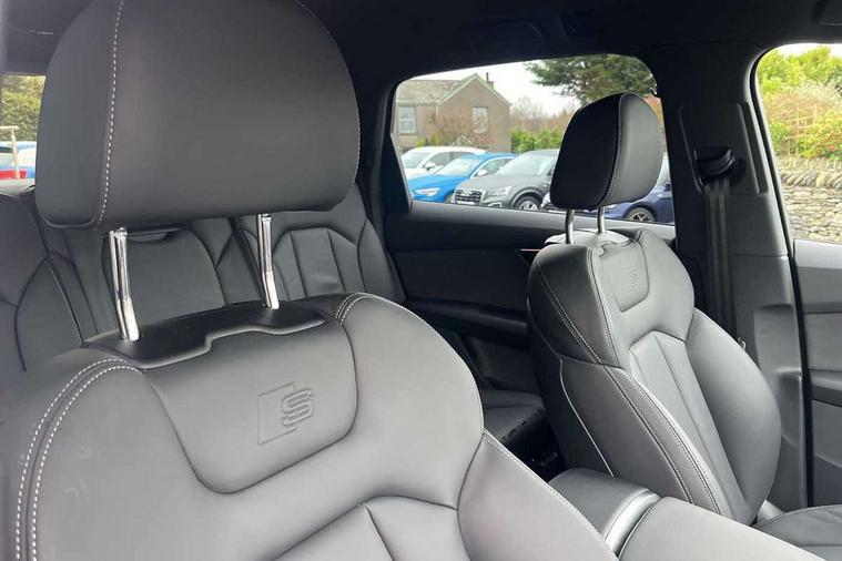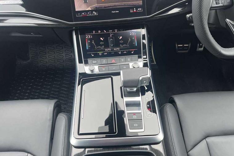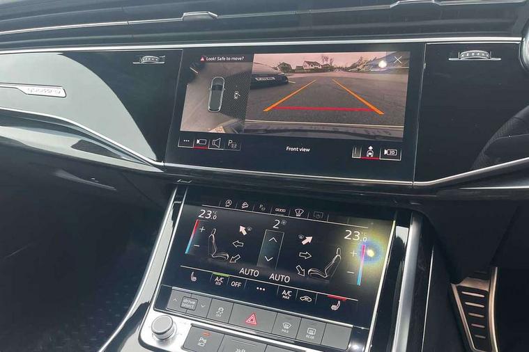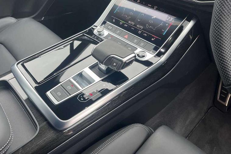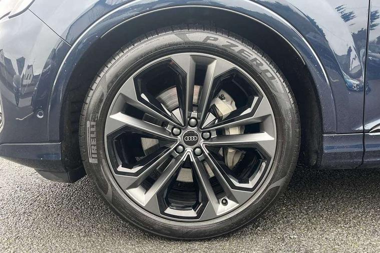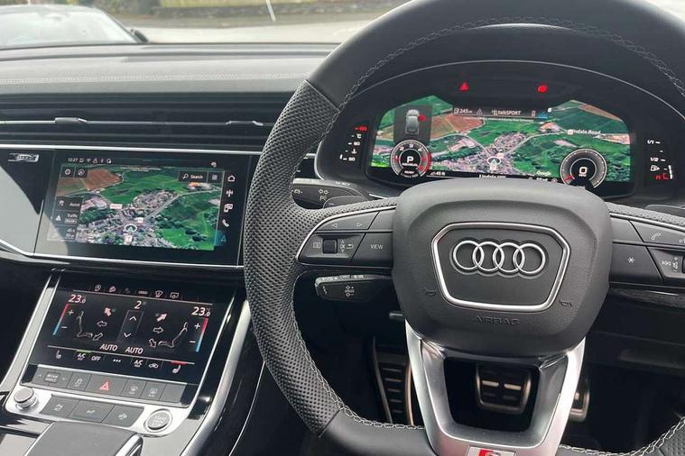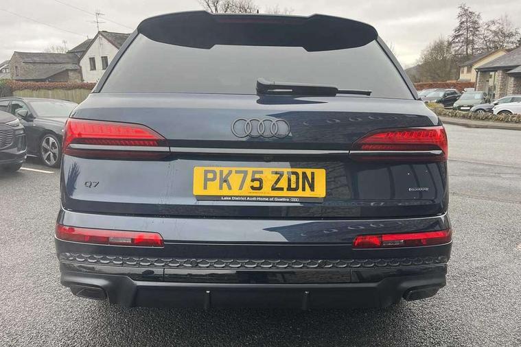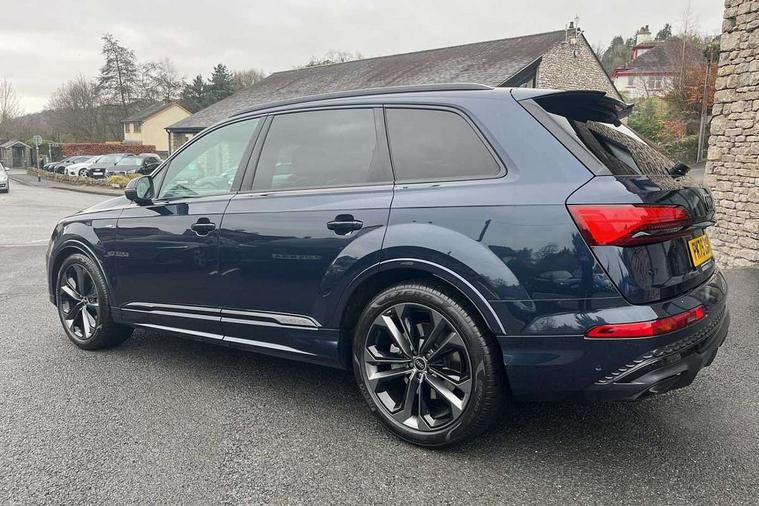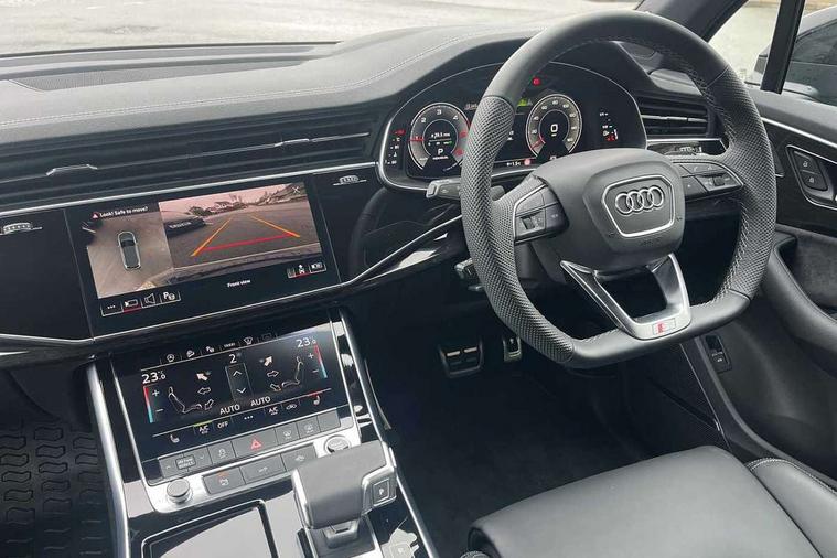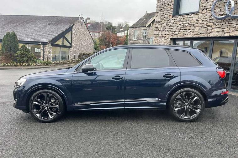 Audi connect safety and service (e-call), Audi connect with Amazon Alexa Integration, Audi drive select (Auto, Comfort, Dynamic, Efficiency, Individual, Off-road and All road), Audi phone box light with wireless charging, Audi virtual cockpit - 12.3" high-resolution LCD display with fully customisable instrument cluster, Bluetooth interface, Camera based traffic sign recognition, Electromechanical power steering, MMI navigation plus with MMI touch screens includes 10.1" and 8.6" screens with haptic feedback, Natural voice recognition, Operating buttons in Matte black, Parking system plus with 360 degree display (front, rear and side sensors) - acoustic and visual park assist system, Power operated tailgate, Rear view camera, Smartphone interface includes wireless Apple carplay/Android Auto, Start/stop system, 48V Mild hybrid technology, Adaptive air sports suspension, Quattro all wheel drive with self locking centre differential, Audi music interface - front 2 USB-C ports with charger and data functions, Audi sound system with 6 channel amplifier, 180 watt amplifying capacity and 10 loudspeakers including subwoofer, DAB digital radio module, Aluminium window trim, Audi Beam uses LEDs to project S emblem with red rhombus onto the ground when opening the side doors (front/rear), Auto dimming frameless rear view mirror, Black exhausts, Black roof rails, Electrically adj heated/folding + automatically dimming exterior mirrors with memory + automatic kerb side function for passenger side exterior mirror, Heat insulating glass in windshield, Integrated LED indications in door mirrors, LED 3rd brake light, LED daytime running lights, LED rear tail lights, Loading edge protection in stainless steel, Matrix LED headlights with dynamic front and rear indicators, Privacy glass - dark tinted rear and rear side windows from B-pillar backwards, Rear side wing doors, Rear wiper, 2 seat bench in 3rd row, 2 zone automatic climate control, 3 seat bench in 2nd row, 7 seat layout with ISOFIX points for the front passenger seat and rear passenger seat, Black carpets, Black cloth headlining, Comfort front centre armrest, Electric adjustable front seat with 4 way lumbar support, driver memory functionality, Folding rear seats, Front head restraints, Front/rear floor mats, Heated front seats, Illuminated door sill trims with S logo, ISOFIX child seat mounting for front passenger seat and 2 outer rear seats with top tether child seat mounting for all 3 rear seats, LED interior ambient lighting, Luggage compartment cover, Luggage compartment sill protection in stainless steel, Rear head restraints, Rear seat bench plus for the second row, with forwards/backwards sliding adjustment and backrest angle adjustment, Single front passenger seat, Stainless steel pedals, Sunvisors with illuminated vanity mirrors, Black styling pack plus - Q7, 3 point seatbelts on all rear seats, Audi pre sense basic, Audi pre sense front, Child locks on rear doors, Convenience key with safelock and gesture tailgate, Driver and front passenger, front side and curtain airbags, Electromechanical parking brake, Electronic Stabilisation Control (ESC) including ABS, ASR and EDL, Extended pedestrian protection measures, Hill hold assist, Seatbelt reminder, Tyre pressure loss indicator, Warning triangle and first aid kit, Anti theft alarm with tow away protection, Anti-theft wheel bolts and wheel loosening detection, Keyless Go, Remote central locking, Black dashboard, Polished oak trim with grey finish inlay, Tool kit, Tyre repair kit,