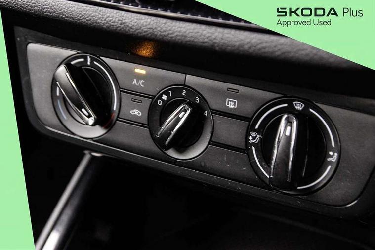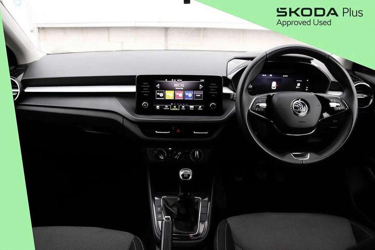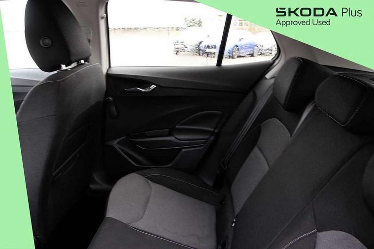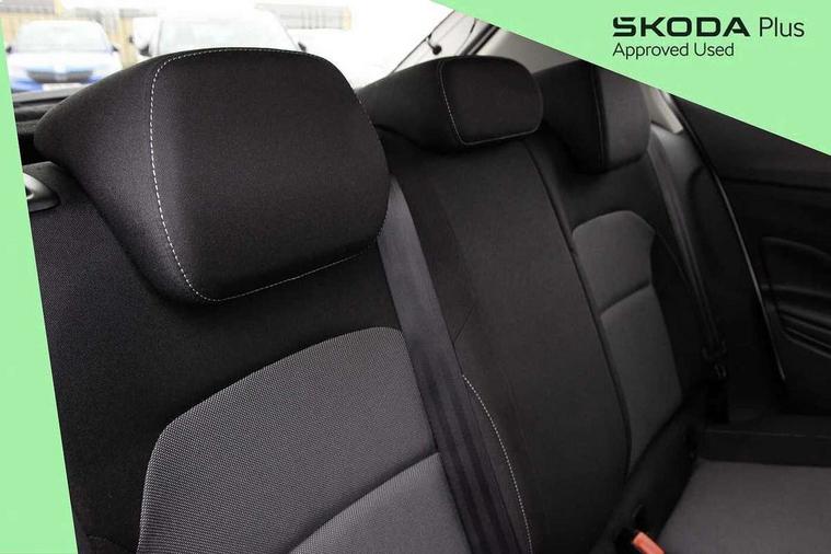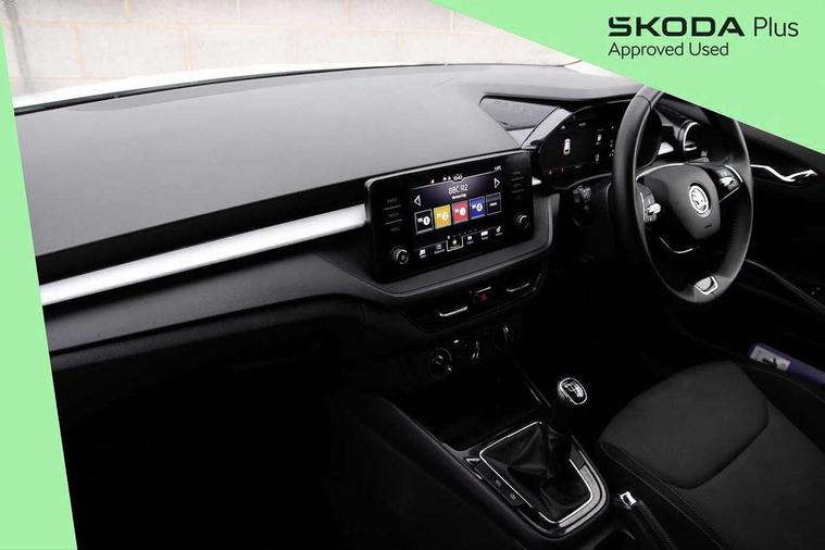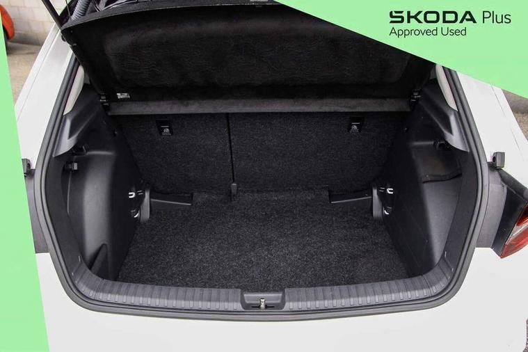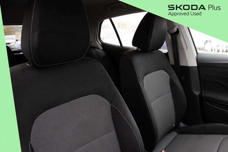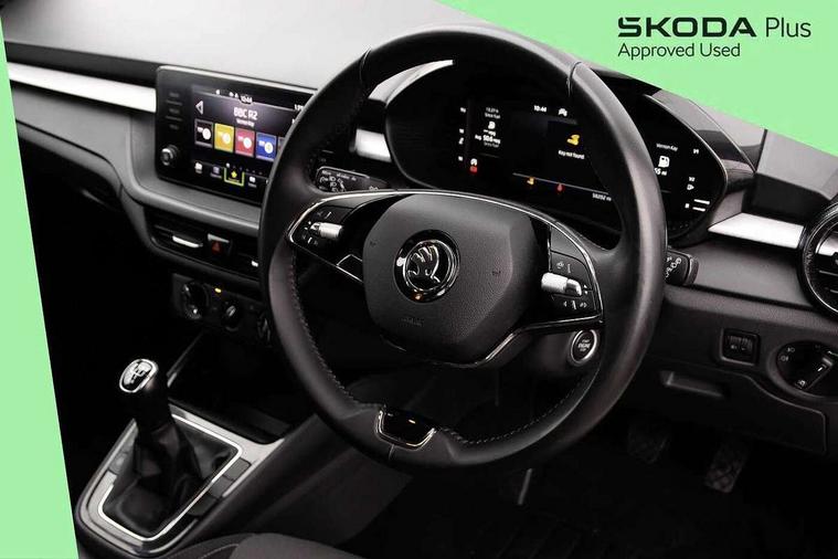 Bluetooth connection, Driver alert system - DAS, Electromechanical power steering, Exterior temperature gauge, Lane assist including road edge detection, Service interval indicator, Virtual cockpit with 10.25" colour display, 2x USB-C in the front (for data transmission and charging), 6 Speakers (4 in front and 2 in rear), Auxiliary socket for external MP3 player, Bolero radio with 8" colour display, DAB digital radio reception, Basic rear lights, Body coloured bumpers, Dimming rear view mirror with black frame, Door mirror integrated indicators, Electrically adjustable and heated door mirrors, Electrically adjustable front windows with function auto up/down, Front window wiper intermittent control, Headlight range control - Automatic, Ice scraper in fuel cap, LED daytime running lights with coming and leaving home feature, Mechanical adjustable rear windows, Privacy glass, Rear LED fog light, Rear side wing doors, Rear window wiper with washing nozzles, Roof mounted spoiler, SKODA tailgate lettering in chrome, Third brake light, 3 rear headrests, Backrest split and folding, Central console with fixed cup holder and storage box, Chrome handbrake release button, Fabric upholstery, Gearshift knob/handle in leather, Grain satin black interior door handles, Hand brake lever handle in leather, Height adjustable front headrests, Height adjustable steering wheel, ISOFIX and TopTether anchorage points to the outer rear seats, ISOFIX and TopTether on the front passenger seat, Luggage compartment lighting, Pollen filter, Rear seat bench unsplit, Single front passenger seat, Storm grey headlining, Sun visors with mirror and airbag label on passenger side, Ticket holder, Umbrella in drivers door, 3-point height adjustable front seats belts with pretensioner and force limiter, Automatic warning lights in case of crash, Driver and passengers airbag with switch off function, e-Call+, ESC including ABS, MSR, ASR, EDS, HBA and XDS, Front and rear seat belt warning, FRONT ASSIST (AEB City and AEB Inter Urban), Front side airbags, Head airbags, One tone horn, Pedestrian protection, Three rear 3-points safety seat belts with pretensioner and force limiter including stop function for outer rear seat belts, Tyre pressure monitoring system, Anti-theft alarm system including immobiliser, interior monitoring, backup horn, and towing protection, Anodized cross line upper decorative trim, Colour Edition air vents, Grain satin black central console cover, Grain satin black lower decorative trim, Satin black door and side trim panel in front, Anti-theft wheel bolts protection, Super-low rolling resistance tyres,