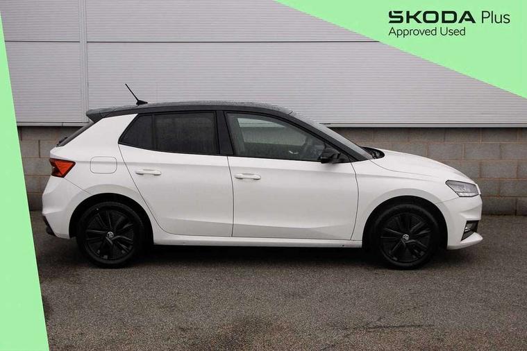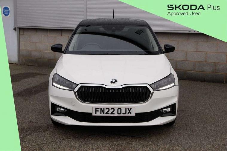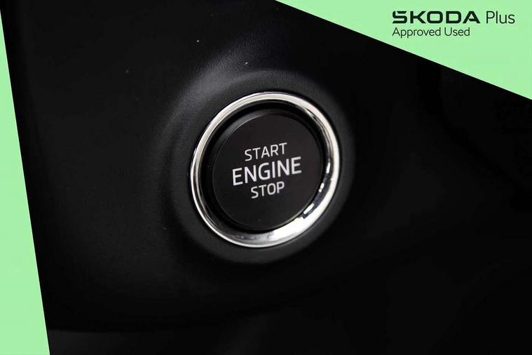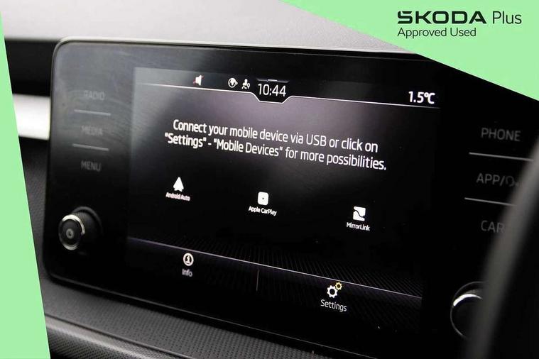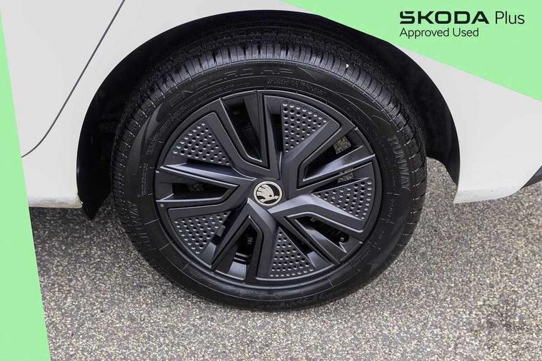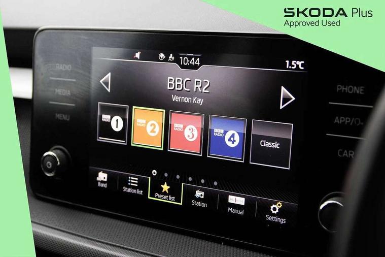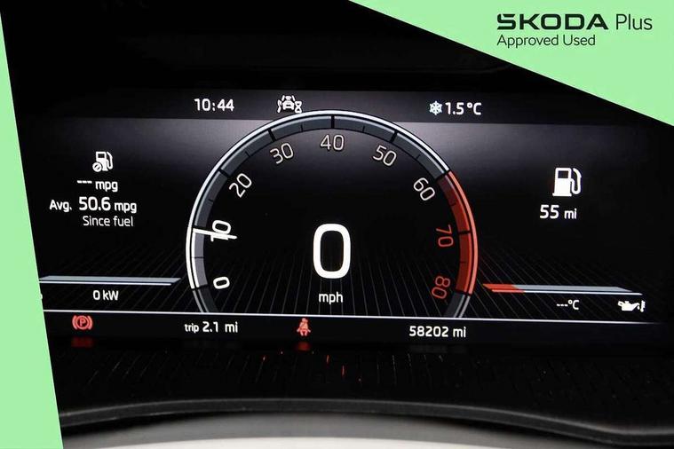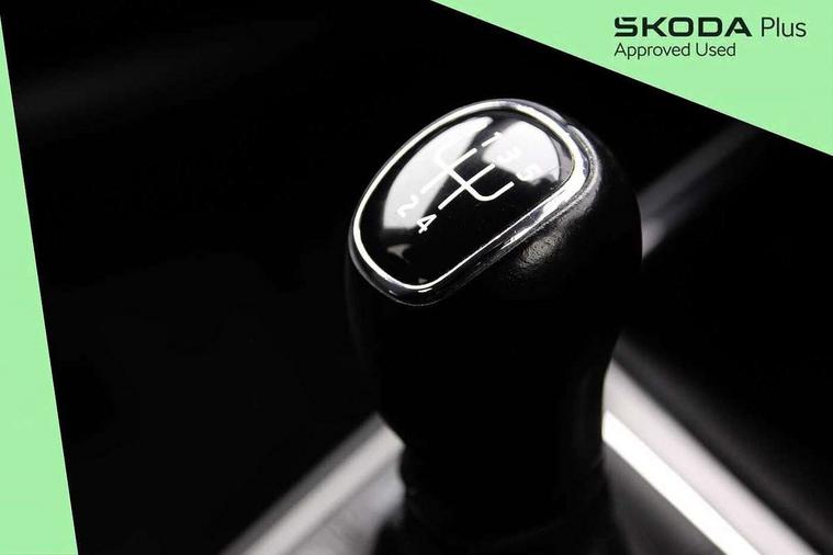 Bluetooth connection, Driver alert system - DAS, Electromechanical power steering, Exterior temperature gauge, Lane assist including road edge detection, Service interval indicator, Virtual cockpit with 10.25" colour display, 2x USB-C in the front (for data transmission and charging), 6 Speakers (4 in front and 2 in rear), Auxiliary socket for external MP3 player, Bolero radio with 8" colour display, DAB digital radio reception, Basic rear lights, Body coloured bumpers, Dimming rear view mirror with black frame, Door mirror integrated indicators, Electrically adjustable and heated door mirrors, Electrically adjustable front windows with function auto up/down, Front window wiper intermittent control, Headlight range control - Automatic, Ice scraper in fuel cap, LED daytime running lights with coming and leaving home feature, Mechanical adjustable rear windows, Privacy glass, Rear LED fog light, Rear side wing doors, Rear window wiper with washing nozzles, Roof mounted spoiler, SKODA tailgate lettering in chrome, Third brake light, 3 rear headrests, Backrest split and folding, Central console with fixed cup holder and storage box, Chrome handbrake release button, Fabric upholstery, Gearshift knob/handle in leather, Grain satin black interior door handles, Hand brake lever handle in leather, Height adjustable front headrests, Height adjustable steering wheel, ISOFIX and TopTether anchorage points to the outer rear seats, ISOFIX and TopTether on the front passenger seat, Luggage compartment lighting, Pollen filter, Rear seat bench unsplit, Single front passenger seat, Storm grey headlining, Sun visors with mirror and airbag label on passenger side, Ticket holder, Umbrella in drivers door, 3-point height adjustable front seats belts with pretensioner and force limiter, Automatic warning lights in case of crash, Driver and passengers airbag with switch off function, e-Call+, ESC including ABS, MSR, ASR, EDS, HBA and XDS, Front and rear seat belt warning, FRONT ASSIST (AEB City and AEB Inter Urban), Front side airbags, Head airbags, One tone horn, Pedestrian protection, Three rear 3-points safety seat belts with pretensioner and force limiter including stop function for outer rear seat belts, Tyre pressure monitoring system, Anti-theft alarm system including immobiliser, interior monitoring, backup horn, and towing protection, Anodized cross line upper decorative trim, Colour Edition air vents, Grain satin black central console cover, Grain satin black lower decorative trim, Satin black door and side trim panel in front, Anti-theft wheel bolts protection, Super-low rolling resistance tyres,