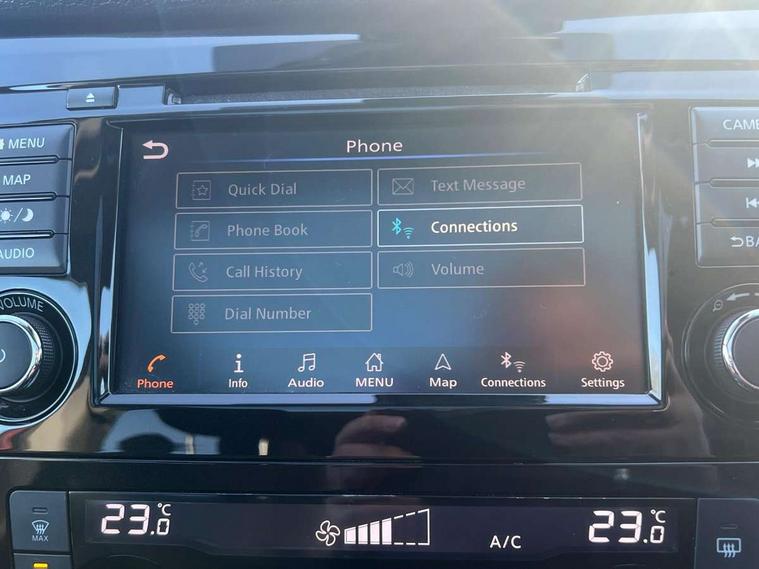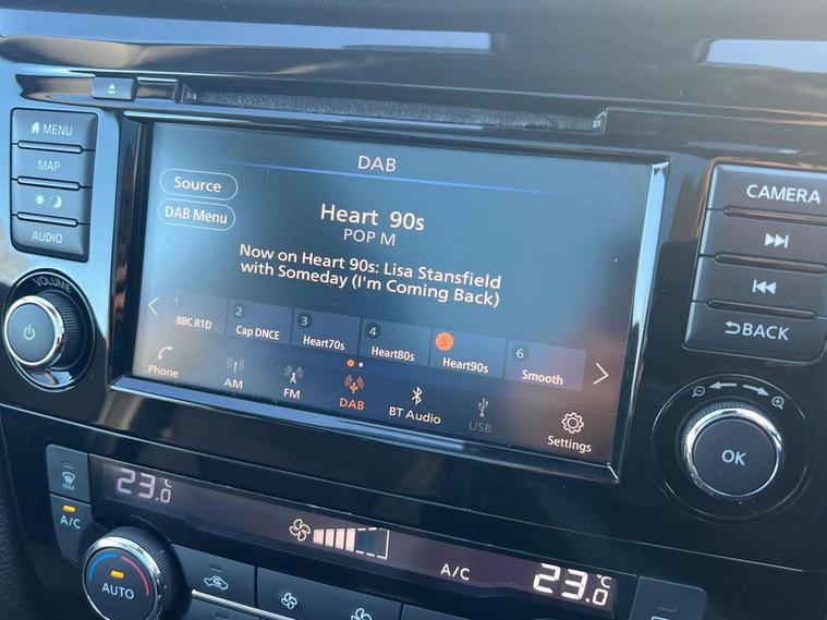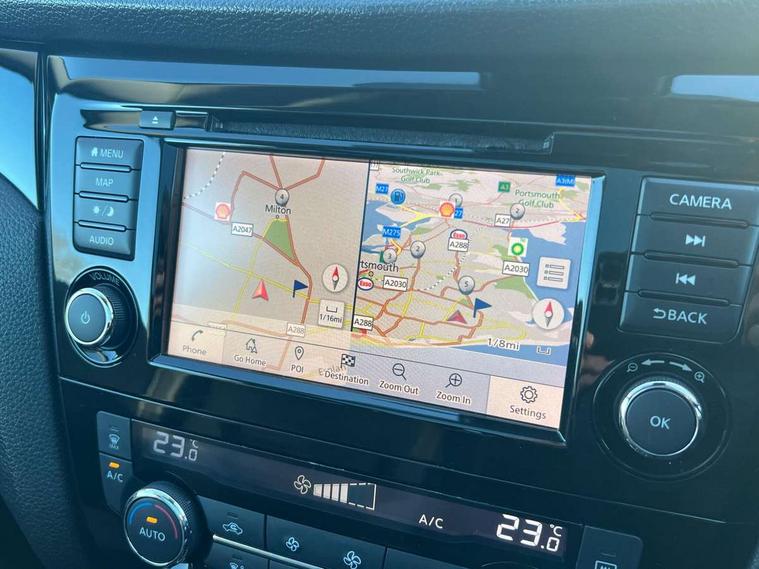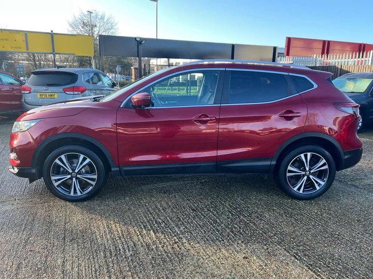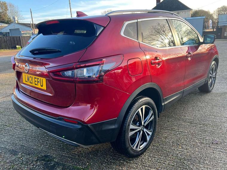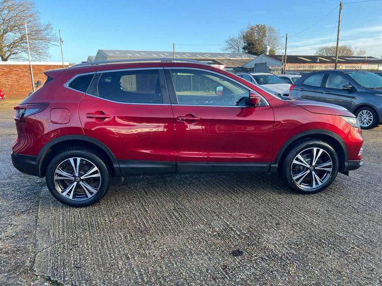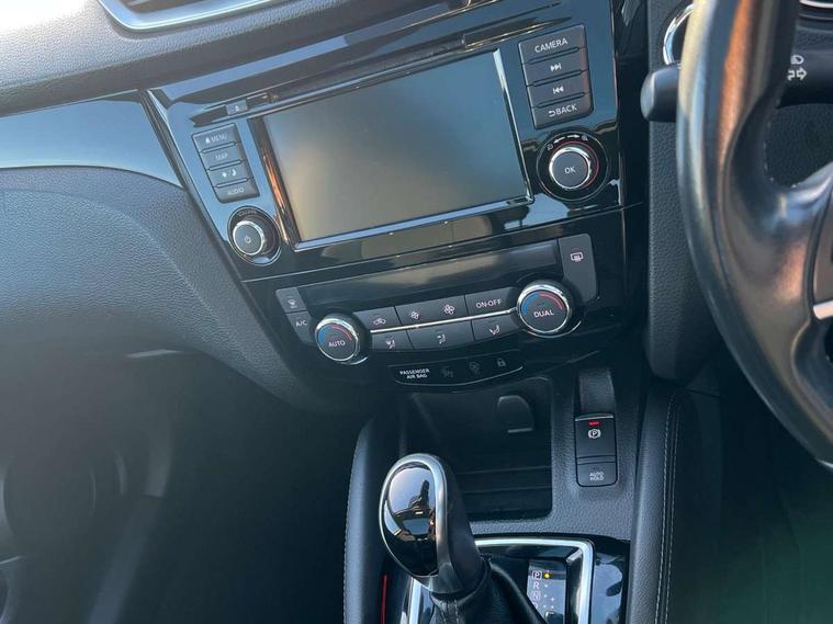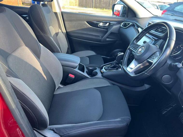 360 degree Intelligent around view monitor, Advanced drive assist display 5'' TFT coloured screen, Apple car play/Android Auto, Bluetooth connectivity, Cruise control + speed limiter, Electric speed sensitive power steering, Front parking sensors, Idle stop/start system, Intelligent park assist, Lane departure warning system, Nissan connect evo 7" touchscreen navigation and entertainment system, Normal or sport selectable steering, Outside temperature sensor, Premium Tomtom connected services, Push button starter, Rear parking sensors, Service interval indicator, Smartphone integration, Traffic sign recognition, Trip computer, Voice control system, Nissan chassis control (intelligent ride control, intelligent trace control, intelligent engine brake), 6 speakers, AM/FM radio, CD audio system, Aux-in socket, DAB Digital radio, Steering wheel mounted audio controls, USB port, Anti dazzle rear view mirror, Auto wipers, Body colour bumpers, Body coloured door handles, Body coloured door mirrors, Chrome window surround, Daytime running lights dip function when turn signal applied, Electric folding door mirrors, Electric front and rear windows with one touch illuminated window controls, Electrically adjustable door mirrors, Front fog lights, Halogen headlights, Heated door mirrors, High beam assist, Intelligent auto headlights, LED indicators in door mirrors, Matt silver roof rails, Privacy glass, Rear roof spoiler, Rear wiper with reverse link, Shark fin antenna, Signature LED daytime running lights, Silver rear styling plate, Underbody vortex generators, 2 X front 12v power sockets, 3 height adjustable rear headrests, 60/40 split folding rear seat, Ambient interior lighting, Ambient lighting around centre console, Bi-colour cloth upholstery, Boot lighting, Centre console storage box/armrest, Chrome interior door handles, Driver's seat manual height adjust, Dual zone climate control, Front and rear door pockets with bottle holders, Front and rear seat belt pre-tensioners with load limiters, Height adjustable front headrests, ISOFIX restraints on outer rear seats x2, Leather D shaped steering wheel, Leather gear lever, Leather knee pad, Luggage board system, Manual height adjustable passenger seat, Manual lumbar support on driver seat, Manual lumbar support on passenger seat, Monoform front sport seats with plastic backboard, Parcel shelf stow function under luggage board, Pollen filter, Rear armrest with 2 cupholders, Synthetic leather wrapped door handle with contrasting stitching, Tilt/telescopic adjustable steering wheel, Velour floor mats, Glass roof pack - Qashqai, 6 airbags - Driver, front passenger, curtain and side airbags, ABS, ESP, EBD and brake assist, Auto hold function, Child locks on rear doors, Electronic parking brake, Front and rear seat belt warning, Height adjustable front seatbelts, Hill start assist, Intelligent emergency braking with pedestrian recognition, Manual passenger airbag deactivation function, Three 3 point rear seatbelts, Tyre pressure monitoring system, Anti-theft immobiliser, Intelligent Key, Remote central locking, Thatcham Cat.1 alarm, Carbon graphite dash trim, 18" Two tone alloy wheels,