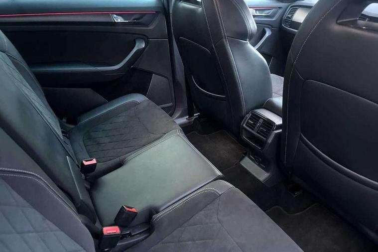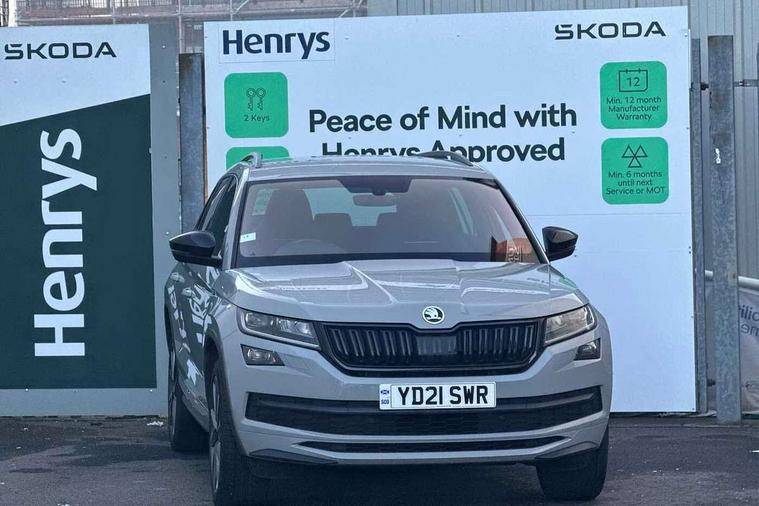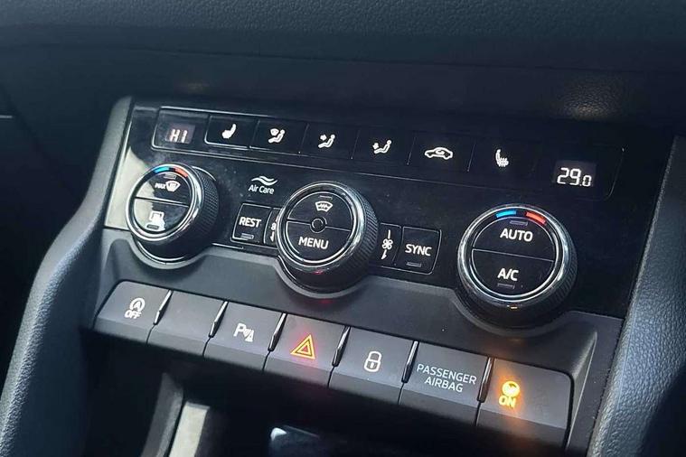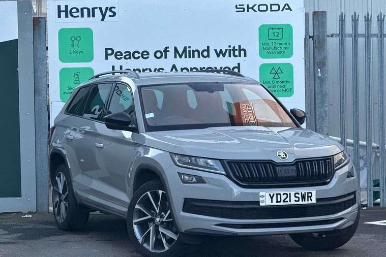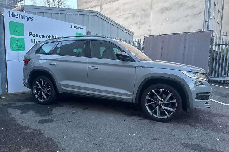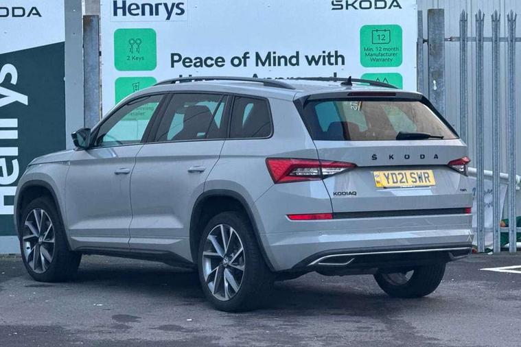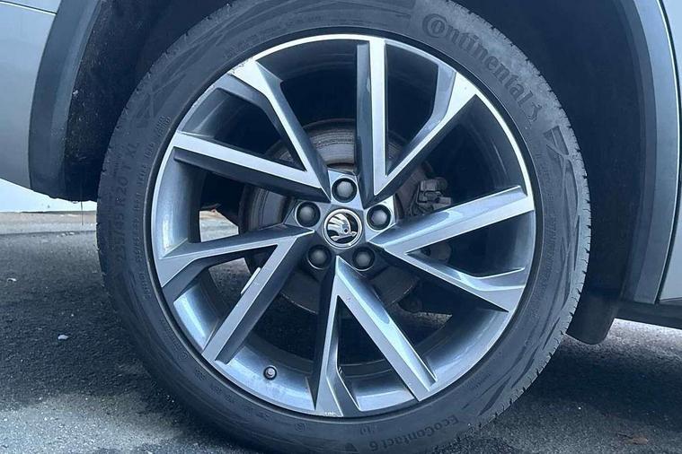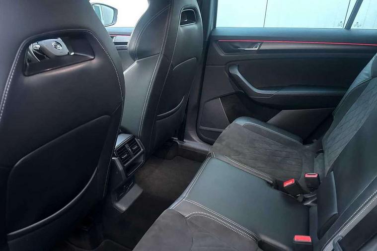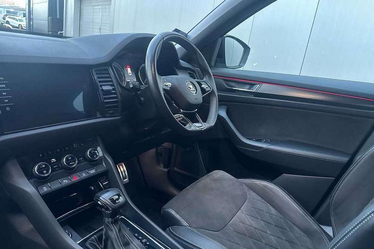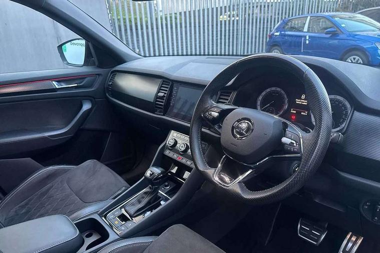 Bluetooth system, Columbus satellite navigation with 9.2" touch screen and integrated Wi-Fi + WLAN and web radio, Digital voice enhancement, ECO Stop/start function, Exterior temperature indicator, Map care, Progressive steering, Smartlink wireless for apple carplay and wired for android auto, Speed limiter, Sports dials, Tailgate unlocking from outside, USB C Port x 2 in front centre console, DAB Digital radio, Aero front windscreen wipers with intermittent function, Aero rear window wiper, Auto dimming rear view mirror, Automatic activation of hazard warning lights, Black electric window control buttons, Black roof rails and door mirrors with radiator grille and window surrounds, Black wheel arch surrounds, Body colour bumpers, Body colour door handles, Chrome exhaust tailpipe, Electric front and rear windows, Electrically adjustable/heated/foldable and auto dimming door mirrors with memory function, Front door steps with SportLine logo, Full LED Headlights with adaptive front light system and LED daytime running lights, Headlight washers, Heated rear window, LED front fog lights with static cornering light function, LED rear fog light, LED third brake light in rear spoiler, Light assistant (coming home/tunnel light), Rain and light sensors, Rear diffuser, Rear spoiler, Safety reflectors on front and rear doors, Sportline badge on front fender, Sports front and rear bumpers, Sunset privacy glass, Tailgate lettering in Black, Without engine designation, 12V socket in boot, 2 rails with 2 hooks including 4 hooks for net programme, 4 foldable roof handles with rear coat hooks, 4 lashing points on luggage floor, 60:40 foldable rear seat with sliding adjustment and backrest angle adjustment, Alcantara door panels, Aluminium pedals, Black roof headlining, Bottle holders in door panel in the 1.5 litre front and 1 litre rear, Cargo storage compartments, Centre console with open storage box, cup holder and 12V socket, Chrome headlight control button, Chrome interior door handles, Coat hooks on B pillar, Covered storage compartment on driver side, Front and rear door armrest with black adductor trim, Front and rear height adjustable headrests, Front centre armrest with storage compartment, cup holder and 12V socket, Front courtesy lights, Gear shift lever with chrome frame and black gloss insert, Illuminated and cooled glovebox, Illuminated luggage compartment, Isofix child seat fittings in outer rear seats with top tether, Manually adjustable steering column, Microsuede/leather upholstery with front sports seats, Net programme in boot (1x horizontal Net, 2x vertical Nets), Overhead glasses storage compartment, Paddles on steering wheel for DSG gearbox, Pollen filter, Rear centre armrest with cupholders, Roll up luggage compartment cover with intermediate position, Small Bags on the inner sides of the front backrests, Storage compartment in lower middle instrument panel with closing, Three rear height adjustable headrests, Ticket holder on A Pillar, Umbrella in door panel, LED Interior Light pack - Kodiaq Scout/Sport Line/VRS/Laurin + Klement, Auto door release and activation of warning lights in the event of an accident, Driver and passenger airbags, Electronic parking brake with hill hold control, Emergency rear braking signal, ESC (incl. ABS+MSR+ASR+EDS+HBA+DSR+RBS+MKB), Front and rear three point safety belt on all seats, Front assist includes AEB city/urban, Front passenger airbag deactivation switch, Front side airbags, Fuel cut off safety device, Head and knee airbags, Rear disc brakes, Safety vest holder in door, Seat belt reminder for all seats, Two tone horn, Tyre pressure monitor, Warning lights in front doors, Alarm with interior monitoring and tilt sensor with safe function, Immobiliser, Keyless entry and start system (KESSY), Remote central locking, Black air vent surround, Carbon finish dashboard and door inserts, 20" Vega Anthracite alloy wheels with anti-theft wheel bolts,