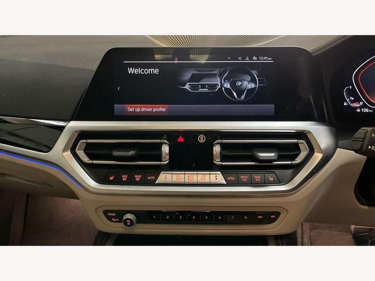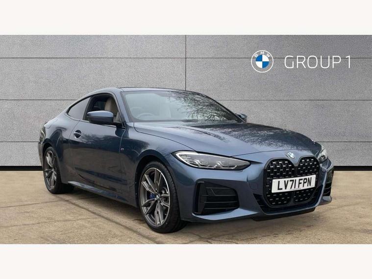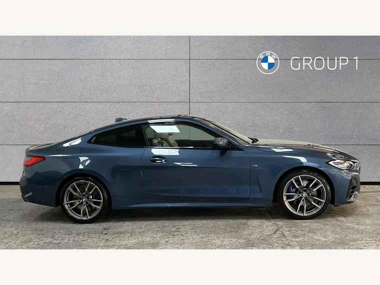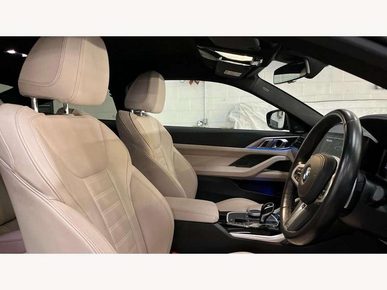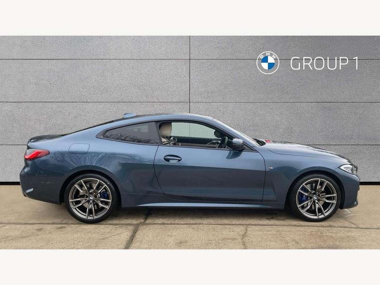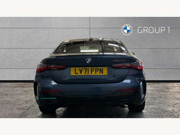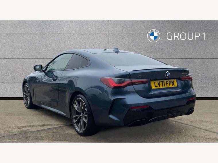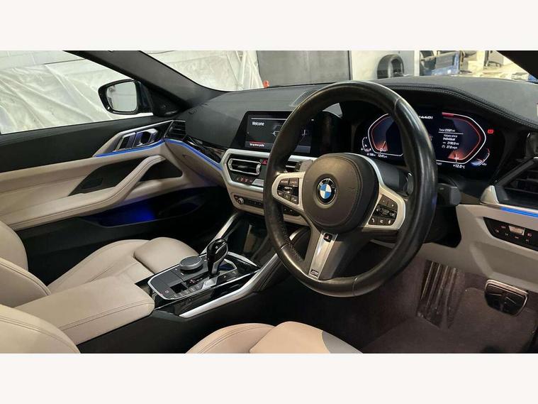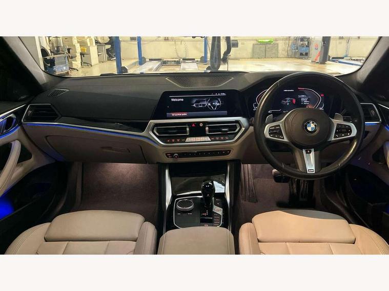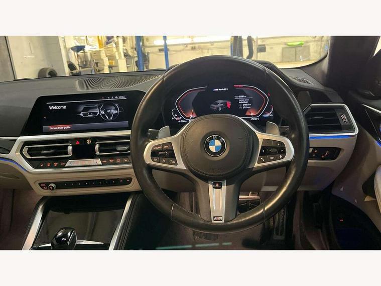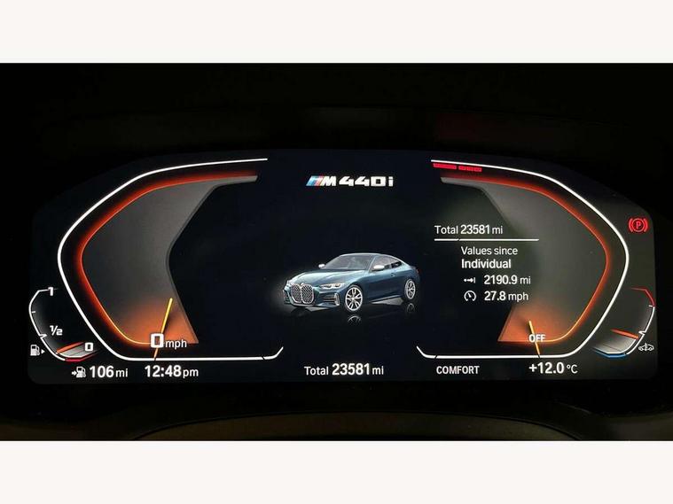 Active guard plus, Attentiveness assist, Auto start-stop, BMW ConnectedDrive online services, BMW Live Cockpit Professional Nav with 12.3" instrument display + 10.25" display, Intelligent Voice Assist, BMW OS 7, HDD, 2USB, 4G LTE connect, BMW service history, BMW Teleservices, Brake pad wear indicator in front and rear, Check Control warning system for monitoring of lights and door/luggage compartment open warning, Condition based service, Electric power steering with Servotronic steering optimised at all speed ranges, Gearshift time display in manual mode, iDrive controller on centre console, Instrument cluster with speedometer with mph readout, tachometer, fuel gauge and oil temperature gauge, Integrated owners handbook, Oil sensor for level and grade, warning by check control system, On board computer - average speed, fuel consumption, outside temp display with acoustic warning, clock/date, service interval, odometer/trip meter, Optimum shift indicator, Reverse Assistant functionality for BMW Live Cockpit Professional Nav, Touch control functionality for BMW Live Cockpit Professional Nav, Variable sport steering, 48V Mild hybrid technology, 8 speed automatic steptronic transmission with gearshift paddles, Adaptive M suspension, Balanced 50/50 weight distribution, Driving experience modes - Comfort, ECO PRO, Sport and Sport+ mode, Low centre of gravity, M Sport differential, Petrol Particulate Filter, Stroke dependent dampers, xDrive system permanent all-wheel drive variable torque distribution, DAB tuner, Electronic service booklet, 3rd brake light, Acoustic glazing, Automatic headlight beam throw control with load dependent regulating reaction, dynamic compensation of braking dive and acceleration squat, Automatic windscreen wipers and automatic headlight, Automatically dimming electrochromatic rear view mirror, BMW emblem on engine compartment lid and tailgate, Body colour fuel filler flap, Body colour roof fin, Brushed aluminium inserts in the front door sill finishers with BMW designation, Daytime running lights, Dynamic brake lights, Electric windows - front and rear, with open/close fingertip control, anti trap facility and comfort closing function all round, Exterior mirrors - electrically folding with anti-dazzle, Fading support, Front and rear bumper system, Front apron plastic in body colour, Green tinted heat protection glazing, Illuminated bow type door handles in body colour drivers side with door lock, Interior rear view electrochromatic mirror with automatic anti dazzle function, Licence plate panel integrated into front bumper and tailgate, Lightweight engineering, M designation on front side panels, left and right, M rear spoiler in high gloss black, One piece front bumper cover including towing eye cover in body colour, Preparation for high beam assistant, Rear boot, Side frame decorative moulding black matt, Sun protection glass, Twin exhaust tailpipes x2, Two part LED tailights in L-shape with components in smoked glass, brake light, LED turn indicator and rear fog light, Visible VIN plate, Welcome lights in interior and door handle area, Widened track and increased camber values for max transverse dynamics, agility and steering precision, Window recess cover black high gloss, Windscreen wipers with integrated washing jets, xDrive designation on left tailgate, 12V power socket in front centre console, 2 front cupholder in centre console with clamping elements and matt black inlay, 2 Rear seat headrests, 2 seat bench in second row, 3 spoke M sport leather multifunction steering wheel, 3 zone automatic air conditioning, 4 pieces lashing eyelets in luggage compartment, 40:20:40 split folding rear seat and rear centre armrest with two cupholders, Ambient lighting with welcome carpet light, Anthracite headlining, Armrest integrated in front and rear door trim + front centre console armrest, Four grab handles integrated in roof lining, Front and rear door exit lighting (left / right), Front and rear door pockets, Front and rear footwell lights, Front and rear reading lights, Front headrests, Front passenger seat, Heated driver and front passenger seats, Height adjustable mechanically and infinitely variable steering column, Illuminated armrest storage compartment, Illuminated glove compartment with separate small compartment, Luggage compartment light, Make-up mirror lights, Storage compartment in rear centre console, Sunvisors with vanity mirrors and ticket pocket, Toolkit located in luggage compartment, Velour front floor mats, Connected professional package - 4 Series, M sport exterior styling pack - 4 Series M440i, 2 x 3-point rear seat belts, Battery safety cut-off, BMW emergency call, Brake energy regeneration, Braking pre-tensioning, Child seat ISOFIX attachment for the two outer rear seats, Coasting in idle in ECO PRO mode, Cornering brake control (CBC), Crash sensor activating of airbags, Unlocking doors, hazard warning lights, fuel cut off, interior lighting+activation of safety battery terminal clamp, Driver and front passenger side airbags, integrated in the door side seat backrest bolsters for all seat variants, Driver/Front Passenger airbags, Dry braking, Dynamic brake control, Dynamic stability control + (DSC+) - Anti-lock Braking System (ABS) with brake assist and cornering brake control + Automatic Stability Control (ASC), Dynamic Traction Control - DTC, Electromechanical parking brake including automatic hold function and automatic release of the parking brake when pulling away, Electronic differential lock control (EDLC), Front and rear ventilated brake disc, Front passenger manual airbag deactivation, Head airbags for all 4 outer seats, Hill start assistant, M Sport seatbelts, Seat belt security check for driver and front passenger, Seat belt with belt stopper, pyrotechnic belt tensioners and belt force limiters, Side impact protection, Tyre pressure monitoring with three level warning strategy, Warning triangle and first aid kit, Alarm system (Thatch