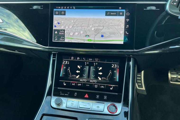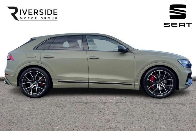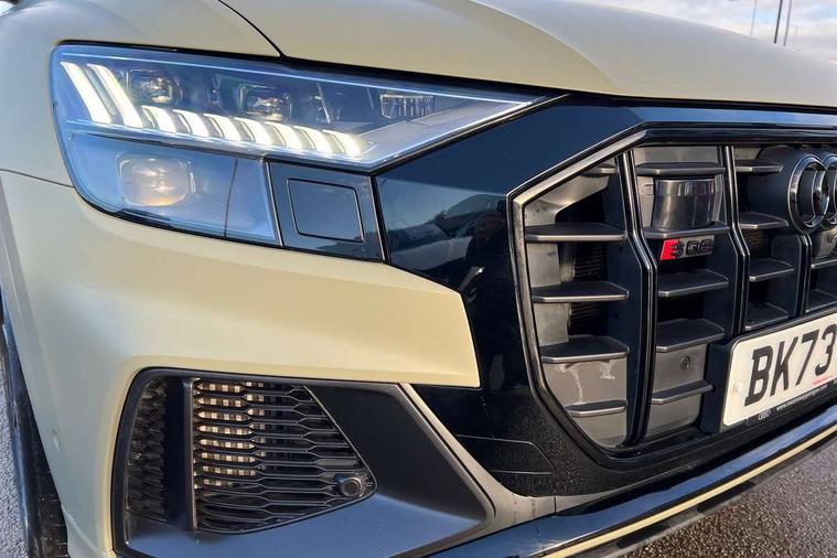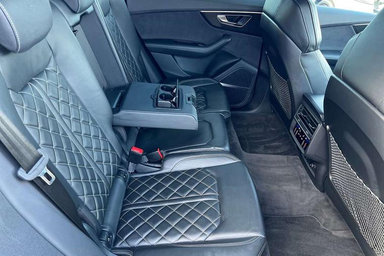 10.1" and 8.6" Dual colour touchscreens, All wheel steering, Audi connect safety and service (e-call), Audi connect with Amazon Alexa Integration, Audi drive select, Audi parking system plus includes 360 degree display with front and rear sensors, Audi smartphone interface includes wireless Apple carplay/Android Auto, Audi virtual cockpit - 12.3" high resolution LCD display with fully customisable instrument cluster, Automatic start/stop system, Electro-mechanical PAS, Low washer fluid indicator, MMI - Multi Media Interface control system, MMI navigation plus with MMI touch, Natural voice recognition, On board computer, Operating buttons in black, glass look with haptic feedback, Power operated tailgate, Rear view camera, Service interval indicator, 48V Mild hybrid technology, 85 litre fuel tank, Quattro all wheel drive with self locking centre differential, S specific Adaptive air suspension, Audi music interface with 2 USB ports with charge and data functions, Audi sound system with 6 channel amplifier, 180 watt amplifying capacity and 10 loudspeakers including subwoofer, Aux-in socket, DAB Digital radio, 3rd brake light, Acoustic windscreen, Audi Beam uses LEDs to project the Audi logo, Audi HD Matrix LED headlights with dynamic front and rear indicators, Auto dimming frameless rear view mirror, Body coloured bumpers, Coming/leaving home lighting function, Electric front+rear windows, Electrically folding auto dimming/adjustable/heated door mirrors with memory function, LED side indicators and kerb view function for passenger side, Gloss black finish for exterior Audi rings and SQ8 logo, Headlight washers, Heat insulating glass in windshield, LED signature daytime running lights, Platinum grey front spoiler lip and diffuser insert, Privacy glass - dark tinted rear and rear side windows from B-pillar backwards, Rain and light sensors, Rear side wing doors, Rear wiper, S specific dual brach chrome tailpipes on both the left and right, S specific front and rear bumpers, S specific side skirts in matt selenite silver, Side air inlet grilles in matt anthracite black, Trim and underbody protection in matt selenite silver, 3 bench rear seats in 2nd row, 4 zone deluxe automatic climate control, 4-way lumbar support for front seats, 40:20:40 split folding rear bench seat, Black cloth headlining, Comfort front centre armrest, Driver seat memory function, Electrically adjustable front seats, Front head restraints, Front/rear floor mats, Heated front seats, Illuminated door sill trims, ISOFIX child seat mounting for front passenger seat and 2 outer rear seats with top tether child seat mounting for all 3 rear seats, LED interior ambient lighting, Luggage compartment sill protection in stainless steel, Rear centre armrest with 2 cupholders, Rear headrests, Single front passenger seat, Stainless steel pedals, Sunvisors with illuminated vanity mirrors, Tool kit, Upper and lower interior elements in leather, leather door armrests, Valcona leather upholstery + super sports seats with S embossed logo, Anthracite black Styling Pack - Q8, 3 point seatbelts on all seats, Audi pre sense front, Child locks on rear doors, Driver and front passenger, front side and curtain airbags, Electromechanical parking brake, Electronic Stability Control (ESC) including ABS, ASR and EDL, Front passenger airbag deactivation, Hill descent control, Hill hold assist, Predictive pedestrian protection, Seatbelt monitoring, Traction control, Tyre pressure loss indicator, Warning triangle and first aid kit, Anti theft alarm with tow away protection, Anti-theft wheel bolts and wheel loosening detection, Immobiliser, Keyless go with remote central locking, Polished oak trim with grey finished, Tyre repair kit,