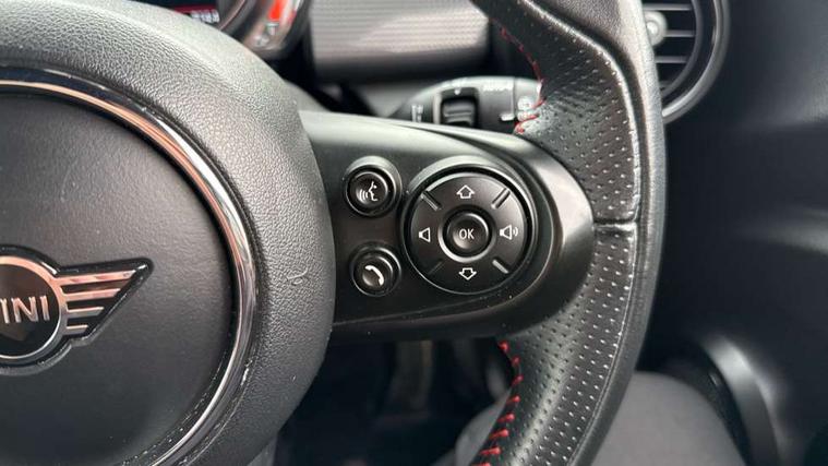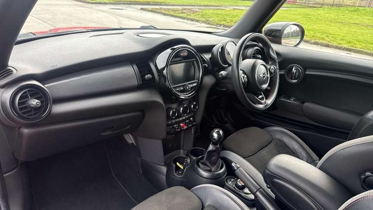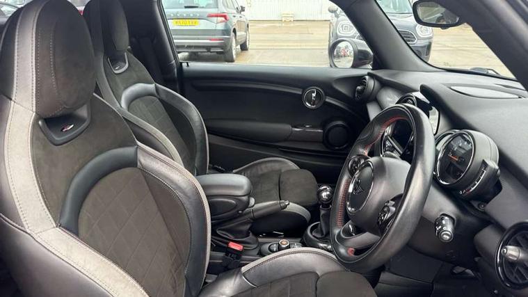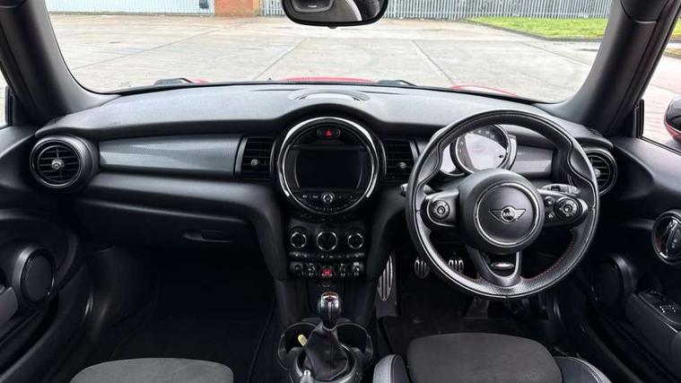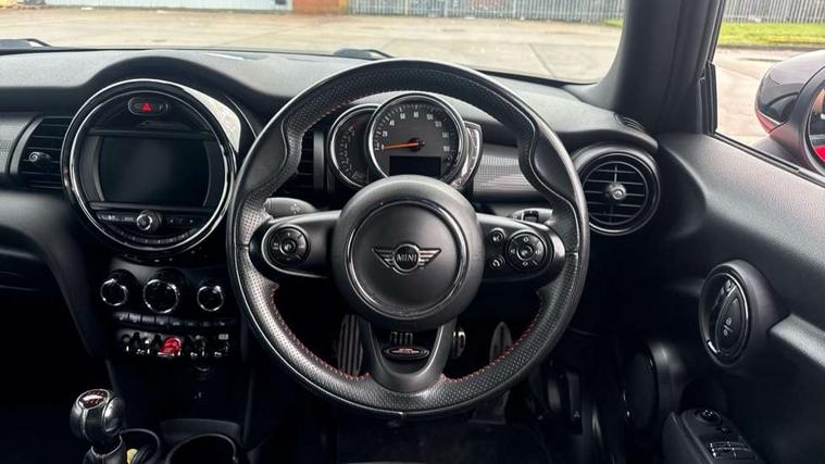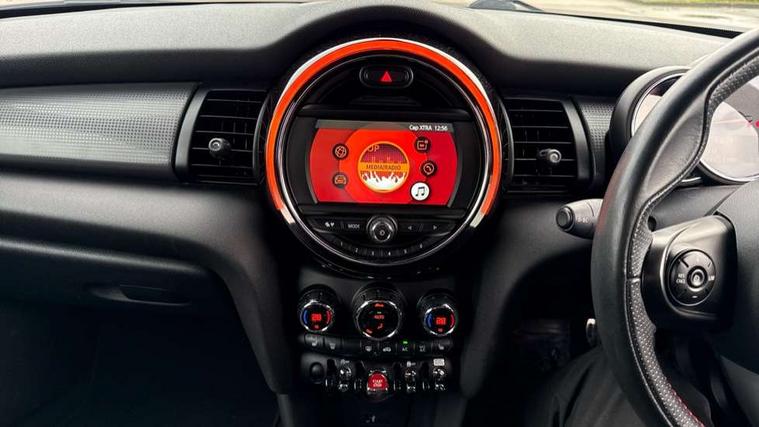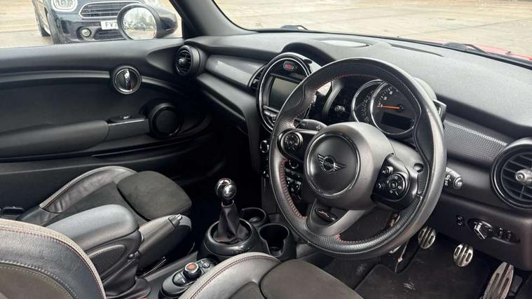 Automatic start/stop function with brake energy recuperation, Compatible mobile phone bluetooth with audio streaming, Electro-mechanical speed dependant steering assistance, Instrument cluster, Mini E-call, MINI TeleServices, On board computer, Service interval indicator, Double Vanos system, Fully variable valve control, High precision injection, Performance Control, 6.5" touchscreen with LED ring, FM tuner and DAB digital radio, Automatic headlight activation switch, Body colour fuel filler cap, Chrome border high gloss black slats radiator grille, Dynamic brake lights, Electric front+rear windows, Heated rear window, Heated windscreen washer jets, John Cooper Works - aerodynamic kit (front and rear apron, spoiler), front and rear sport bumpers and part-painted side sills with door sill finishers, John Cooper Works rear spoiler, LED headlight with closed ring and daytime driving lights, Left exhaust tailpipe with chrome finisher, Metal door sill strips with MINI imprint, Model logo Cooper on right of tailgate, Rain sensor window wipers, Rear fog lights, Rear LED lights with union jack design, Rear window wiper, Side scuttle panel with integrated indicator, Sun/heat protection glass, White indicator lenses, 12V Accessory socket in centre console, 4 lashing eyes in luggage compartment, 60/40 split folding rear seat, Anthracite headlining, Chrome interior highlights, Cupholders, Front and rear head restraints, Front and rear isofix with front passenger airbag deactivation, Glove compartment, Height and length steering column adjustment, Interior lighting with 12 basic colours selectable via toggle switch in roof, John Cooper Works leather steering wheel with contrasting stitching in Chilli Red with John Cooper Works logo, John Cooper Works Logo in seat, Leather gearshift lever and handbrake gaiters, LED reading lights, vanity mirror lights, front foot well light and spotlight on front seats, Manual air conditioning, Mechanical seat adjustment, driver seat height adjust, forward/back and front seats backrest, Mini logo projection on floor from drivers exterior mirror, Multifunction steering wheel, Storage compartments in doors, Sunvisors with vanity mirrors, 3 point seatbelts on all four seats, 6 Airbags - front, side, head and seat belt tensioners, Anti-lock braking system (ABS), DSC - Dynamic Stability Control, Front and rear disc brakes, Hill start assist, Single tone fanfare horn, Tyre pressure monitoring system, Alarm system with tilt sensor, monitoring doors, bonnet interior and tailgate, Electronic vehicle immobiliser, Start/stop toggle with keyless go, Tool kit,