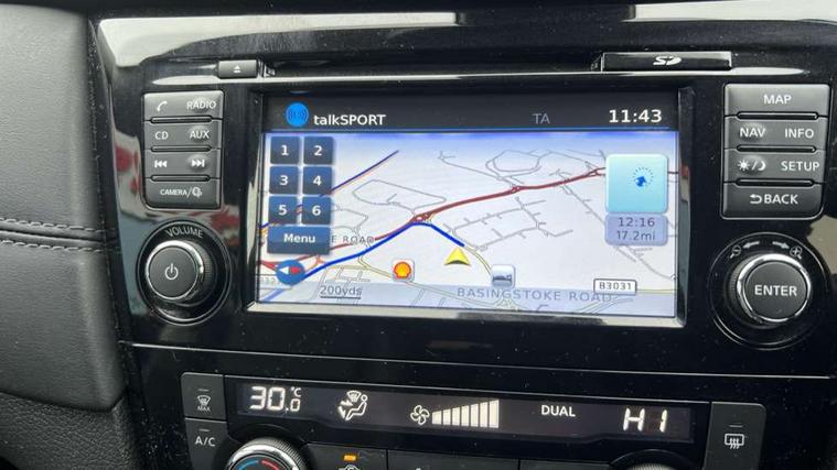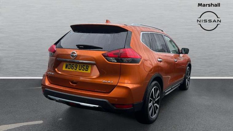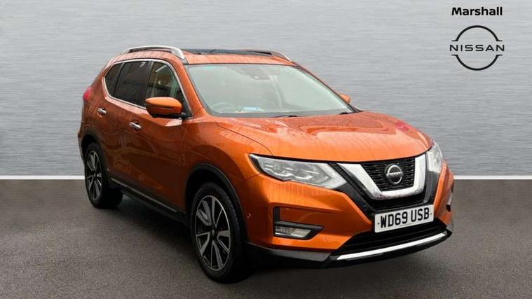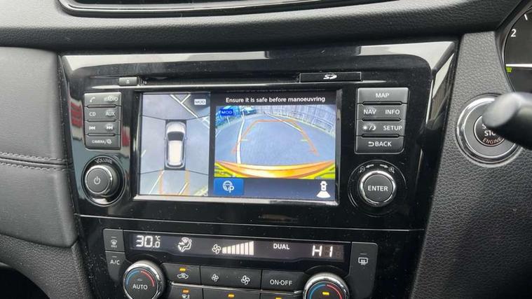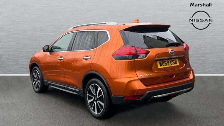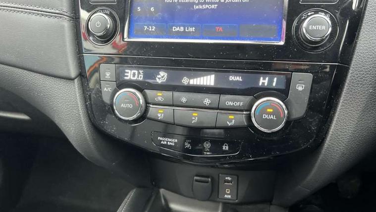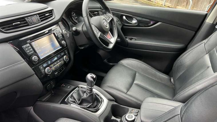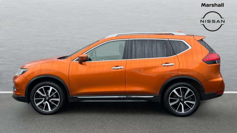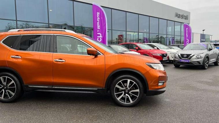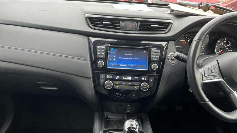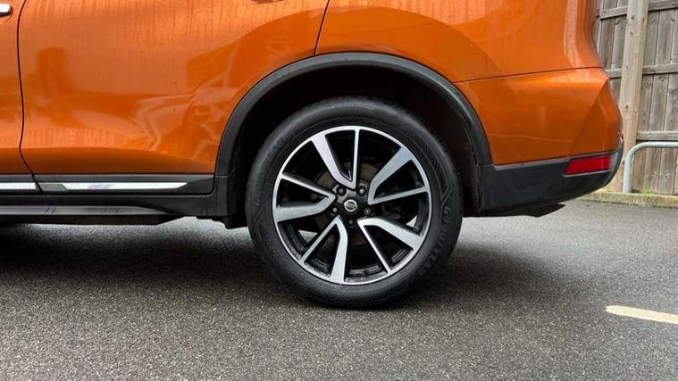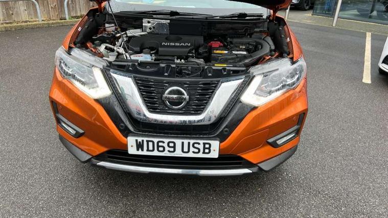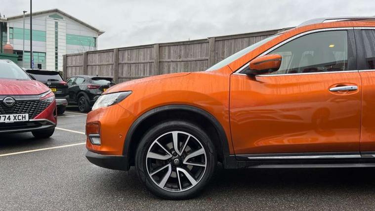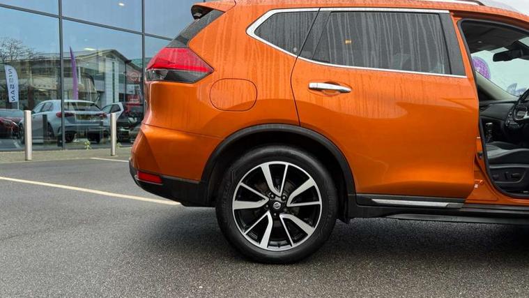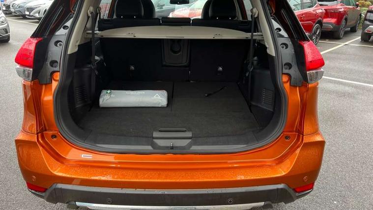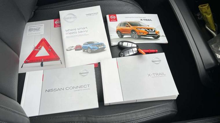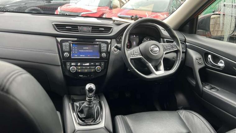 5" TFT driver information centre, Automatic tailgate opening, Blind spot monitoring, Bluetooth phone integration system, Driver attention alert system, Front and rear parking sensors, Intelligent around view monitor, Intelligent parking assist, Lane departure warning system, Moving object detection, Nissan connect evo 7" touchscreen navigation and entertainment system, PAS, Push button start, Stand still assist auto hold function, Traffic sign recognition, Trip computer, Nissan chassis control (intelligent ride control, intelligent trace control, intelligent engine brake), 6 speakers, DAB Digital radio, Radio/CD, Smartphone apps, Steering wheel mounted audio controls, USB/aux input socket, Adaptive front lighting system, Anti dazzle rear view mirror, Automatic headlights, Automatic rain sensing wipers, Black honeycomb front grille, Body colour door mirrors, Chrome door handles, Chrome side mouldings, Chrome window surround, Electric folding door mirrors, Electric heated door mirrors, Front and rear electric windows, Front fog lights, LED daytime running lights, LED Headlights, Panoramic sunroof with one touch shade, Rear privacy glass, Satin silver roof rails, Shark fin roof aerial, 3 rear headrests, 60/40 split rear bench seat, Centre console storage box/armrest, Configurable luggage board system, Driver's electric lumbar adjustment, Dual zone climate control, Electric adjustable front seats including height adjust, Front and rear door pockets with bottle holders, Front cupholders, Front/rear armrests, Heated front seats, Heated rear seats, Height adjustable front headrests, Individual rear reading lights, Isofix child seat attachment, Leather D shaped steering wheel, Leather steering wheel and gear knob, Pollen filter, Tilt/telescopic adjustable steering wheel, 3 point seatbelts on all seats, 6 airbags - Driver, front passenger, curtain and side airbags, ABS, Child locks on rear doors, EBD + Brake Assist, Electric parking brake, ESP + traction control, Intelligent emergency braking with pedestrian recognition, Seatbelt warning, Tyre pressure monitoring system, Immobiliser, Intelligent Key, Remote central locking, Thatcham Cat.1 alarm, Full size spare wheel,