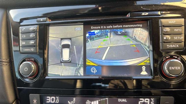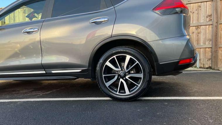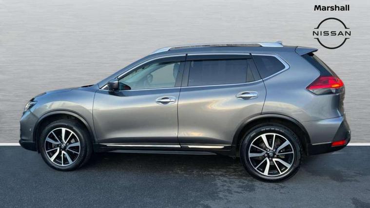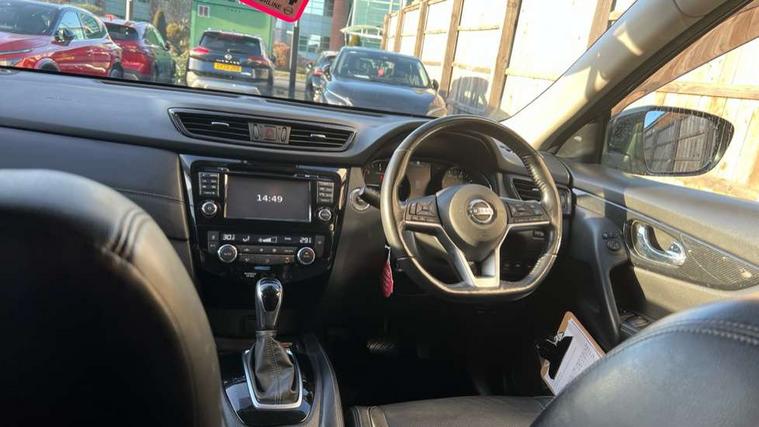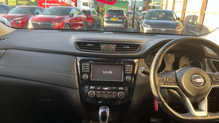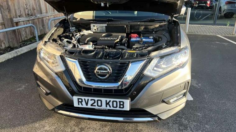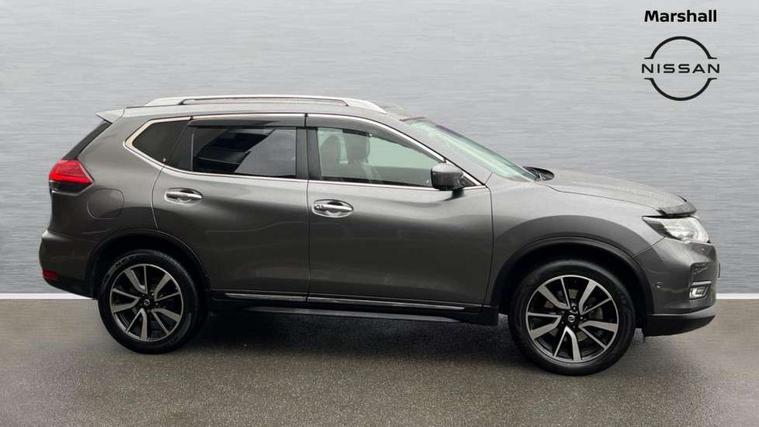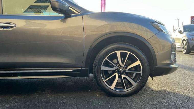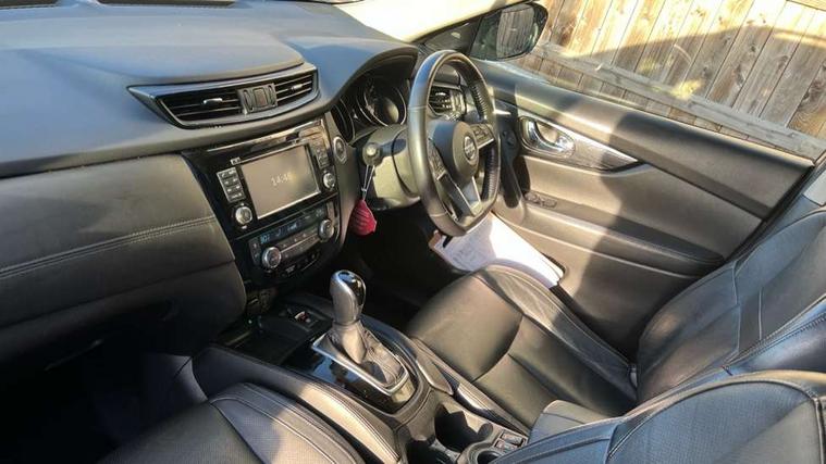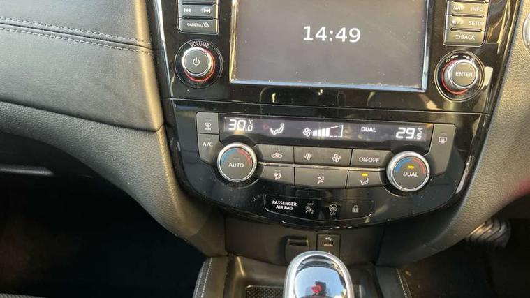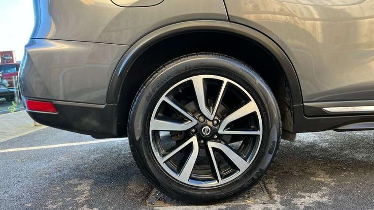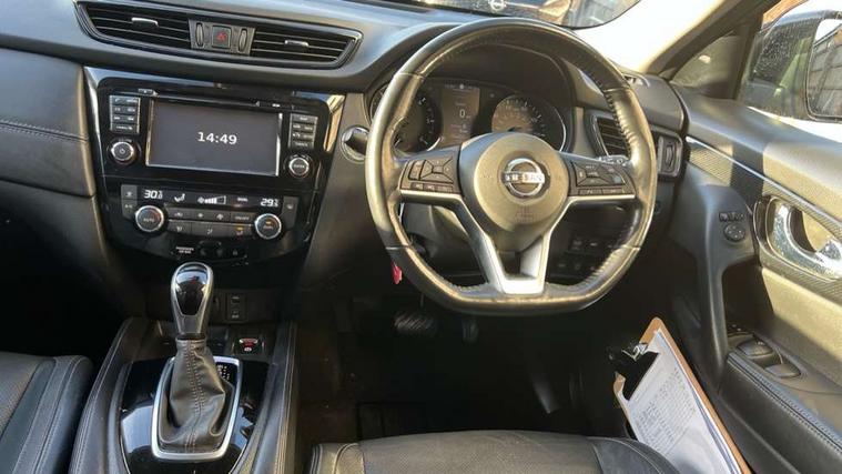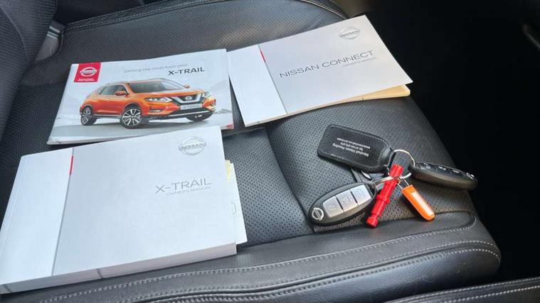 Full size spare wheel, Immobiliser, Intelligent Key, Remote central locking, Thatcham Cat.1 alarm, 6 speakers, DAB Digital radio, Radio/CD, Smartphone apps, Steering wheel mounted audio controls, USB/aux input socket, 3 point seatbelts on all seats, 6 airbags - Driver, front passenger, curtain and side airbags, ABS, Child locks on rear doors, EBD + Brake Assist, Electric parking brake, ESP + traction control, Intelligent emergency braking with pedestrian recognition, Seatbelt warning, Tyre pressure monitoring system, Adaptive front lighting system, Anti dazzle rear view mirror, Automatic headlights, Automatic rain sensing wipers, Black honeycomb front grille, Body colour door mirrors, Chrome door handles, Chrome side mouldings, Chrome window surround, Electric folding door mirrors, Electric heated door mirrors, Front and rear electric windows, Front fog lights, LED daytime running lights, LED Headlights, Panoramic sunroof with one touch shade, Rear privacy glass, Satin silver roof rails, Shark fin roof aerial, 3 rear headrests, 60/40 split rear bench seat, Centre console storage box/armrest, Configurable luggage board system, Driver's electric lumbar adjustment, Dual zone climate control, Electric adjustable front seats including height adjust, Front and rear door pockets with bottle holders, Front cupholders, Front/rear armrests, Heated front seats, Heated rear seats, Height adjustable front headrests, Individual rear reading lights, Isofix child seat attachment, Leather D shaped steering wheel, Leather steering wheel and gear knob, Pollen filter, Tilt/telescopic adjustable steering wheel, 5" TFT driver information centre, Automatic tailgate opening, Blind spot monitoring, Bluetooth phone integration system, Driver attention alert system, Front and rear parking sensors, Intelligent around view monitor, Intelligent parking assist, Lane departure warning system, Moving object detection, Nissan connect evo 7" touchscreen navigation and entertainment system, PAS, Push button start, Stand still assist auto hold function, Traffic sign recognition, Trip computer, Nissan chassis control (intelligent ride control, intelligent trace control, intelligent engine brake),