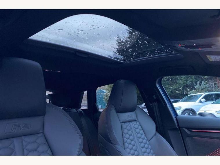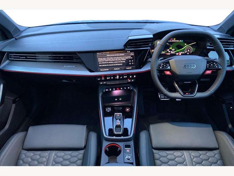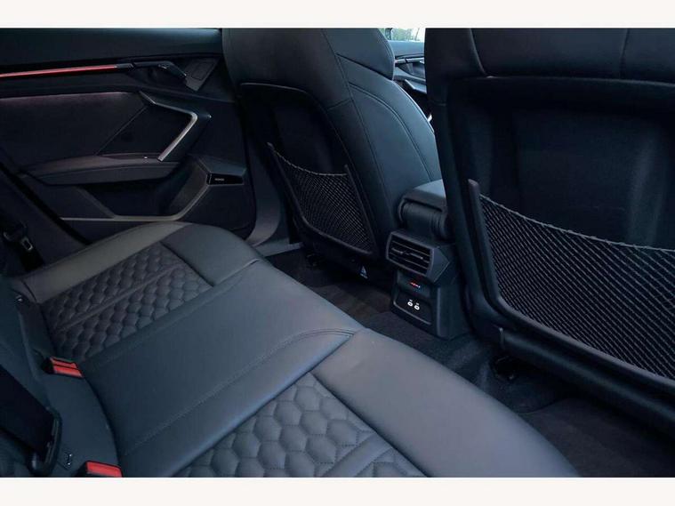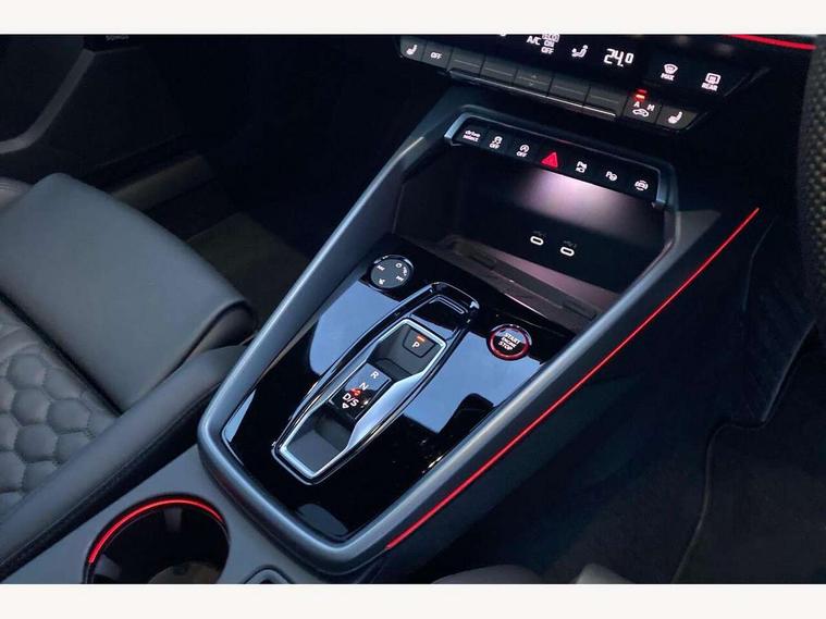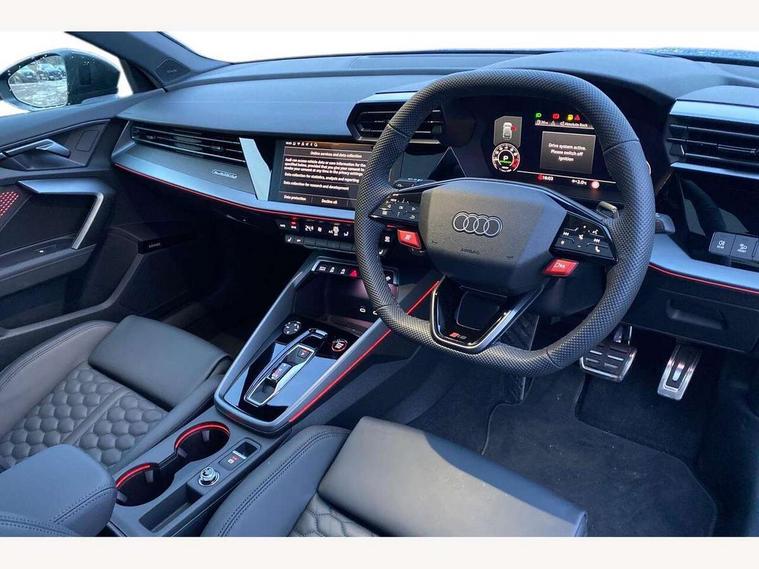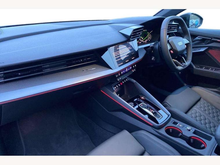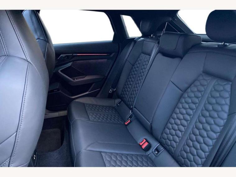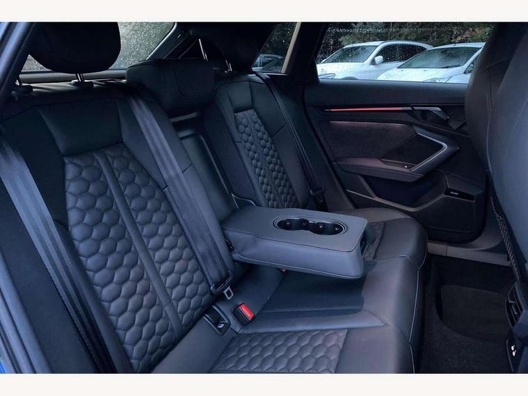 Adjustable speed limiter, Audi drive select comfort, auto, dynamic and efficiency, Audi virtual cockpit plus with RS specific design and 12.3" display with additional graphic display options, Automatic start/stop system with recuperation, Bluetooth interface, Camera based traffic sign recognition, Collision avoidance assistant, Driver attention and fatigue detection, e-Call (emergency call), MMI Navigation Plus with high resolution 10.1" colour touch screen display, Progressive steering, RS specific driving modes - RS Individual, RS Performance and RS Torque rear, Service indicator, Smartphone interface with app store includes wireless Apple carplay, Android auto and Amazon alexa integration, Trip computer, Voice control system with natural language interaction, Adaptive suspension, Increase of top speed to 174 mph, Quattro permanent four wheel drive, Audi Phonebox light with wireless charging, DAB Digital radio, USB ports with charging function in the rear, Audi beam LED projection of RS logo on ground as you exit, Auto dimming frameless rear view mirror, Carbon door mirror housings, Electrically adjustable/heated/folding/auto dimming door mirrors with integrated LED indications + kerb view function for passenger side, Engine compartment cover with carbon trim, Exterior model badging, Front electric windows, Heat insulating glass windscreen, LED 3rd brake light, Light and rain sensors, Privacy glass - dark tinted rear window, rear door and side windows, Rear electric windows, Rear side wing doors, Rear wiper, Roof edge spoiler in carbon, RS sport exhaust system - dual branch with flap control and gloss black oval tailpipe trims, 12V socket and storage compartment in front centre console, 3 seat bench in 2nd row, 3 Spoke flat top and bottomed black leather multi function steering and gear shift paddles, 3-zone deluxe automatic air conditioning, 40/20/40 split folding rear seat bench, Black cloth headlining, Black front and rear floor mats, Front and rear headrests, Front centre armrest, Front door sill trims with RS 3 logo, Heated front seats, Height and reach adjustable steering wheel, Manual boot compartment lid, Rear centre armrest with cupholder, Seat side bolsters, Single front passenger seat, Stainless steel pedals and front footrest in black, Vanadium look - Interior door handles, Door trim, power latching, Air vents, window controls, mirror adjust, rear door lock, Selector lever in centre console, Black Styling plus package - RS3, Extended ambient lighting package Pro with Multi-coloured contour lighting of instrument panel - RS3, RS exterior features pack in carbon and gloss black - RS3, Storage package - RS3 Sportback, 3x3 point rear seat belts, Driver and front passenger airbag with passenger airbag deactivation, Electronic Stabilisation Control (ESC) including ABS, ASR and EDL, First aid kit with warning triangle and 2 safety vests, Hill hold assist, Pre-sense front with pedestrian and cyclist detection, Seatbelt monitoring, Tyre pressure loss indicator, Anti theft alarm, Anti-theft wheel bolts, Electronically operated child locks, Immobiliser, Black dashboard, Inlays in carbon atlas structure, Tyre repair kit,