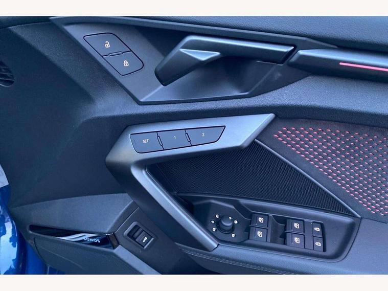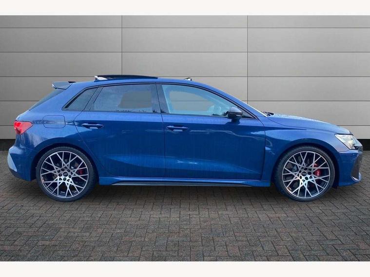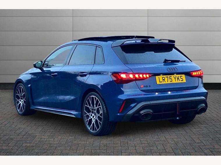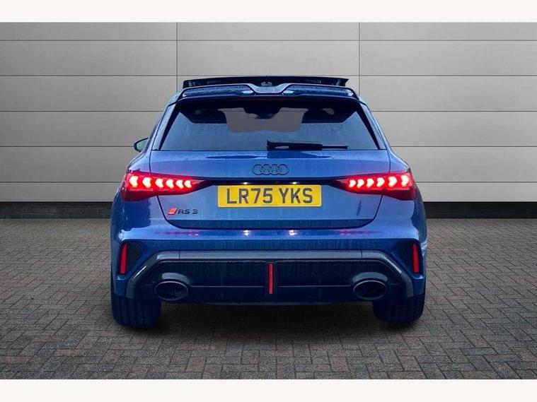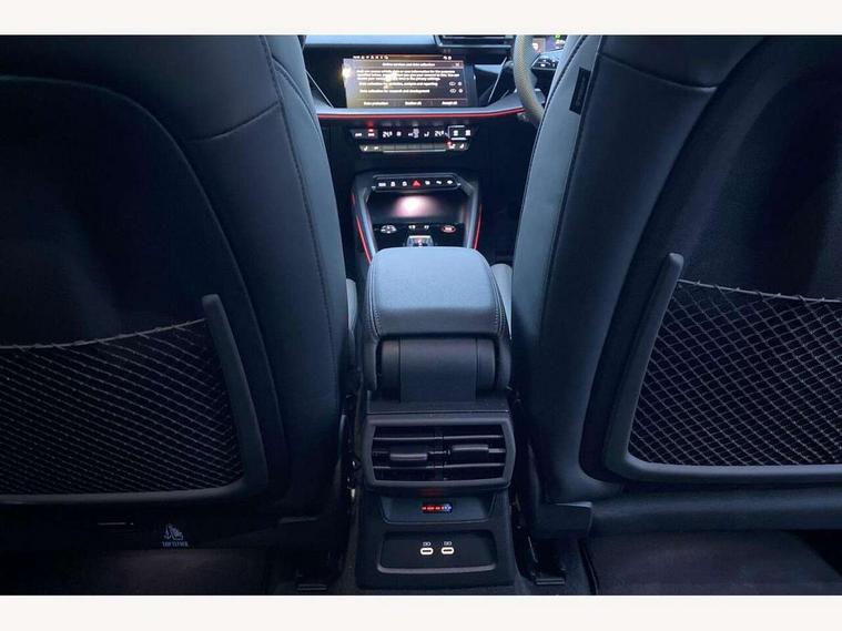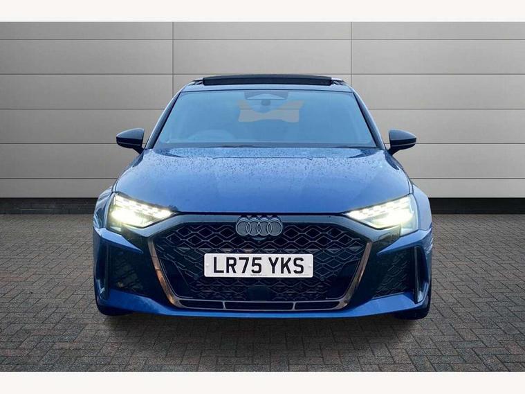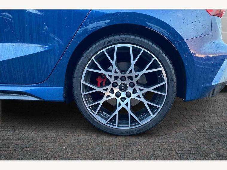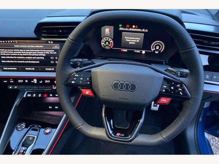 Adjustable speed limiter, Audi drive select comfort, auto, dynamic and efficiency, Audi virtual cockpit plus with RS specific design and 12.3" display with additional graphic display options, Automatic start/stop system with recuperation, Bluetooth interface, Camera based traffic sign recognition, Collision avoidance assistant, Driver attention and fatigue detection, e-Call (emergency call), MMI Navigation Plus with high resolution 10.1" colour touch screen display, Progressive steering, RS specific driving modes - RS Individual, RS Performance and RS Torque rear, Service indicator, Smartphone interface with app store includes wireless Apple carplay, Android auto and Amazon alexa integration, Trip computer, Voice control system with natural language interaction, Adaptive suspension, Increase of top speed to 174 mph, Quattro permanent four wheel drive, Audi Phonebox light with wireless charging, DAB Digital radio, USB ports with charging function in the rear, Audi beam LED projection of RS logo on ground as you exit, Auto dimming frameless rear view mirror, Carbon door mirror housings, Electrically adjustable/heated/folding/auto dimming door mirrors with integrated LED indications + kerb view function for passenger side, Engine compartment cover with carbon trim, Exterior model badging, Front electric windows, Heat insulating glass windscreen, LED 3rd brake light, Light and rain sensors, Privacy glass - dark tinted rear window, rear door and side windows, Rear electric windows, Rear side wing doors, Rear wiper, Roof edge spoiler in carbon, RS sport exhaust system - dual branch with flap control and gloss black oval tailpipe trims, 12V socket and storage compartment in front centre console, 3 seat bench in 2nd row, 3 Spoke flat top and bottomed black leather multi function steering and gear shift paddles, 3-zone deluxe automatic air conditioning, 40/20/40 split folding rear seat bench, Black cloth headlining, Black front and rear floor mats, Front and rear headrests, Front centre armrest, Front door sill trims with RS 3 logo, Heated front seats, Height and reach adjustable steering wheel, Manual boot compartment lid, Rear centre armrest with cupholder, Seat side bolsters, Single front passenger seat, Stainless steel pedals and front footrest in black, Vanadium look - Interior door handles, Door trim, power latching, Air vents, window controls, mirror adjust, rear door lock, Selector lever in centre console, Black Styling plus package - RS3, Extended ambient lighting package Pro with Multi-coloured contour lighting of instrument panel - RS3, RS exterior features pack in carbon and gloss black - RS3, Storage package - RS3 Sportback, 3x3 point rear seat belts, Driver and front passenger airbag with passenger airbag deactivation, Electronic Stabilisation Control (ESC) including ABS, ASR and EDL, First aid kit with warning triangle and 2 safety vests, Hill hold assist, Pre-sense front with pedestrian and cyclist detection, Seatbelt monitoring, Tyre pressure loss indicator, Anti theft alarm, Anti-theft wheel bolts, Electronically operated child locks, Immobiliser, Black dashboard, Inlays in carbon atlas structure, Tyre repair kit,