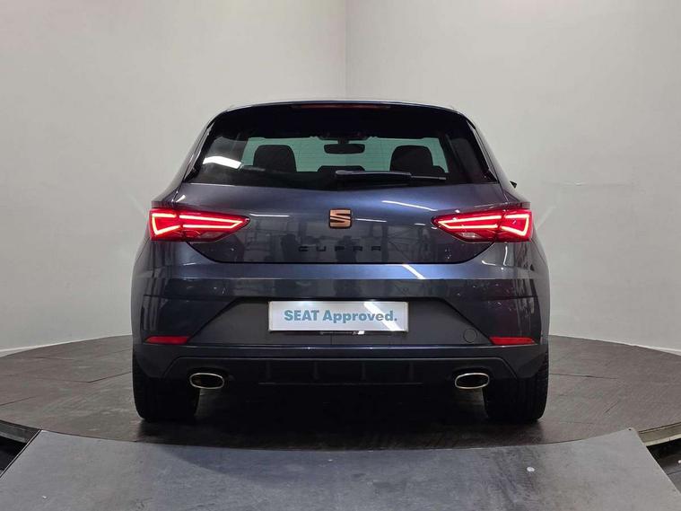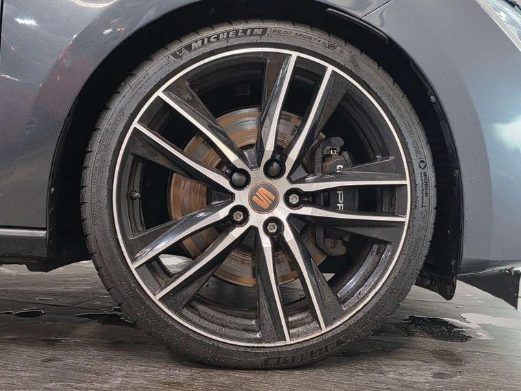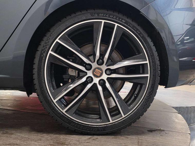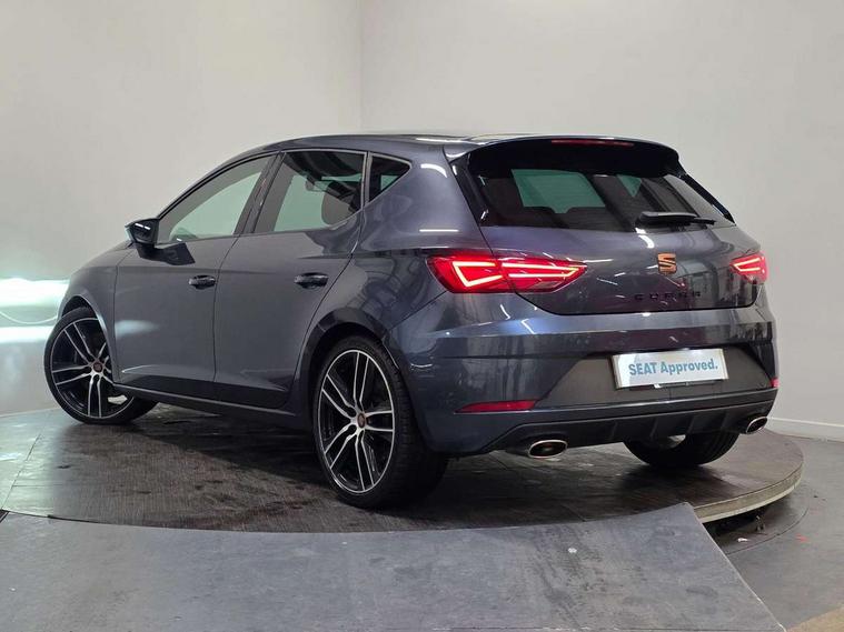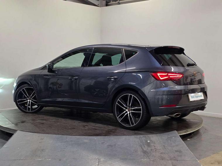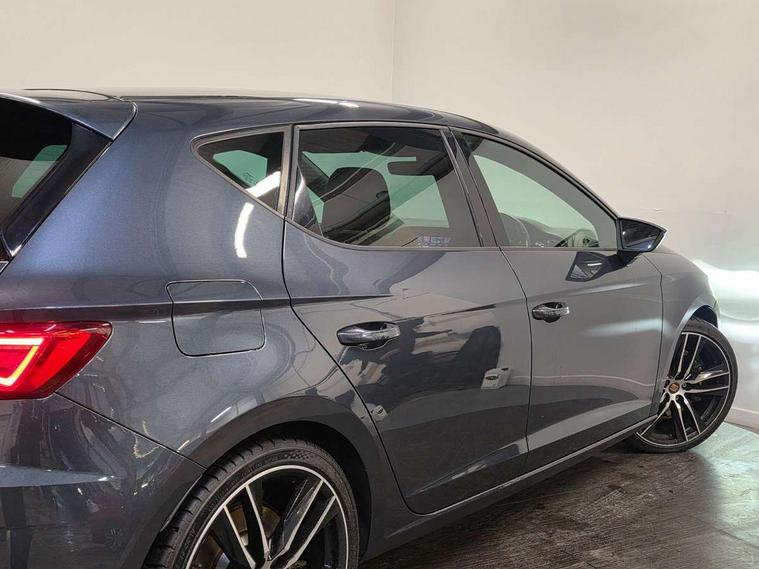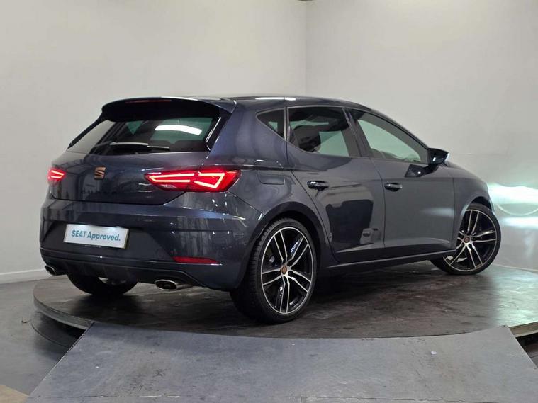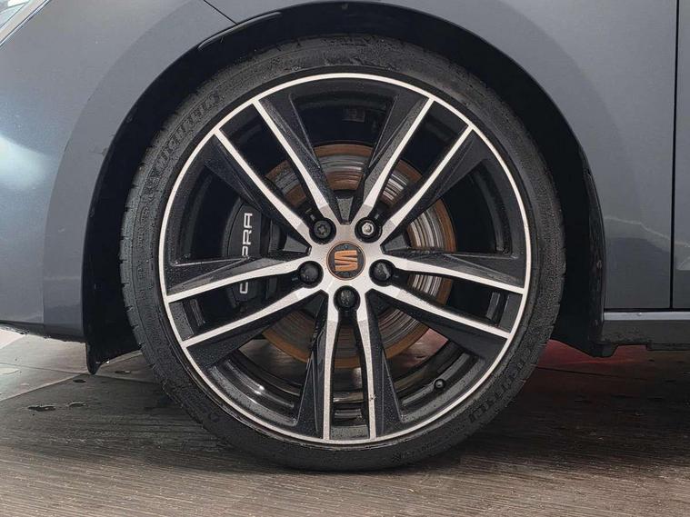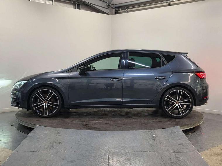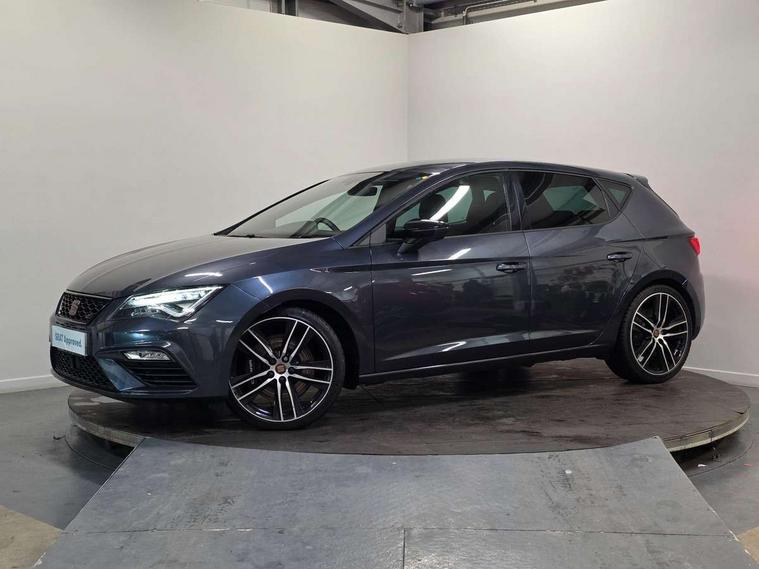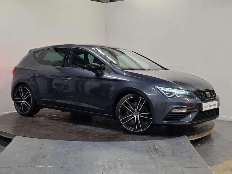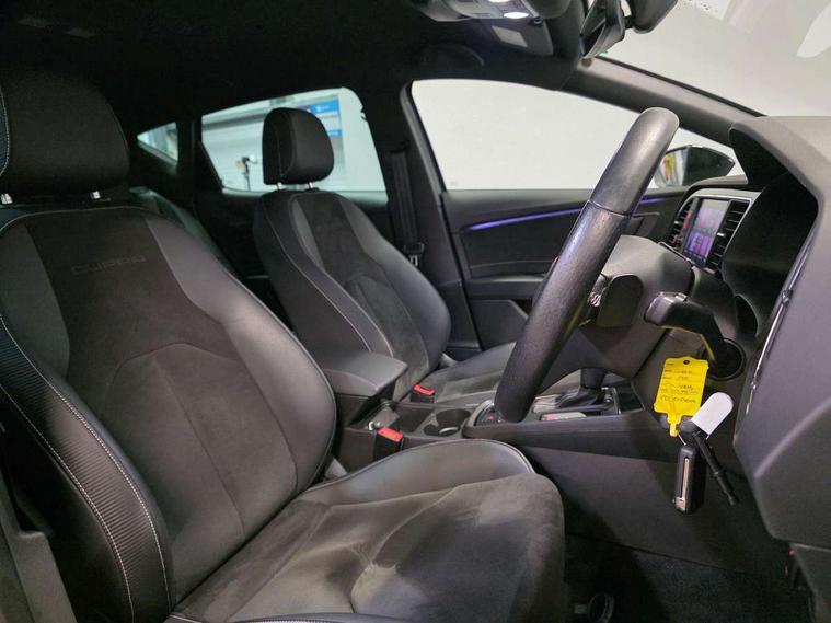 CUPRA performance interface, Digital cockpit, Electro-mechanical progressive power assisted steering, Front and rear parking sensors, Front assist with pedestrian protection, Full Link Smartphone Integration with Mirror Link, Apple Car Play, Google Android Auto with USB Type C cable for Apple and Android compatibility, Media system plus with 8" display, 4 USB, 8 speakers, CD, voice control, DAB, bluetooth and handsfree, steering wheel mounted audio and phone control, Navigation system 3D map display, high resolution colour driver display, two SD card slots, RPM, trip computer, outside temp gauge, instrument light brightness, low fuel warning light, lights on reminder, gearshift indicator, SEAT drive profile CUPRA with 4 mode (Cupra/Normal/Sport/Individual), throttle response, sound actuator and gearshift, SEAT logo boot release, Service interval indicator, Dynamic chassis control, Lowered sports suspension, Auxiliary input socket, SEAT USB media cable, Black front grille, Body colour door handles, Body coloured bumpers, Dark tinted rear windows, Electric folding door mirrors, Electric front/rear windows, Electrically adjustable and heated door mirrors, Exclusive Cupra front and rear bumpers, Full LED headlights with LED day time running lights + LED rear tail lights + LED licence plate lights and LED front and rear fog lights, Gloss black exterior mirrors with integrated LED indicators, Gloss black front grille frame, High gloss black finish B and C pillars, Illuminated aluminium front door sill with CUPRA logo, Rear wash/wipe, Visible dual exhaust pipes, 12v power point in centre console, 60/40 split folding rear seat with armrest, Additional heating and ventilation outlet in rear of centre console, Aluminium pedals, Black interior roof, Boot storage net, Cargo rings in boot, Driver and passenger seat height adjust, Driver and passenger sun visor, covered and illuminated mirror, driver sun visor with card holder, Driver seat lumbar adjustment, Dual zone climate control, Dust/pollen filter, Flat bottomed perforated leather steering wheel with white stitching and CUPRA logo and leather gear knob, Front and rear head restraints, Front centre armrest with storage compartment, Front cupholders x 2, Front passenger seat lumbar adjustment, Front seatback storage pockets, Front sport seats in microsuede, Front/rear floor mats, Height adjustable front and rear headrests and third rear headrest, Height/reach adjust steering wheel, High centre console with integrated box & cup holder, rear air outlet, with armrest in front seats, Interior copper and black detailing, ISOFIX points in outer rear seats with top tether anchorage points, Luggage tie-down hooks, Multi-colour ambient interior lighting, Steering wheel gearshift paddles, Storage box under drivers and passenger seat, Convenience pack+ - Leon, 3 point seatbelts on all rear seats, ABS, traction control system and front differential lock system, Child proof door locks, Driver and front passenger airbags with front passenger airbag de-activation, front side, curtain, driver knee airbags, EBA, Electric handbrake, Electronic parking brake with auto hold, ESC with switch off key, Front and rear black brake calipers with cupra logo, Front seatbelt pretensioners, Front seatbelt reminder, Hill hold control, Multi-Collision braking, Tyre pressure monitoring system, 2 folding remote keys with window open/close function and boot opening/door mirror folding function, Central locking fuel filler cap, Engine immobiliser, Locking wheel bolts, Remote central locking + deadlocks, Volumetric alarm with back up horn, Gloss black interior detailing, 19" Cupra Machined alloy wheels 30/2, Space saver spare wheel,