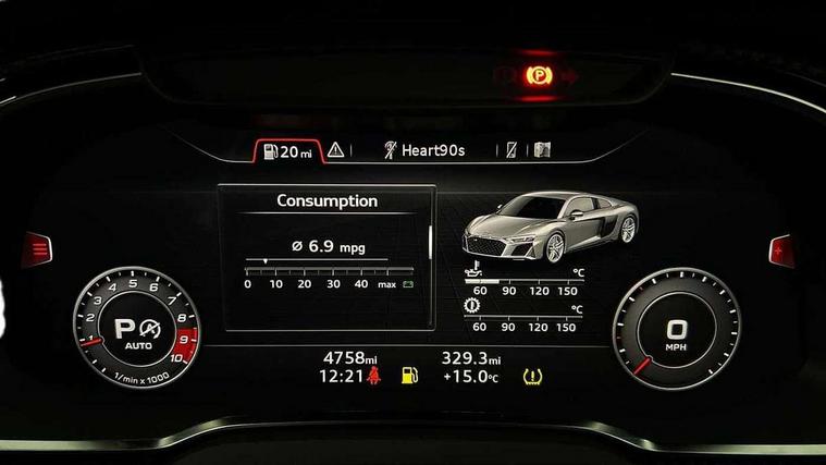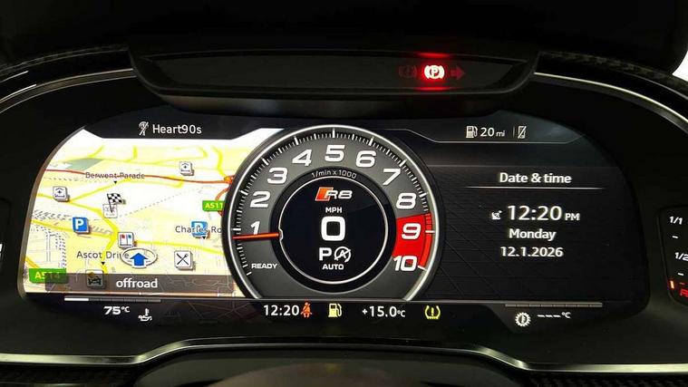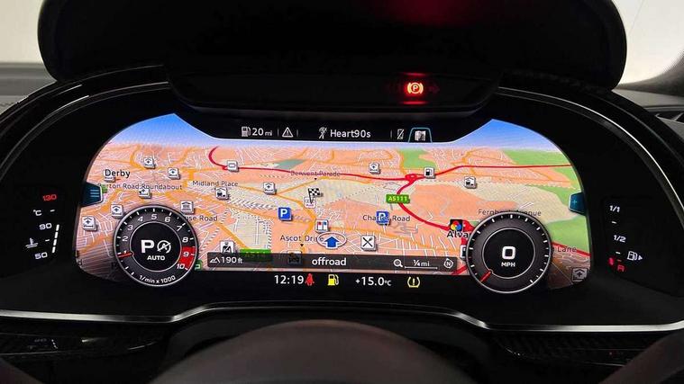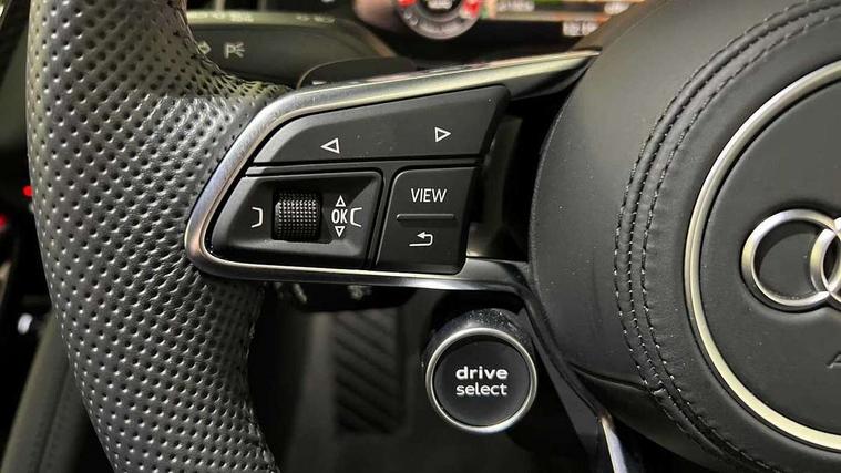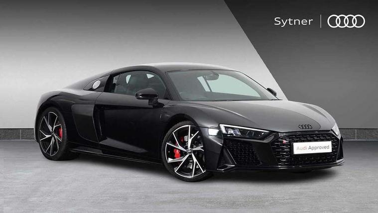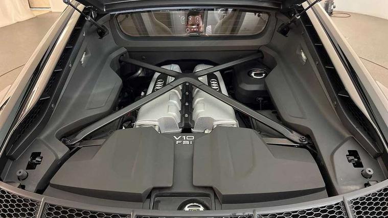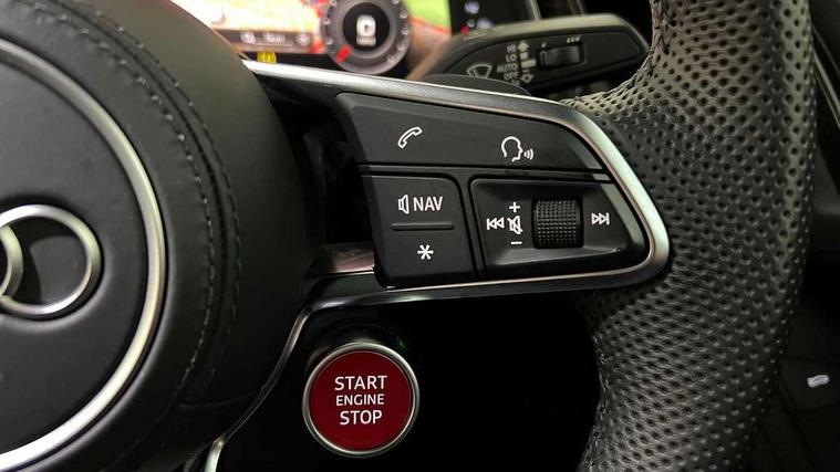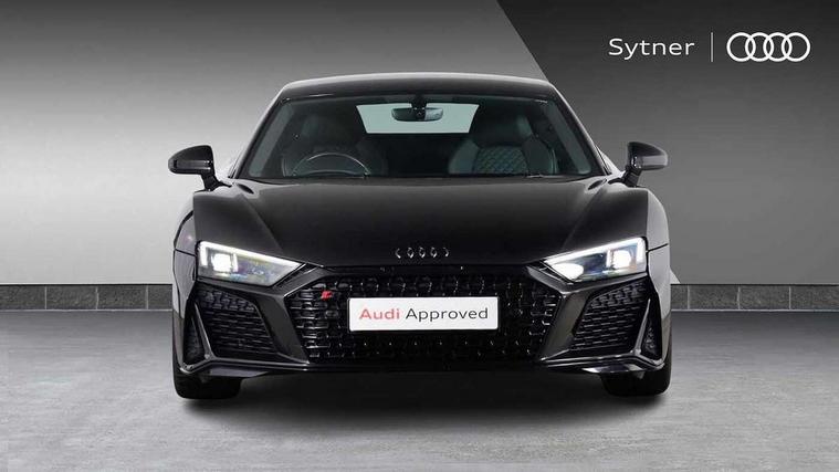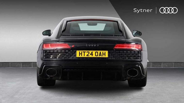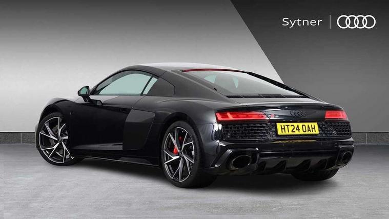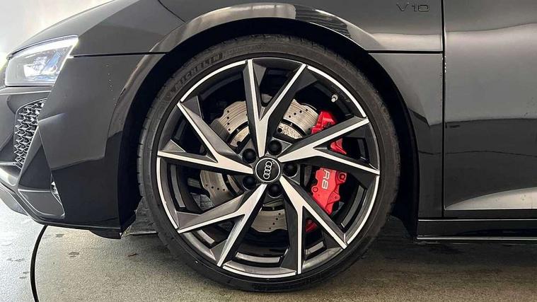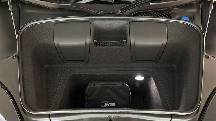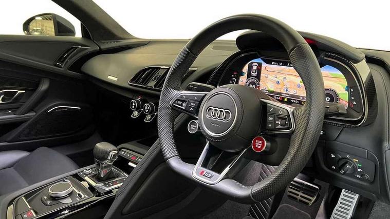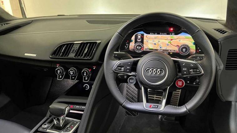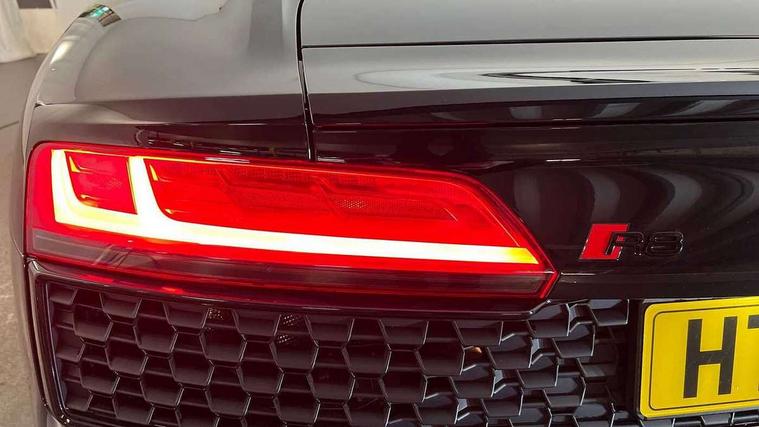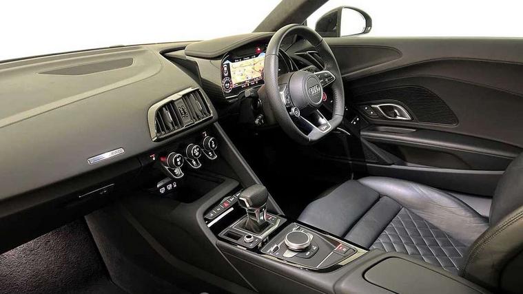 Audi connect, Audi drive select, Audi parking system plus with front and rear sensors, Audi phone box with wireless charging, Audi smartphone interface, Audi virtual cockpit, Bluetooth interface, Cruise control with speed above 18mph, Emergency call service, MMI navigation plus with MMI touch, PAS, Reversing camera, Service interval indicator, Start/Stop system with energy recuperation, Voice control system, Audi cylinder on demand, Rear wheel drive with passive differential lock on rear axle, RWD specific sport suspension, S tronic transmission with hill hold assist, Audi music interface with 2 USB ports with charge and data functions, Bang and Olufsen Sound System with loudspeakers in the head restraints, DAB Digital radio, 3rd brake light, Audi beam, Audi space frame, Auto dimming rear view mirror and frameless with light and rain sensor, Automatically extendable rear spoiler, Black mirrors, Electric front windows, Electrically adjustable, heated, folding and automatically dimming door mirrors with integrated LED indicator, Gloss black oval tailpipe trim, Gloss black radiator grille with R8 emblem, Heated rear window, High beam assist, LED headlights with dipped beam, daytime running lights, indicator and static turning light in LED technology, LED rear lights with dynamic rear indicators, Light and rain sensor, Rear boot, Sideblades in gloss carbon, Variable front intermittent wipers, 3 spoke flat bottomed sport leather steering wheel and multifunction plus with 2 operating satellites, Deluxe automatic climate control air conditioning, Illuminated door sills with aluminium insert, Pneumatic seat backrest and side bolster adjustment, Seat heating, Single front passenger seat, Stainless steel pedals and footrest, Black Styling pack - R8 Coupe, Gloss black styling pack - R8, Interior light pack - R8, ABS, Driver/front passenger airbag, EDL traction control, ESP, Front side airbags, Red brake calipers, Seatbelt monitoring, Side curtain airbags, Tyre pressure warning light, Warning triangle and first aid kit, Wave brake discs, Advanced key with safelock, Anti theft alarm and immobiliser, Locking wheel bolts, Remote central locking, Alcantara headlining with diamond stitched pattern, Belt loops, top section of centre console, centre armrest, door pull handle and speaker trim on front pass. side in fine Nappa leather seat up. colour, Door armrests and map compartments in fine Nappa leather in seat upholstery colour, Loudspeaker on drivers side in artificial black leather, Piano black lower inlays, Steering wheel impact absorber trim, lower part of centre console, door rails, rear panel rail and side panel trims in black Fine Nappa Leather, Upper and lower section of dashboard, cowl, monoposto, knee pad on the drivers side, airbag cover in black Fine Nappa Leather, Upper inlays in gloss carbon, Tool kit, Tyre repair kit,