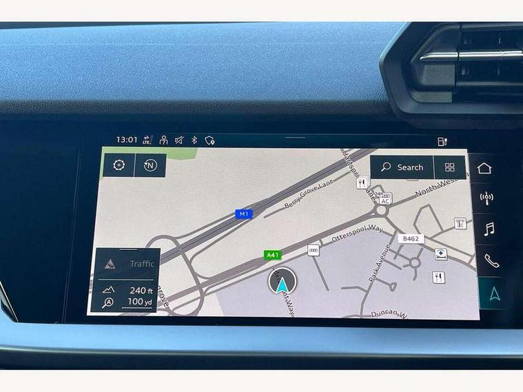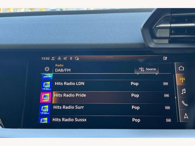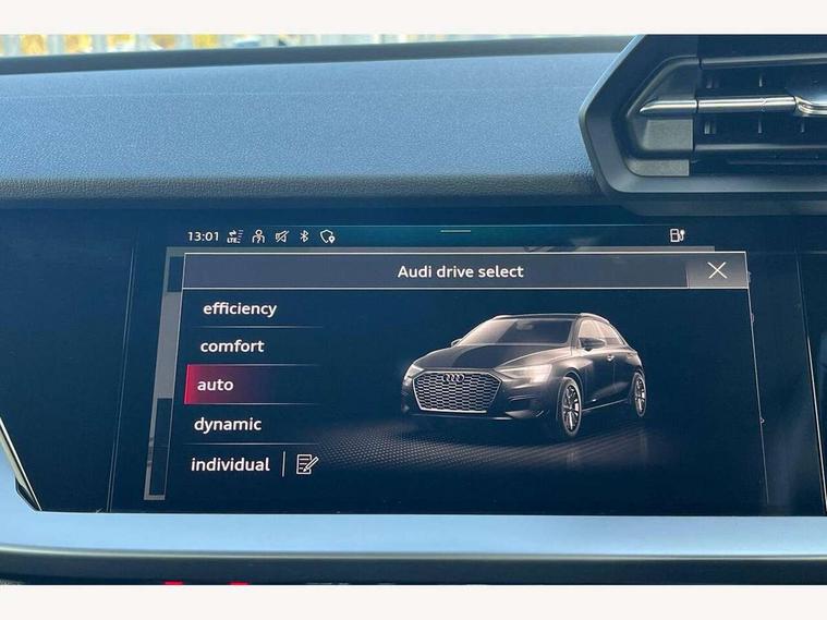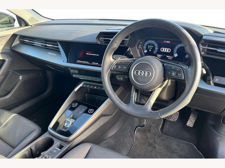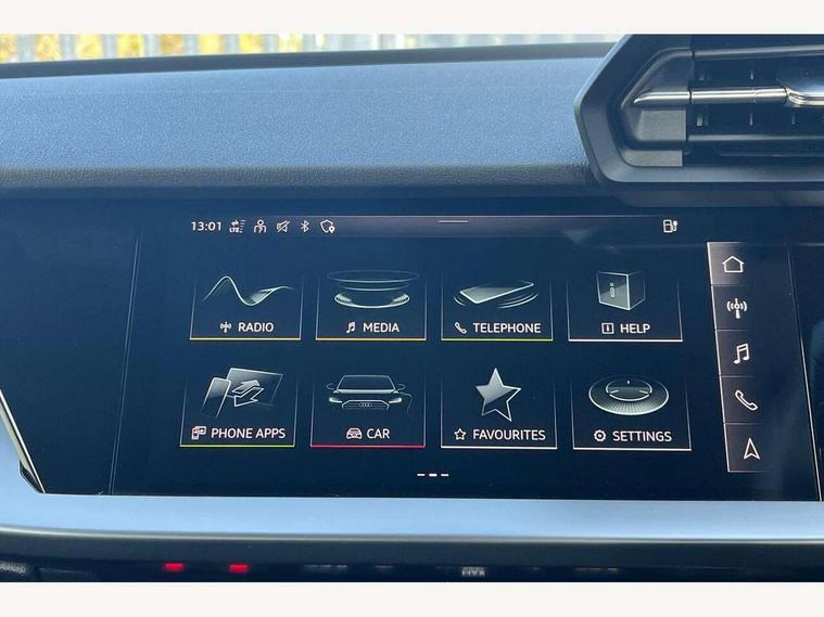 Audi drive select (Auto, Comfort, Dynamic, Efficiency and Individual), Audi smartphone interface, Audi Virtual Cockpit - 10.25" digital and colour instrument cluster, Automatic start/stop system with recuperation, Bluetooth interface, Collision avoidance assistant, e-Call (emergency call), Electromechanical power speed sensitive steering, Lane departure warning system, MMI Navigation Plus with high resolution 10.1" colour touch screen display, Service indicator, Trip computer, Voice control system with natural language interaction, 3 pin 10 amp domestic charging cable, 3.6 kw On-board charger, Standard suspension, Type 2 mode 3 32 amp charging cable, Type 2 socket for AC charging, 2xUSB-C connection with data and charging functions, 6 passive loudspeakers, DAB Digital radio, 3rd brake light, Acoustic glass windscreen, Aluminium window trim, Auto dimming frameless rear view mirror, Body colour exterior mirrors, Body colour roof spoiler, Electrically adjustable/heated/folding/auto dimming door mirrors with integrated LED indications + kerb view function for passenger side, Front electric windows, LED daytime running lights, LED headlights and halogen rear lights, Light and rain sensors, Rear electric windows, Rear side wing doors, Rear window, rear door windows and rear side windows in clear glass, Rear wiper, 12V socket and storage compartment in front centre console, 3 seat bench in 2nd row, 40/20/40 split folding rear seat bench with cupholder, Dual zone electronic climate control, Front and rear centre armrest, Front and rear headrests, Front door sill trims with aluminium inlay, Front/rear floor mats, Height and reach adjustable steering wheel, Interior lighting - Front and rear roof module including reading lights, glove compartment light and right hand side, Luggage compartment floor covering, Manual boot compartment lid, Manually adjustable front seats, Seat side bolsters, Single front passenger seat, Steel grey cloth headlining, Twin leather upholstery, Aluminium interior elements pack - A3 Sportback, Sport styling pack - A3 Sportback, 3x3 point rear seat belts, Audi pre sense front, Driver and front passenger airbag with passenger airbag deactivation, Electronic Stabilisation Control (ESC) including ABS, ASR and EDL, First aid kit with warning triangle and 2 safety vests, Front side airbags with head airbags and interaction airbag, Pre-sense front with pedestrian and cyclist detection, Seatbelt monitoring, Tyre pressure loss indicator, Anti theft alarm, Anti-theft wheel bolts, Electronically operated child lock, Immobiliser, Remote control central locking, Inlays with silk effect paint in platinum grey, Tool kit, Tyre repair kit,
