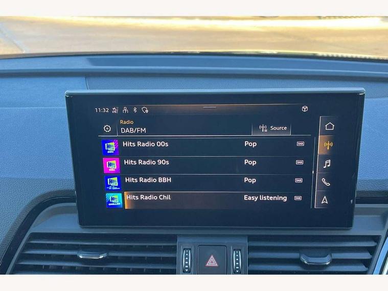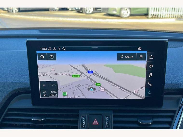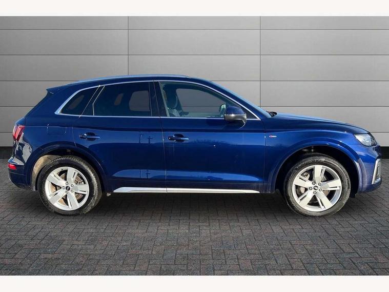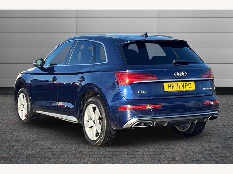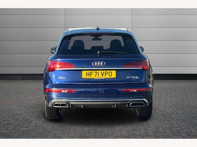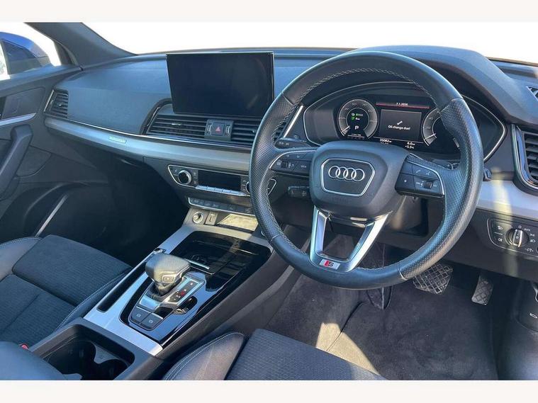 Audi connect safety and service (e-call), Audi connect with Amazon Alexa Integration, Audi drive select, Audi virtual cockpit plus with 12.3" screen and three different layout designs, Audi wireless smartphone interface, Automatic start-stop system with coasting functionality and efficiency programme, Bluetooth interface, Electro - mechanical power assisted steering, MMI navigation plus with 10.1" touch screen, Power tailgate, Reversing camera, Service interval indicator, Voice control system with Audi hotword activation "Hey Audi", 3 pin 10 amp domestic charging cable, Dynamic suspension, Quattro on demand, Type 2 mode 3 22kW 32 amp charging cable, Type 2 socket for AC charging, 2 x USB charging port with aux input socket, DAB Digital radio, Acoustic windscreen, Aluminium roof rails, Audi matrix LED headlights with dynamic front and rear indicators, Auto dimming rear view mirror, Automatic headlights and windscreen wipers, Body colour bumpers, Body colour door mirrors, Body colour rear diffuser with matt aluminium silver surrounds, Body colour underbody protection, Chrome plated exhaust trims, Door sills in Selenite silver, Electric adjustable/heated/folding door mirrors, Front air inlet surrounds in aluminium, Front and rear electric windows, Front radiator grille in honeycomb design, Headlight washers, Lower bumpers painted in contrast Manhattan grey, Rear chrome trim strip below lights, Rear privacy glass and rear side windows, Rear spoiler, Rear wiper, Roof bars, S Line badges on the front wings, S Line front and rear bumpers, S Line side skirts, 3 rear headrests, 40:20:40 split folding rear seat with rear centre armrest, Black cloth headlining, Comfort front centre armrest, Contrast stitching on seats, steering wheel and gear lever gaiter, Deluxe 3 zone electronic climate control, Front/rear floor mats, Gear lever in black leather, Heated front seats, Height adjustable front head restraints, Height/reach adjustable steering column, Illuminated door sill trims with S logo, ISOFIX child seat mounting and top tether, Manual seat adjustment with 4-way electric lumbar support, Rear seat bench plus, Sunvisors with vanity mirrors, Trunk roller cover, High gloss pack - Q5, LED interior light pack - Q5, 3 point seatbelts on all seats, 6 airbags - Driver, front passenger, curtain and side airbags, Electrically operated child locks on rear doors, Electromechanical parking brake, Electronic stabilisation control including ABS, ASR and EDL, Front passenger airbag deactivation, Hill descent control, Hill hold assist, Multi collision brake assist, Pop-up bonnet for pedestrian protection, Pre sense city, Seat belt force limiter, Seatbelt monitoring, Tyre pressure warning, Warning triangle and first aid kit, Anti theft alarm, Anti-theft wheel bolts, Keyless Go access/ignition system, Matt brushed aluminium inlays, Tool kit, Tyre repair kit,