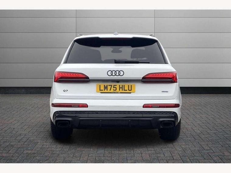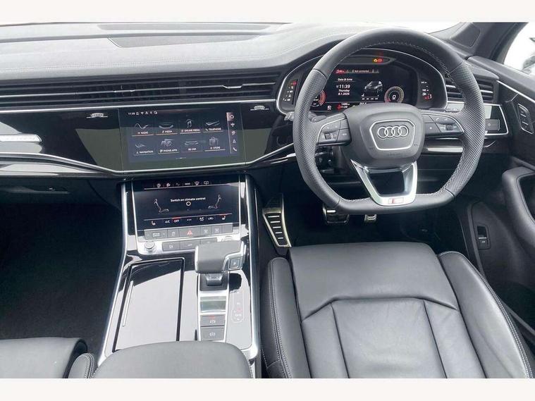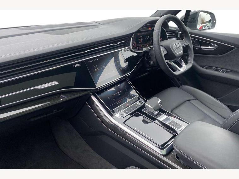 Audi connect safety and service (e-call), Audi connect with Amazon Alexa Integration, Audi drive select (Auto, Comfort, Dynamic, Efficiency, Individual, Off-road and All road), Audi phone box light with wireless charging, Audi virtual cockpit - 12.3" high-resolution LCD display with fully customisable instrument cluster, Bluetooth interface, Camera based traffic sign recognition, Electromechanical power steering, MMI navigation plus with MMI touch screens includes 10.1" and 8.6" screens with haptic feedback, Natural voice recognition, Operating buttons in Matte black, Parking system plus with 360 degree display (front, rear and side sensors) - acoustic and visual park assist system, Power operated tailgate, Rear view camera, Smartphone interface includes wireless Apple carplay/Android Auto, Start/stop system, 48V Mild hybrid technology, Adaptive air sports suspension, Quattro all wheel drive with self locking centre differential, Audi music interface - front 2 USB-C ports with charger and data functions, Audi sound system with 6 channel amplifier, 180 watt amplifying capacity and 10 loudspeakers including subwoofer, DAB digital radio module, Aluminium window trim, Audi Beam uses LEDs to project S emblem with red rhombus onto the ground when opening the side doors (front/rear), Auto dimming frameless rear view mirror, Black exhausts, Black roof rails, Electrically adj heated/folding + automatically dimming exterior mirrors with memory + automatic kerb side function for passenger side exterior mirror, Heat insulating glass in windshield, Integrated LED indications in door mirrors, LED 3rd brake light, LED daytime running lights, LED rear tail lights, Loading edge protection in stainless steel, Matrix LED headlights with dynamic front and rear indicators, Privacy glass - dark tinted rear and rear side windows from B-pillar backwards, Rear side wing doors, Rear wiper, 2 seat bench in 3rd row, 2 zone automatic climate control, 3 seat bench in 2nd row, 7 seat layout with ISOFIX points for the front passenger seat and rear passenger seat, Black carpets, Black cloth headlining, Comfort front centre armrest, Electric adjustable front seat with 4 way lumbar support, driver memory functionality, Folding rear seats, Front head restraints, Front/rear floor mats, Heated front seats, Illuminated door sill trims with S logo, ISOFIX child seat mounting for front passenger seat and 2 outer rear seats with top tether child seat mounting for all 3 rear seats, LED interior ambient lighting, Luggage compartment cover, Luggage compartment sill protection in stainless steel, Rear head restraints, Rear seat bench plus for the second row, with forwards/backwards sliding adjustment and backrest angle adjustment, Single front passenger seat, Stainless steel pedals, Sunvisors with illuminated vanity mirrors, Black styling pack plus - Q7, 3 point seatbelts on all rear seats, Audi pre sense basic, Audi pre sense front, Child locks on rear doors, Convenience key with safelock and gesture tailgate, Driver and front passenger, front side and curtain airbags, Electromechanical parking brake, Electronic Stabilisation Control (ESC) including ABS, ASR and EDL, Extended pedestrian protection measures, Hill hold assist, Seatbelt reminder, Tyre pressure loss indicator, Warning triangle and first aid kit, Anti theft alarm with tow away protection, Anti-theft wheel bolts and wheel loosening detection, Keyless Go, Remote central locking, Black dashboard, Polished oak trim with grey finish inlay, Tool kit, Tyre repair kit,