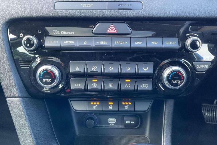 360 degree around view monitor, 4.2" supervision colour cluster display, 8" touchscreen satellite navigation with European mapping and traffic messaging channel, Android auto with voice control, Apple car play with voice control, Blind spot collision warning, Bluetooth connectivity with voice control, Cruise control + speed limiter, Drive mode selector, Driver attention warning, Emergency stop signalling system, Forward collision avoidance assist, Front parking sensor, Kia connected services featuring TomTom live, Lane keep assist, Rear parking sensor, Reversing camera, Speed limit information, Speed sensitive power steering, Trip computer, Windscreen washer level indicator, Intelligent Stop and Go, Bluetooth audio streaming, DAB Radio with MP3, JBL Premium sound system with 8 speakers, external amp, subwoofer and front centre speaker, Rear USB port, Steering wheel mounted audio controls, USB/iPod/auxiliary input connections, All round electric windows with drivers auto up/down function, Auto dimming rear view mirror, Automatic headlights, Automatic lighting control, Black wheel arch body mouldings and side sills with chrome insert, Body colour door handles with chrome inserts, Body colour door mirrors, Chrome front bumper insert, Chrome grille surround, Chrome window surround, EcoDynamics + Badge, Electric panoramic glass sunroof (Electric one touch with safety function), Electrically adjustable/heated/folding door mirrors with LED indicators, Front wiper de-icer, High beam assist, High gloss black diamond mesh radiator grille, LED Bi-Function headlights, LED daytime running lights, LED rear lights, Privacy glass (rear side windows and rear screen), Projection front fog lights, Rain sensing front wipers, Rear spoiler, Rear wiper, Roof rails, Shark fin antenna, Silver painted front and rear skid plates, Speed sensitive front wipers, Tinted glass, Trailer stability assist, Welcome and follow-me home light functionality, Wide view drivers door mirror, Windscreen wiper de-icer, 10 way driver/8 way passenger electrically power adjustable seats, 12V power in front and rear centre console, 3 x passenger assist grips, 60/40 split folding rear seat, Air filter, All-round height adjustable headrests, Aluminium door scuff plates, Centre console storage box, Door armrest in leather, Driver and front passenger side sunvisors with illuminated vanity mirrors, Drivers seat power lumbar support, Dual zone automatic air conditioning, Front and rear door storage, Front cabin LED map light with sunglasses case, Front door courtesy reflectors, Front seat and rear pockets, Front/rear centre armrests, Gear shift indicator, Glovebox illumination, Heated front and outer rear seats, Heated steering wheel, Interior door lock/unlock function, ISOFIX Child seat top tethers and anchor fixings, Leather steering wheel, Leather trimmed gearshift, Leather upholstery, Light grey headlining, Luggage area LED light, Luggage area load cover, Luggage net with hooks, Rear centre armrest with cupholder, Rear coat hooks, Satin chrome interior door handles, Side cabin LED lights, Tilt/telescopic adjustable steering wheel, Ventilation ducts to rear compartment, Active front headrests, All round 3-point seatbelts, Anti-lock braking system with electronic brakeforce distribution, Dual front side airbags, Electronic parking brake, Electronic stability control with downhill brake control, ESP + traction control, Front passenger airbag cut-off switch, Front seatbelt pretensioners + load limiters, Height adjustable front seatbelts, Hill start assist control (HAC), Impact sensing auto door unlocking, Rear door child safety locks, Twin curtain airbags with roll over sensor, Twin front airbags, Tyre pressure monitoring system, Advanced anti-theft system including immobiliser and alarm, Door deadlocks, Engine Start/Stop Button with Smart Entry System, Locking wheel nuts, Speed sensitive auto door locking, Visible vehicle identification number, High gloss black centre fascia, 19" Alloy wheels, Tyre mobility kit,