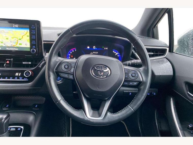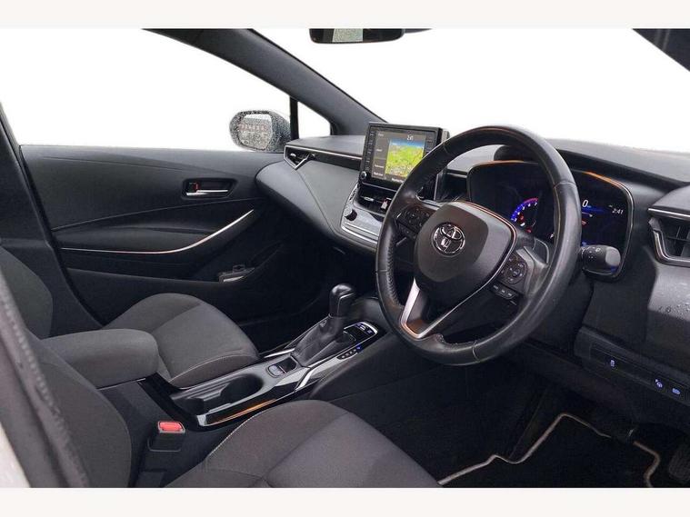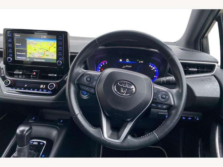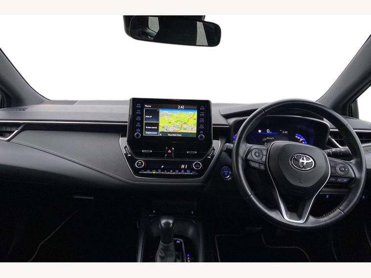Bluetooth telephone connectivity, E-call, Electrically assisted power steering, Intelligent park assist, Push button start, Reversing camera, Smartphone integration with Apple CarPlay and Android auto, Speed limiter, Voice activation, Vehicle Stability Control (VSC), 2 ring combimeters with 7" colour TFT screen, 6 speakers, 8" multimedia and back monitor, AM/FM radio, DAB Digital radio, Toyota touch 2 with go navigation system, USB and Aux in connectors + 12V front outlet, Anti-jam protection on power windows, Auto up and down function on all power windows, Automatic headlights, Body coloured bumpers, LED daytime running lights, LED Headlights, Power adjustable heated door mirrors, Power front windows, Power rear windows, Rear window wiper, Shark fin antenna, 12v power outlet - luggage side, 3 rear headrests, 3 spoke leather steering wheel + gear knob, Clean air filter, Dual zone automatic air conditioning with ECO mode switch, Fabric upholstery, Front head restraints, Heated seats, ISOFIX seat fixing (2 fixings on rear outer seats), Pollen filter, Power lumbar support, Steering wheel switches, Tilt/telescopic steering column, Whiplash Injury Lessening (WIL) feature (active headrest) for seats, Parking pack - Corolla, Toyota safety sense 2 pack - Corolla, 3x3 point rear seatbelts, Adjustable front driver seat belt extender, Anti lock braking system + Electronic brake force distribution, Brake assist function, Electronic parking brake, Front passenger airbag on/off switch, Front seatbelt reminder, HAC-Hill-start Assist Control, Rear seat belt reminder, Seatbelt pretensioners and force limiters, Supplemental restraint system (SRS) 7 airbags - dual driver, dual side curtain, side impact and driver knee airbags, Traction control, Tyre pressure warning system, Alarm/immobiliser, Remote central locking + deadlocks,