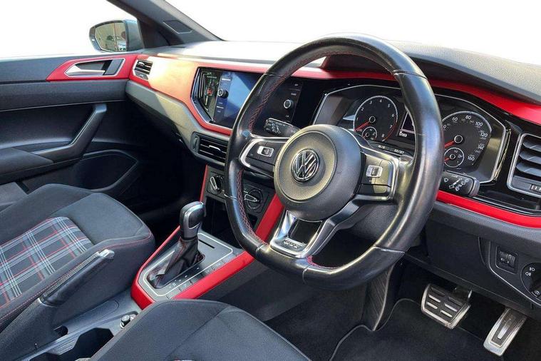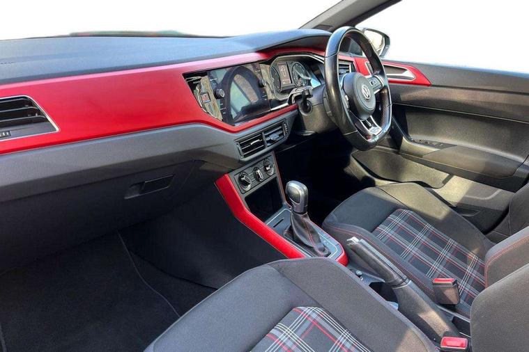 App-Connect, Digital clock, Driver alert system, Driving Mode Selection with four preset modes - Eco, normal, sport or individual modes, Lights on warning, Multifunction computer plus, Power assisted speed sensitive steering, Speedo and rev counter, electronic odometer, trip, service interval display and fuel gauge, Start/stop system, Volkswagen connect, Warning buzzer and light for front seatbelts unfastened, Battery regeneration during braking, Galvanished body, Lowered sports suspension, XDS electronic differential lock, Body colour door handles, Body coloured side sills, Electric front windows, Extended sill strips flared in black, Front fog lights including static cornering, Front windscreen washers and wipers with 4 speed intermittent delay, Gloss black rear spoiler (roof), Heat insulating tinted glass, Heated rear window with auto timer, High level 3rd brake light, Honeycomb radiator grille with red stripe, LED darkened rear light clusters, LED daytime running lights, LED rear number plate lights, Rear electric windows, Rear windscreen washer and wiper with interval delay, reverse activated, Stainless steel door sill protections with GTI logo, Twin chrome exhaust tailpipes, Unique GTI badging, 2 bag hooks in luggage compartment, 2 front cupholders and 12 V socket with cover, 3 rear head restraints, 60/40 split folding rear seat, AlumInium look pedals, Ambient lighting in front foorwell, front/rear door and dashboard light strips, Black roof lining and sun visors, Centre console storage with open storage compartment, Chrome-plated electric mirror adjustment switch surround, Chrome-plated electric window button surround, Driver and front passenger sunvisors with illuminated vanity mirrors, Dust/pollen filter, Folding rear seat backrest, Front and rear carpet mats with red stitching, Front head restraints, Front seat backrest storage pockets, Gear change selection via paddle shift on steering wheel, Gear lever gaiter in black trim surround, Glovebox, Handbrake grip button in chrome effect, Height/reach adjustable steering column, Instrument lighting, adjustable panel illumination, Interior light with delay, Isofix Preparation 2 Rear child seats, Jack and tool kit, Leather gear knob and handbrake grip, LED interior lighting - 2 reading lights front and rear with interior delay and dimming function, Luggage compartment cover, removable, Luggage compartment lighting, Luggage compartment with variable load floor, Storage compartment in front doors, Storage compartment in rear doors, Storage compartment under front seats, Three spoke leather trimmed multifunction steering wheel with GTI logo and red contrast stitching, GTI styling pack - Polo, 3 point height adj front seatbelts + pretensioners, 3x3 point rear seatbelts, ABS, Automatic post collision braking, Driver/front passenger airbag, Drivers and front passengers safety optimised head restraints, ESP with EDL + ASR, Front and rear passenger curtain airbags, Front passenger airbag deactivation, Front seat side impact airbags, Front/rear disc brakes, Hill hold control, Hydraulic Brake Assist (HBA), Red brake calipers, Single tone horn, Tyre pressure monitoring system, Alarm with interior protection and deactivation via infotainment system, Electronic engine immobiliser, Remote central locking with 2 remote folding keys, Chrome instrument surround detailing, Chrome plated air vent surround, Gloss black instrument surrounds, Steel space saver spare wheel,
