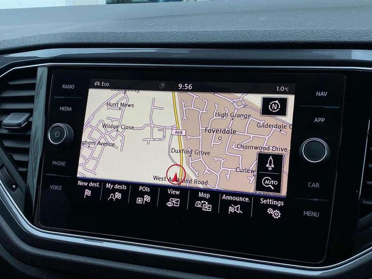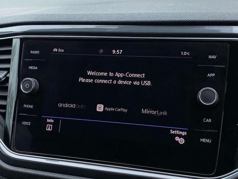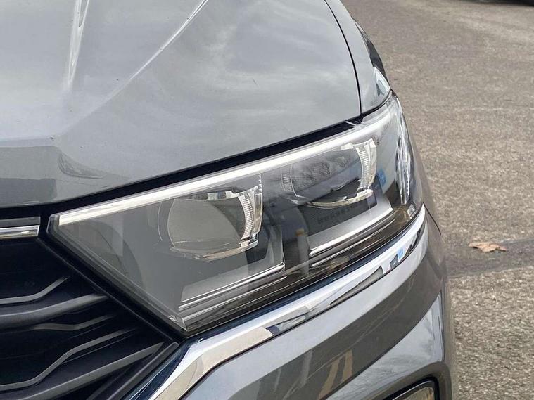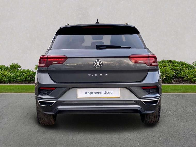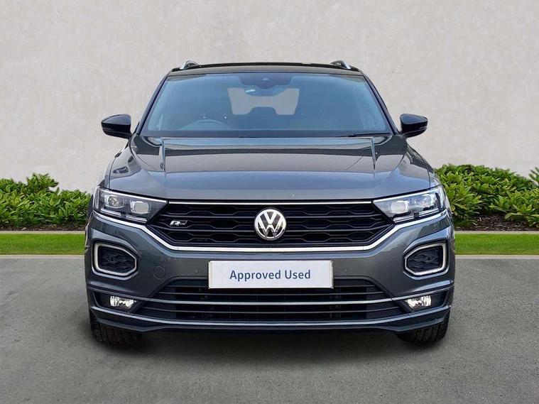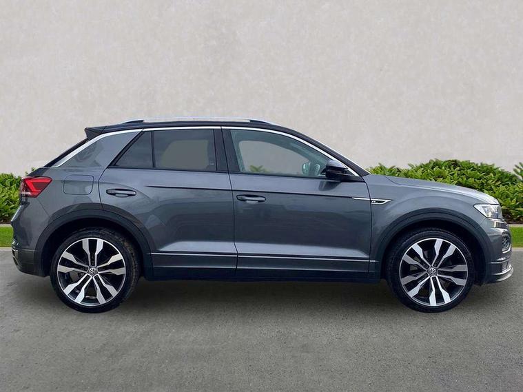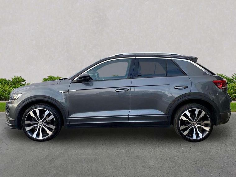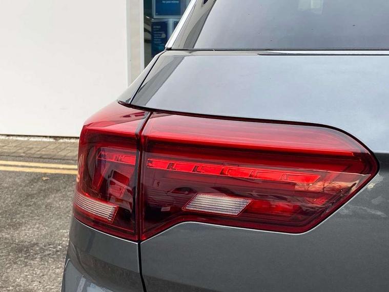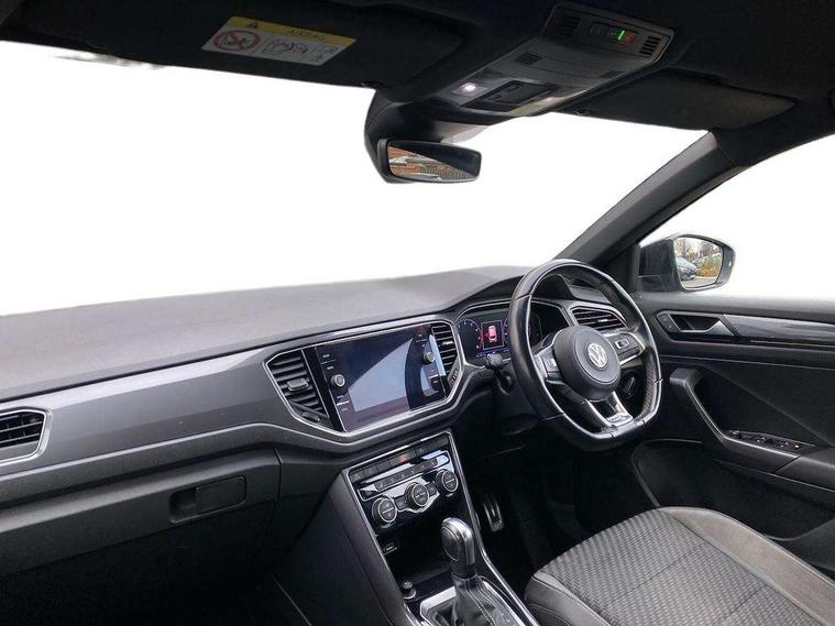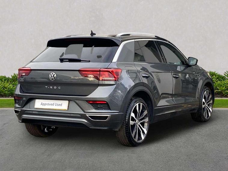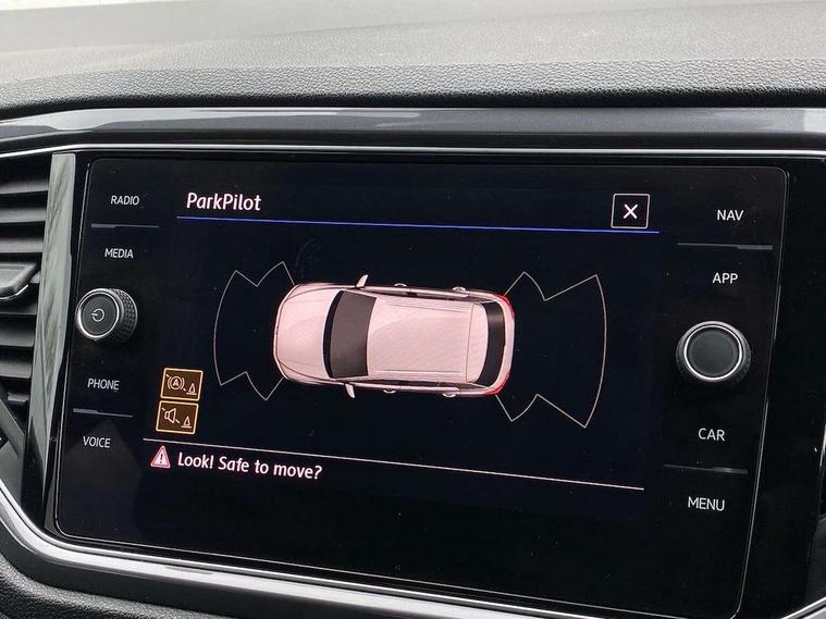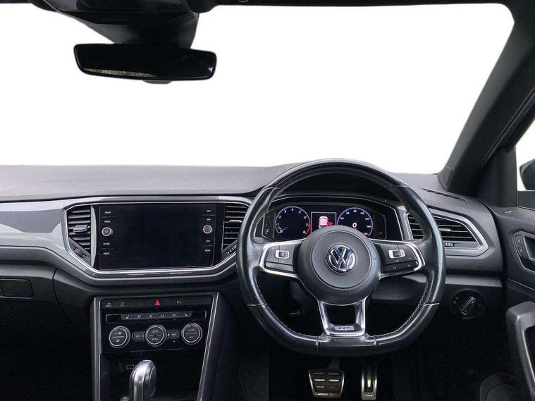 2 USB connection charging sockets, Active Info Display, 10.3" high resolution TFT dash display screen with customised information, Adaptive cruise control, App-Connect, Automatic start/stop system, Bluetooth telephone and audio connection for compatible devices, Car information display, Car-Net Security and Service, Discover navigation, 8" touch screen navigation/infotainment system with Car-Net, European map, CD/radio, 2D/3D map and speed limiter, Driver alert system with audible and visual fatigue detection system, Driver profile selection, Front assist, radar sensor controlled distance monitor, city emergency braking + predictive pedestrian protection, Lane assist, Multifunction computer with visual gear change recommendation for fuel consumption, Progressive power assisted steering, Service interval indicator, Think blue trainer driver tips and journey analysis, Voice activation, Warning sound and light for doors and tailgate open, Warning sound and light for front seatbelts unfastened, Battery regeneration during braking, Bluetooth - Simultaneous pairing of 2 compatible mobile devices, DAB Digital radio, Dynamic navigation based on TMC+, Multi device interface (MDI) with USB connection, Music playback - MP3, WMA and AAC files, Premium USB cable in choice of either Apple or Android smartphone compatibility, SD card slot, SMS functionality - read, compose and send SMS messages using touch-screen display, Three route options - Fast, Short, Eco, Title and cover art display, Auto dimming interior rear view mirror, Automatic hazard lights activation under emergency braking, Black grained lower door protectors, Black grained wheel arches, Body colour door handles, Body colour rear roof spoiler, Chrome effect left and right trapezoid exhaust tailpipe fascia surround, Chrome trim on upper and lower radiator grille, Door mirror integrated indicators, Dusk sensor, Electrically foldable, adjustable and heated door mirrors with puddle lights and reverse activated kerb-view adjustment on passenger's door mirror, Front and rear electric windows, Front fog lights with static cornering function, Front windscreen wiper with intermittent wipe and 4 position delay, Fully galvanised body, Heated rear window, High level 3rd brake light, LED darkened rear light clusters, LED rear number plate lights, Manual coming/automatic leaving home lighting function, Rain sensor, Rear tinted glass from B-pillar backwards approx 65% tinted, Rear windscreen washer and wiper with interval delay, 12V socket in centre console storage area, 2 LED front and rear reading lights, 3 rear head restraints, 4 load lashing points in luggage compartment, Aluminium pedals, Ambient lighting in front footwell and light strips below trim in front doors, Black decorative sleeve on gear handles, Black roof lining and sun visors, Carbon flag cloth upholstery, Climate control - 2 zone electronic air conditioning with automatic air recirculation and allergy filter, Drawer under drivers seat, Front + rear carpet mats, Front centre armrest with storage compartment, longitudinal and height adjustable and two rear air vents, Front cupholders x 2, Front footwell illumination, Front seat back storage pockets, Front sport seats, Glovebox, Height adjustable front seats, Height/reach adjust steering wheel, Illuminated vanity mirrors, Instrument lighting, white adjustable panel illumination, Interior light delay, Isofix easy fit child seat preparation for 2 outer rear seats, Load through provision with single cup holder when folded down, Luggage compartment cover, removable, Luggage compartment lighting, R Line badge, Split folding rear seat backrests with centre armrest, Storage compartment in left and right luggage area, Storage compartment in rear doors, Storage compartments in driver and front passenger doors, Three spoke multi function leather trimmed steering wheel and gear knob including paddle shift, Unique R Line door sill protectors, R line styling pack - T-Roc, Winter pack - T-Roc, 3 rear three point seatbelts, ABS, Driver and front passenger safety-optimised head restraints, Electronic parking brake with auto hold, ESC with EDL, ASR, EDTC and trailer stabilisation function, Front and rear curtain airbags, driver and front passenger airbags with passenger deactivation switch and front side impact airbags, Rigid safety cell with front and rear crumple zones, Three point height adjust front seatbelts + pretensioners, Tyre pressure loss indicator, Ventilated front and rear disc brakes, Volkswagen roadside assistance, Alarm with remote central locking and interior protection, Electronic engine immobiliser, Remote central locking with 2 remote folding keys, Shadow steel decorative inserts in dash and door panel, 19" Suzuka alloy wheels with low rolling resistance tyres and anti wheel bolts, Steel space saver spare wheel,