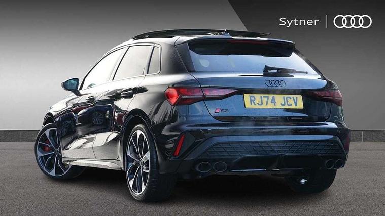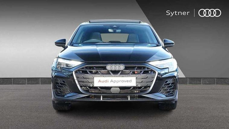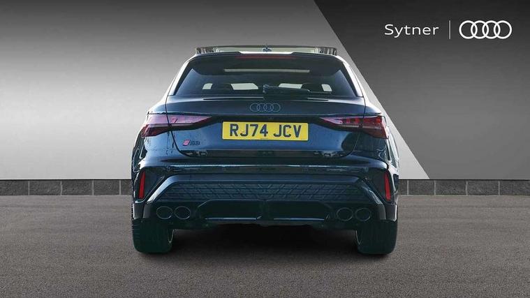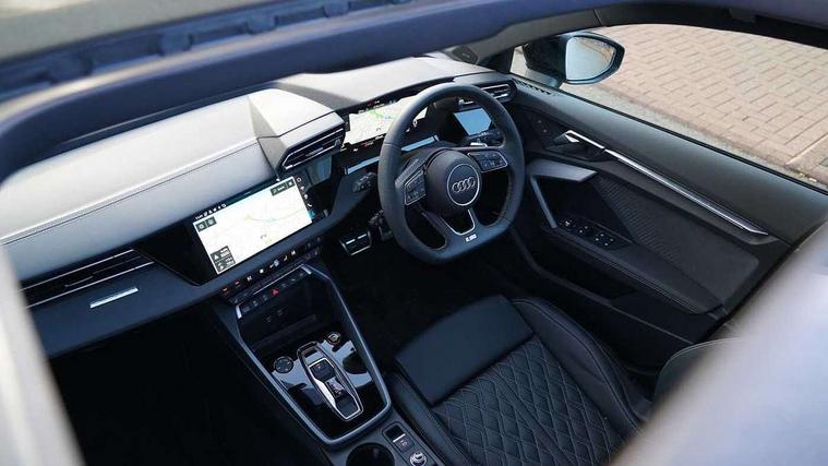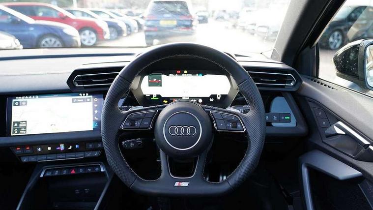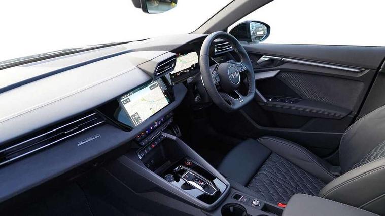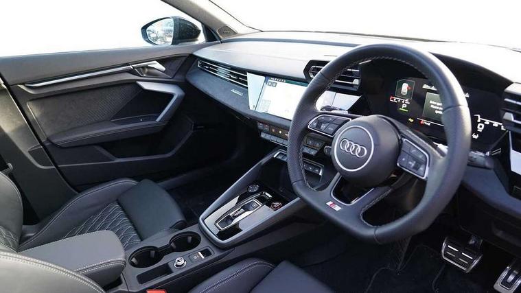 Adjustable speed limiter, Audi drive select, Audi smartphone interface with app store includes wireless Apple carplay, Android auto and Amazon alexa integration, Audi virtual cockpit plus - 12.3" full HD resolution dynamic digital instrument cluster, Automatic start/stop system with recuperation, Bluetooth interface, Camera based traffic sign recognition, Collision avoidance assistant, Distraction and Fatigue warning, e-Call (emergency call), Lane departure warning system, MMI Navigation Plus with high resolution 10.1" colour touch screen display, Park Assist with parking system Plus, Progressive steering, Service indicator, Tailgate, Trip computer, Voice control system with natural language interaction, Quattro permanent four wheel drive, S sport suspension with spring damper adjustment and lowering by 15mm, Audi Phonebox light with wireless charging, DAB Digital radio, USB ports with charging function in the rear, Anthracite grey Audi rings (front and rear), Audi Beam uses LEDs to project the rhombus S logo onto the ground as you exit your S3, Auto dimming frameless rear view mirror, Black accents front and rear bumpers including air inlets, Black accents in front grille and frame, Black accents window trims strips, Electrically adjustable/heated/folding/auto dimming door mirrors with integrated LED indications + kerb view function for passenger side, Exterior model badging, Front electric windows, Headlight washers, Heat insulating glass windscreen, Illuminated door sills with aluminium inserts at the front with S logo, LED 3rd brake light, LED daytime running lights, LED headlights with LED rear lights and dynamic rear indicators, Light and rain sensors, Privacy glass - dark tinted rear window, rear door and side windows, Rear electric windows, Rear side wing doors, Rear wiper, S grille, S3 front bumper with S specific air intake grilles, S3 roof spoiler, 12V socket and storage compartment in front centre console, 3 seat bench in 2nd row, 3 spoke flat bottomed leather multifunction sport steering wheel with gear shift paddles, 3-zone deluxe automatic air conditioning, 4 way electrically adjustable lumbar support for driver and front passenger, 40/20/40 split folding rear seat bench, Black cloth headlining, Fine Nappa leather upholstery with front sports seats S embossed logo, Front and rear centre armrest in artificial leather, Front and rear centre armrest in artificial leather with contrasting stitching on armrests and instrument panel, Front and rear headrests, Front/rear floor mats, Heated front seats, Height and reach adjustable steering wheel, Manual boot compartment lid, Manually adjustable front seats, Rear cup holders, S badging on the steering wheel, Seat side bolsters, Single front passenger seat, Stainless steel pedals and front footrest in black, Aluminium interior elements pack - A3 Sportback, Extended ambient lighting package Pro - S3 Black edition, Storage package - A3, Technology package - A3, 3x3 point rear seat belts, Driver and front passenger airbag with passenger airbag deactivation, Electronic Stabilisation Control (ESC) including ABS, ASR and EDL, First aid kit with warning triangle and 2 safety vests, Front side airbags with head airbags and interaction airbag, Hill hold assist, Pre-sense front with pedestrian and cyclist detection, Seatbelt monitoring, Tyre pressure loss indicator, Anti theft alarm, Anti-theft wheel bolts, Electronically operated child locks, Immobiliser, Remote central locking with safelock, Inlays in black dynamica microfibre, Tyre repair kit,