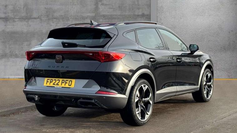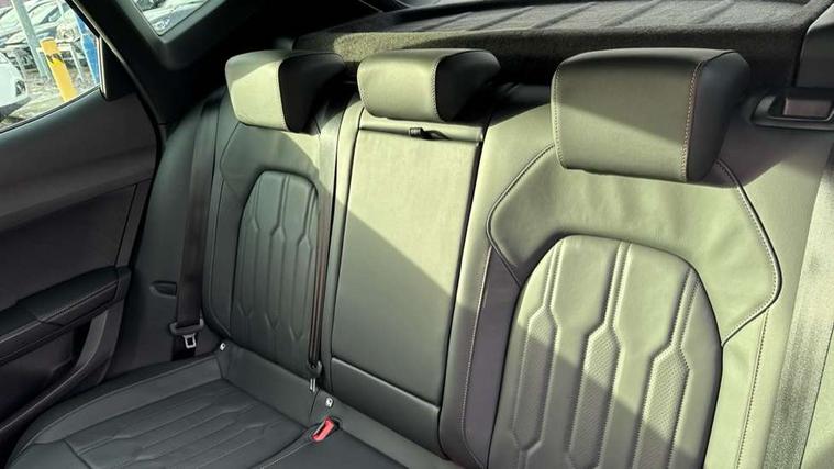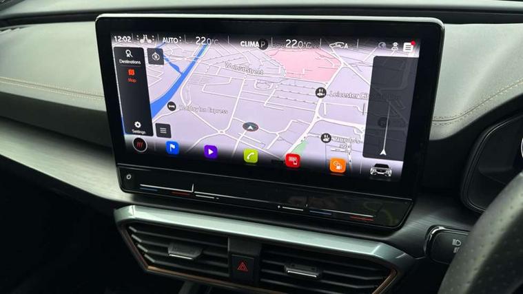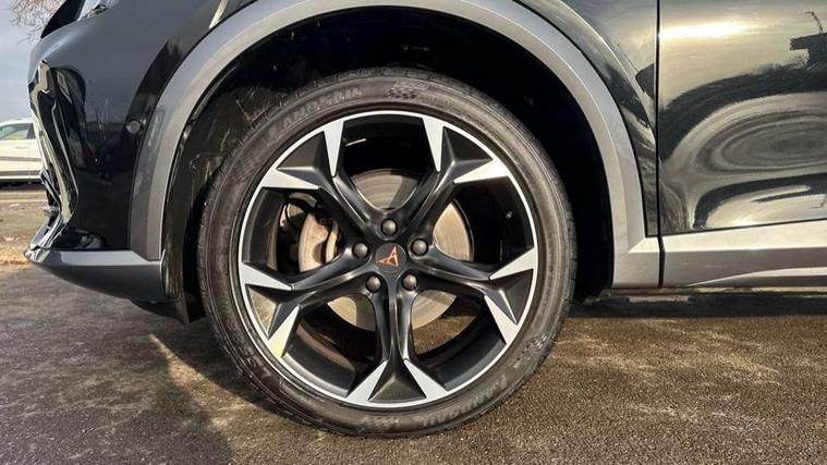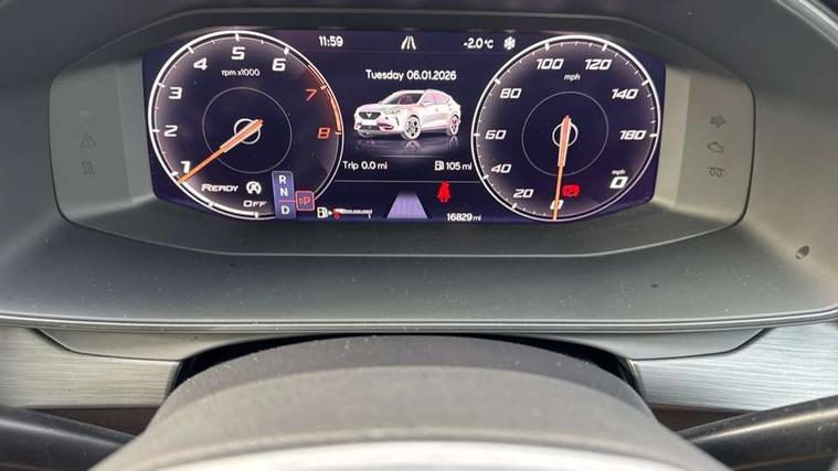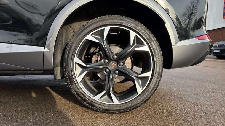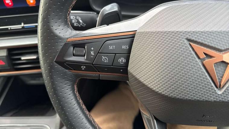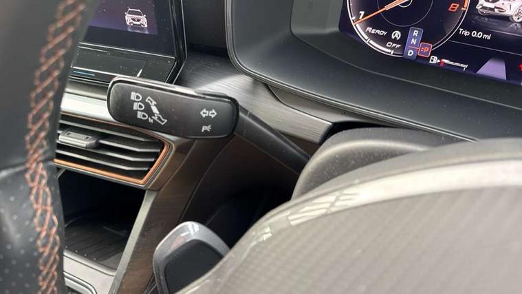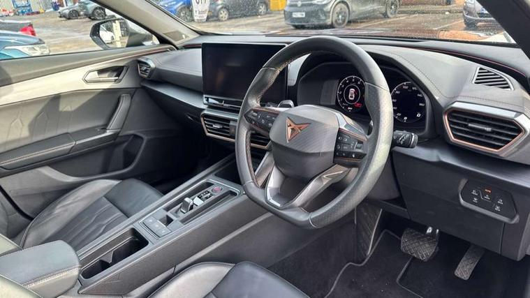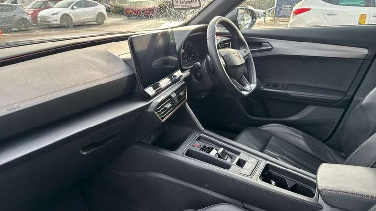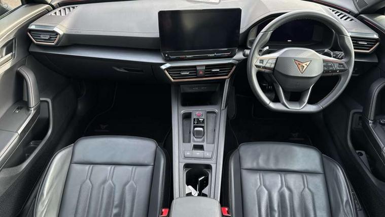 Digital cockpit and configurable dashboard, Driver alert system, Driving profile selection, E-call, Forward collision warning with automatic braking, Lane assist, Navigation system with 12'' Touchscreen Display, Park assist (inc front/rear parking sensors), PAS, Predictive adaptive cruise control with speed limiter, Rear view camera, RPM, trip computer, outside temp gauge, instrument light brightness, low fuel warning light, lights on reminder, gearshift indicator, Service interval indicator, Start/stop system with regenerative braking, Voice control system, Wireless apple carplay, Wireless phone charger, Electronic locking differential and dynamic traction support, Standard suspension, 2 front and 2 rear USB type C sockets, Auxiliary input socket, DAB radio, Auto dimming rear view mirror, Body colour door handles, Body coloured bumpers, Dark grey wing mirror, Daytime running light with automatic headlight control and coming home feature, Dynamic headlight range control, Electric front/rear windows, Electrically adjustable heated and folding door mirrors with memory function, Front fog lamps with cornering function, Gloss black roof rails and window surrounds, LED Headlights, LED Taillights with dynamic indicator, Rain sensing wipers, Rear diffuser with black simulated exhaust pipes, Rear side wing doors, Rear wash/wipe, Third brake light, Tinted rear windows, Welcome lights, 12v power supply in centre console, 12V socket, 12v socket in loadspace, 2 front and 2 rear reading lights, 230V socket, 3 seat bench in 2nd row, 60/40 split rear bench seat with armrest and mechanical seat release, Dust/pollen filter, Front and rear head restraints, Front centre armrest, Height/reach adjust steering wheel, Illuminated interior front door sills, Illuminated sunvisor with mirror, Isofix, Leather multi function heated steering wheel with gear shift paddles, Luggage tie-down hooks, Single front passenger seat, Three zone climate control with control panel in rear, Variable luggage/load compartment floor, Wraparound lighting, Genuine Nappa leather Pack - Cupra, 3 point seatbelts on all rear seats, ABS, Brake control system - ESC and brake booster, Child proof door locks, Driver and front passenger airbags with front passenger airbag de-activation, Electronic parking brake, Front and rear disc brakes, Front side curtain airbags, Hill hold control, Seat belt reminder for front and rear seats, Tyre pressure monitoring system, Anti theft alarm system, Keyless entry and start system (KESSY), Locking wheel bolts, Copper and aluminium interior detailing, 19" 'Exclusive' machined sport matte black and silver alloy wheels,