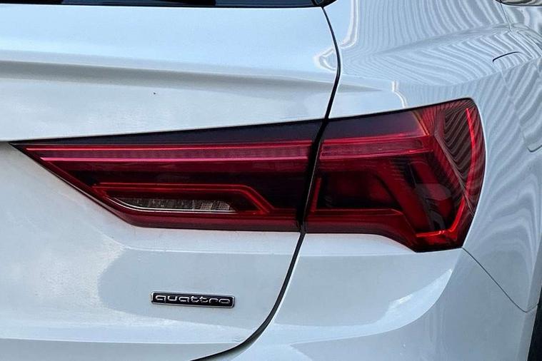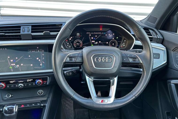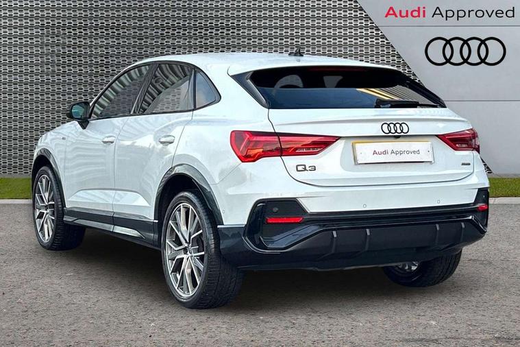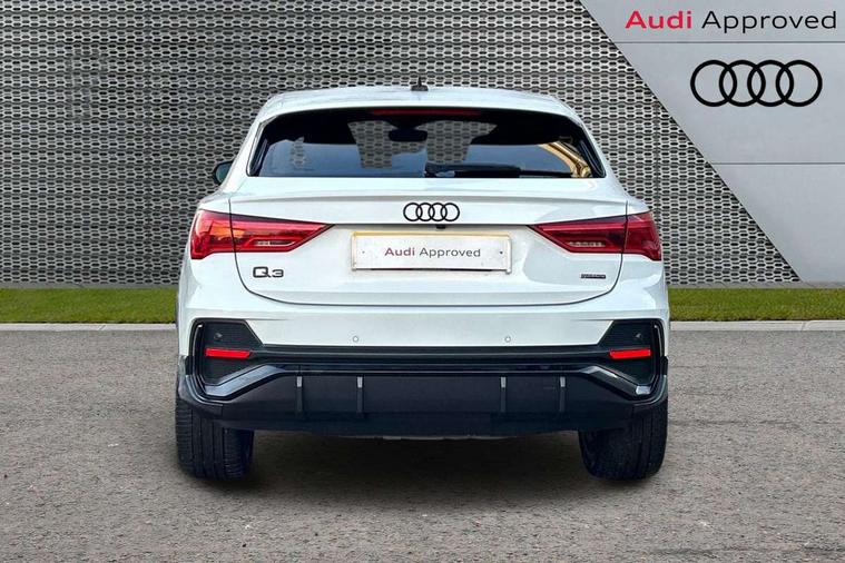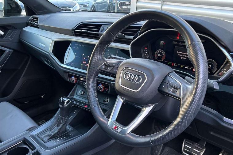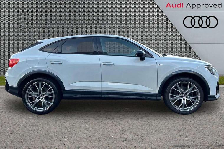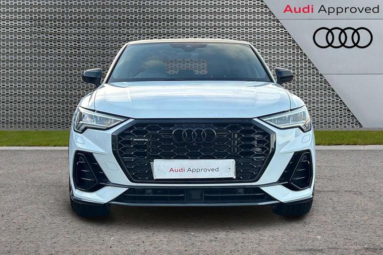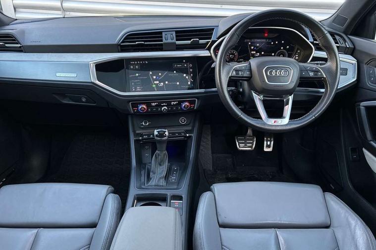 360 degree parking camera, Audi connect safety and service (e-call), Audi drive select, Audi lane departure warning, Audi virtual cockpit plus, Bluetooth interface, Camera based traffic sign recognition, MMI Navigation Plus with high resolution 10.1 inch touchscreen colour display, Power operated tailgate, Progressive steering, Rear cross traffic assist, Service interval indicator, Smartphone interface includes wireless Apple carplay/Android Auto, Start stop system with recuperation, Voice control system with natural language interaction, Adaptive suspension with damping control, 2 USB-C ports with charge and data functions, DAB digital radio module, SONOS premium sound system, Acoustic windscreen, Audi Beam uses LEDs to project Vorsprung logo, Auto dimming door mirrors, Auto dimming frameless rear view mirror, Bumpers and underbody protection in contrasting manhattan grey paint finish, Diffuser grille in grained matt black, Diffuser trim in selenite silver, Electrically folding, adjustable and heated door mirrors with integrated LED side indicators and kerb view function for passenger side, Front and rear electric windows, Front fog lights, Front side air inlets in selenite silver, Headlight washers, High gloss black finish B and C pillars, LED daytime running lights, Matrix LED headlights with LED rear lights and dynamic front and rear indicator, Panoramic opening glass sunroof, Privacy glass dark tinted rear and rear-side windows (from B-pillar backwards), Rain and light sensors, Rear underbody protection in matt black, 12V socket in rear centre console, 4 way electric lumbar support for driver and front passenger, 40:20:40 folding with manual adjustment for 60:40 forwards/backwards position and backrest angle, Adjustable rear seat bench/backrest with centre armrest and cupholder, Black cloth headlining, Dual zone electronic climate control, Electrically adjustable front seats, Front and rear black floor mats with contrast stitching, Front and rear headrests, Front and rear roof module including reading lights, Front centre armrest, Glove compartment lighting, Heated front seats, Height and reach adjustable steering wheel, Illuminated door sill trims with S logo, ISOFIX child seat mounting for front passenger with airbag deactivation and outer rear seat including top tether attachment point for outer rear seats, Leather steering wheel in 3-spoke design with multifunction plus and shift paddles, Luggage compartment light, Perforated leather gearknob, Stainless steel luggage compartment sill finisher, Stainless steel pedals, Black styling pack - Q3 Sportback Vorsprung, Driver Assistance Pack - Q3, Multi coloured extended ambient interior lighting pack - Q3, Non smoking pack - Q3, 3x3 point rear seatbelts, 6 airbags - Driver, front passenger, curtain and side windows, Audi pre-sense front with pedestrain and cyclist recognition, Electrically operated child locks on rear doors, Electromechanical parking brake, Electronic stabilisation control including ABS, ASR and EDL, Hill descent control, Hill hold assist, Pre sense basic, Seatbelt monitoring, Tyre pressure warning, Warning triangle and first aid kit, Advanced key, Anti theft alarm, Anti theft wheel bolts, Remote central locking, Black dashboard, Detail dashboard around MMI touch colour display in glass look, black with surround in aluminium look, Leatherette door armrest,