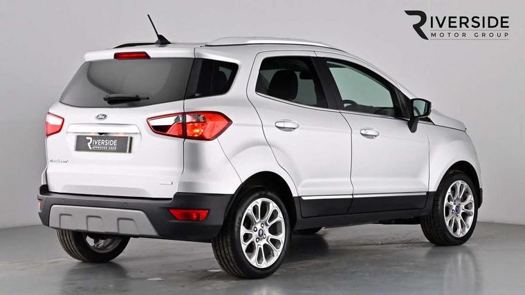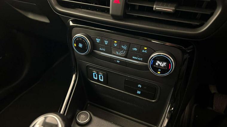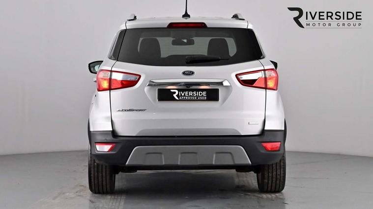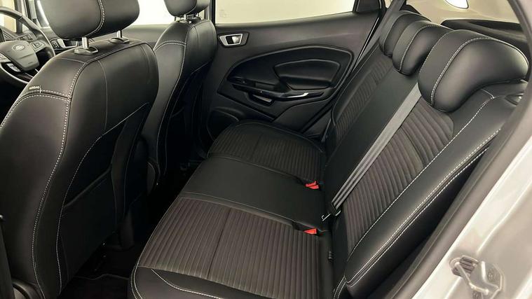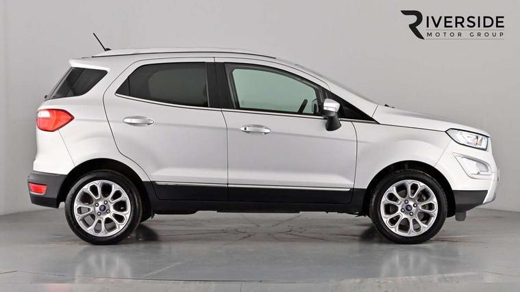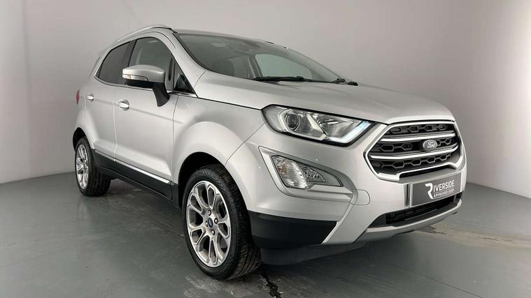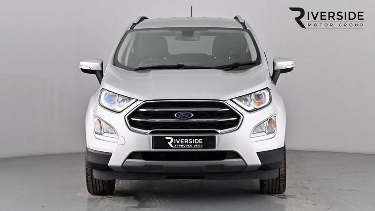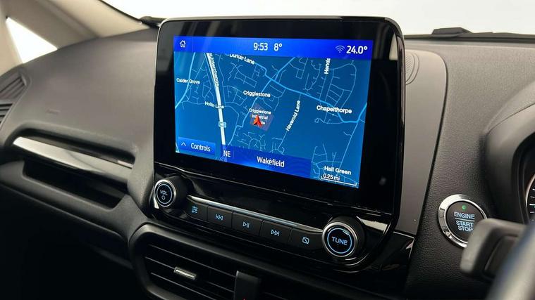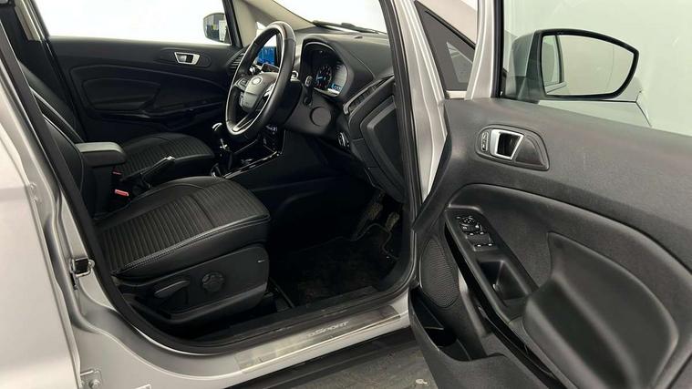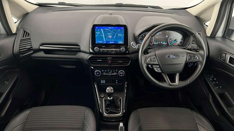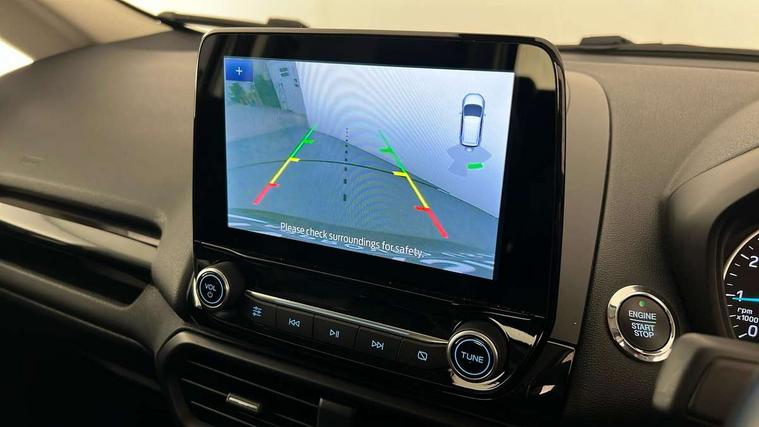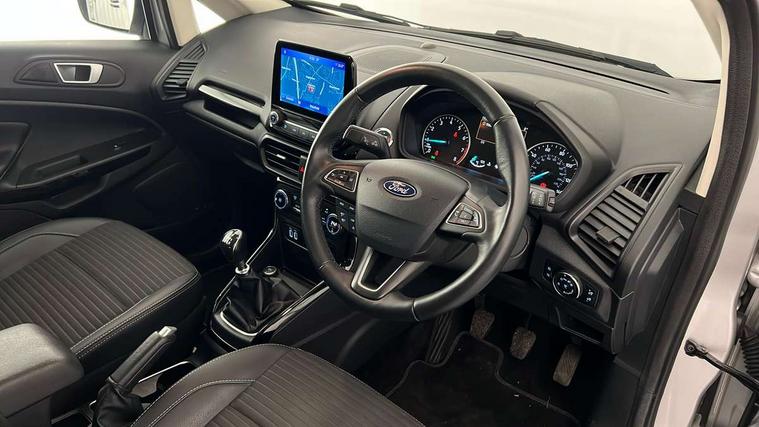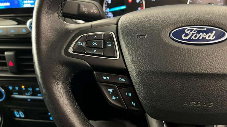 Cruise control, Easy fuel capless refuelling system, PAS, SYNC 3 nav system with DAB radio, 8" screen, voice control, emergency assistance, Apple car play/Android auto, 2x USB, Ford pass connect, Trip computer, 'Quickclear' heated windscreen/heated washer jets, Auto dimming rear view mirror, Automatic headlights, Body colour door handles, Body coloured bumpers, Electrically adjustable and heated door mirrors, Front door threshold plates, Front fog lights, Front grille with chrome trim surround, Headlamps with LED day running lights, Headlight levelling control, Power foldable door mirrors with puddle lights, Power front and rear windows with global opening/closing, Rain sensing front wipers, Rear wiper, 12V socket in front and rear, 60/40 split rear seats, 7 shade adjustable ambient lighting, Centre console with sliding front armrest, Cooled glovebox, Courtesy lights with map reading light, Driver seat height/lumbar adjust, Driver's side glovebox, Driver/passenger sunvisors and lidded vanity mirrors, EATC - Electronic Auto Temperature control, Folding grab handles, Footwell ambient lighting, Front head restraints, Front seat back map pockets, Front/rear floor mats, Groove cloth/leather upholstery, Illuminated glovebox, Illuminated luggage compartment, Isofix system on outer rear seats, Leather gear knob and handbrake grip, Leather steering wheel with audio controls, Luggage compartment carpet, Overhead console with sunglasses holder, Rake adjustable rear seats, Reach + rake adjustable steering column, Rear headrests, Steering wheel with chrome inserts, Storage drawers under front seats, Tie down hooks, Variable boot floor, Rear view camera pack - Ecosport, 3x3 point rear seatbelts, ABS, Child locks on rear doors, Curtain airbags, Driver airbag, Drivers knee airbag, Electronic Stability Programme with hill launch assist, Emergency brake assist, Front passenger airbag deactivation, Front side airbags, Passenger airbag, Seatbelt reminder for driver and front passenger, Traction control, Tyre pressure monitoring system, Immobiliser, MyKey system, Remote central locking, Thatcham 1 volume sensing alarm, Tyre inflation kit,