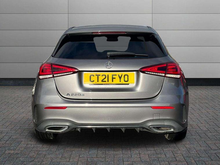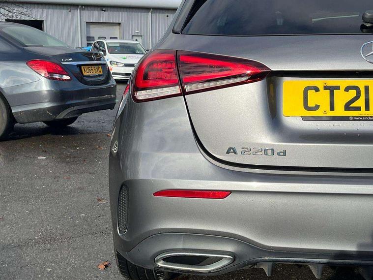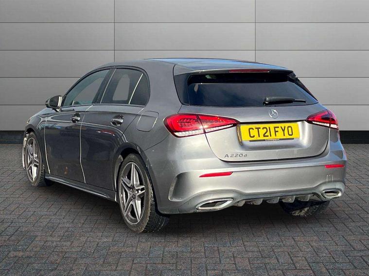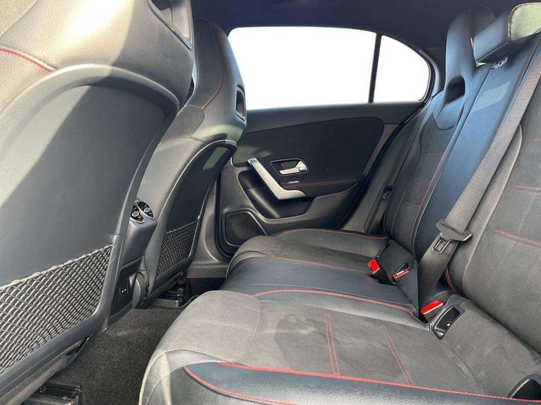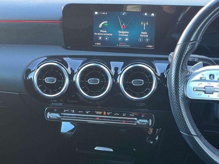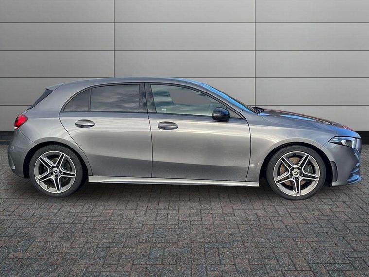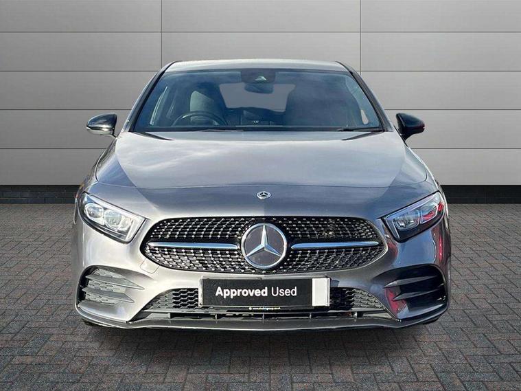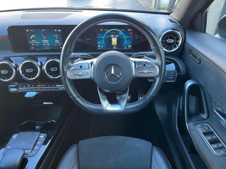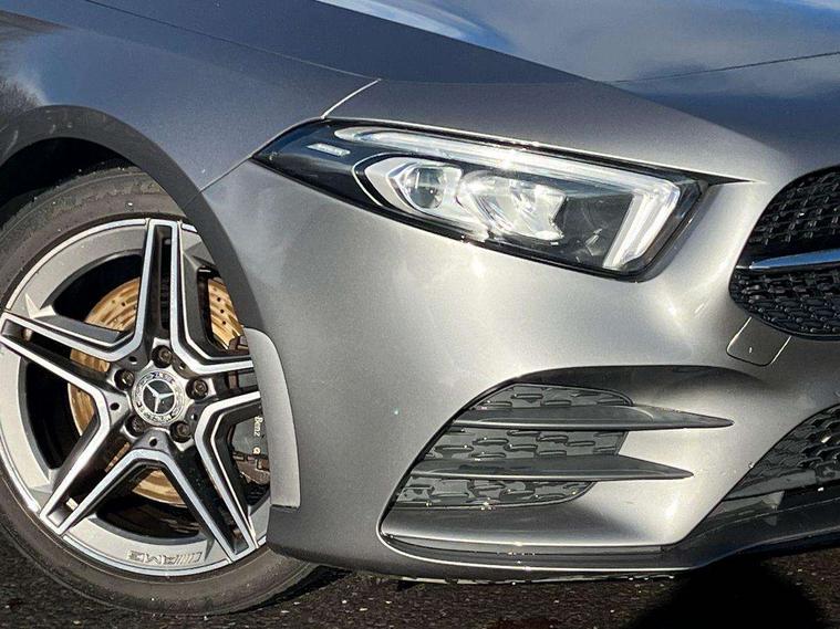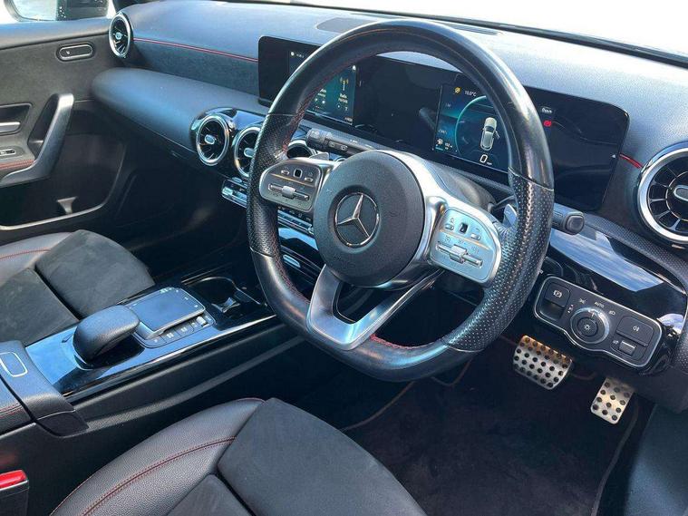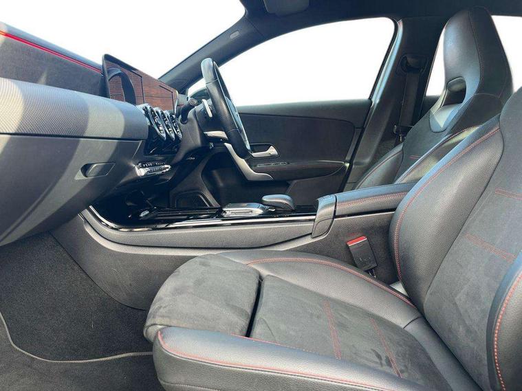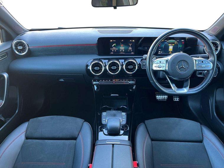 180 degree rear view camera with parking guidelines, 7" colour screen in instrument panel, 7" touchscreen media display, Attention assist, Brake pad wear indicator warning light, Car wash mode, Cruise control + speed limiter, Direct steering, Dual bluetooth interfaces, DYNAMIC SELECT with a choice of driving modes (ECO, Comfort, Sport and Individual), ECO start/stop function, Fluid level warning indicator for fuel, oil, coolant and washer fluid, Hard-disk navigation, Hey Mercedes Voice activation, Lamp failure indicator, Mercedes me connect including emergency call system, accident recovery, breakdown and maintenance management, Mercedes me remote services, Outside temperature gauge, Owners manual in English, Pre-installation for private car sharing, Preinstallation for Mercedes Benz link, Service indicator (ASSYST), Speed sensitive power steering, Trip computer, Lowered comfort suspension, Rear axle multi-link, 2 USB ports (type C) in rear stowage compartment and one in front of center console, 6 speakers, DAB Digital radio, MBUX multimedia system with DAB digital radio and touchpad including satellite navigation, Mercedes-Benz sound system - 100W, 4 Electric Front and Rear windows, Adaptive brake lights, AMG bodystyling - Front apron with splitter in chrome, rear apron with chrome trim and chrome visible trim elements in tailpipe, Black weather strip, Body colour bumpers, Body colour door handles, Body colour side skirt, Body coloured door mirrors, Chrome beltline trim, Diamond radiator grille with chrome pins and silver louvre + chrome insert, Electric adjustable and heated door mirrors with integrated LED side indicators, Exhaust system - Twin visible tailpipes in polished stainless steel, Headlamp assist automatic headlamp activation, Heated glass rear windscreen + timer control, LED high performance headlamps with integrated LED daytime running lights, LED tail lamp, LED third brake light, Privacy glass, Radio aerial, Rain sensing windscreen wipers with two sensitivity settings, Rear fog lights, Rear wiper, Window line trim strip in chrome, 3 Spoke flat bottom leather multi function steering wheel with perforated leather in grip area, 40:20:40 split folding rear seats, Artico man-made leather/Microfibre Dinamica upholstery with red contrast stitching, Auto Mercedes-Benz child seat recognition sensor, Black air vents with surround in silver chrome, Black roof lining, Brushed stainless steel sports pedals with rubber studs, Controller on centre console with chrome surround, Floor mats with stitched edging and AMG lettering, Front centre armrest with storage compartment, Front door sills with Mercedes Benz lettering, Front seat backs luggage nets, Front seat cushion length adjustment, Galvanished gear shift paddles on steering wheel, Heated front seats, Height/reach adjustable steering column, Interior mirror with reading lamps in black and frameless, Manual height adjustable front seats, Rear head restraints, Seat occupancy sensor for front passenger seat, Sports seats with integrated headrests, Stowage compartment in centre console with retractable cover, Sunvisors with illuminated vanity mirrors, Touchpad on center console, Twin front cupholders, Two zone thermotronic luxury automatic climate control, Light and sight pack - A Class, Seat comfort pack - A Class, 3 rear 3 point seatbelts, ABS with Brake Assist, Active bonnet, Active brake assist includes forward collision warning system with autonomous braking, Adaptive brake assist with hold function and hill start assist, Black seatbelts, Childproof locks manually operated for rear doors and electrically operated for rear power windows, Crash responsive emergency lighting, Driver and passenger head and side airbags, Drivers knee airbag, Dual stage driver/passenger airbags, Electronic parking brake, ESP curve dynamic assist, ESP with ASR, Front and rear seatbelt reminder, Front brake callipers with Mercedes Benz lettering, ISOFIX and top tether child seat fixing points in two outer rear seats, Tyre pressure monitoring system, Warning triangle and first aid kit, Window airbags, Alarm system/interior protection/immobiliser, Keyless Go, Remote central locking and crash sensor with emergency opening function, Urban guard vehicle protection system with immobiliser and interior protection, Dinamica microfibre trim in black, 18" AMG 5 twin spoke light alloy wheels in titanium grey with highsheen finish, Summer tyres, Tirefit sealant kit,