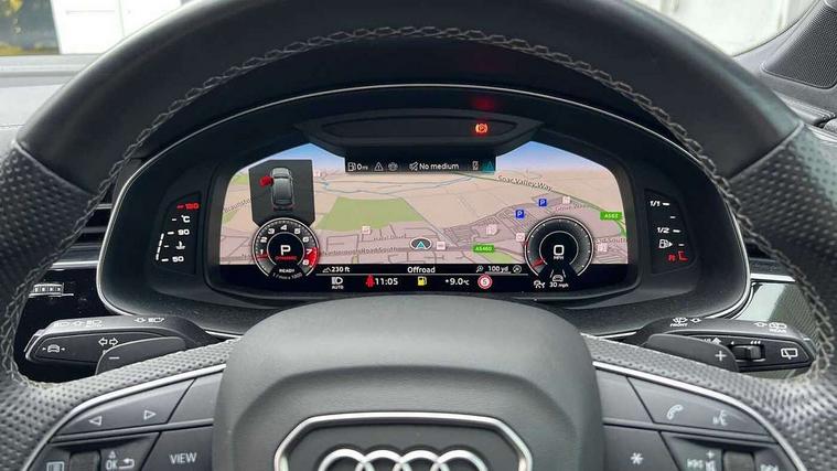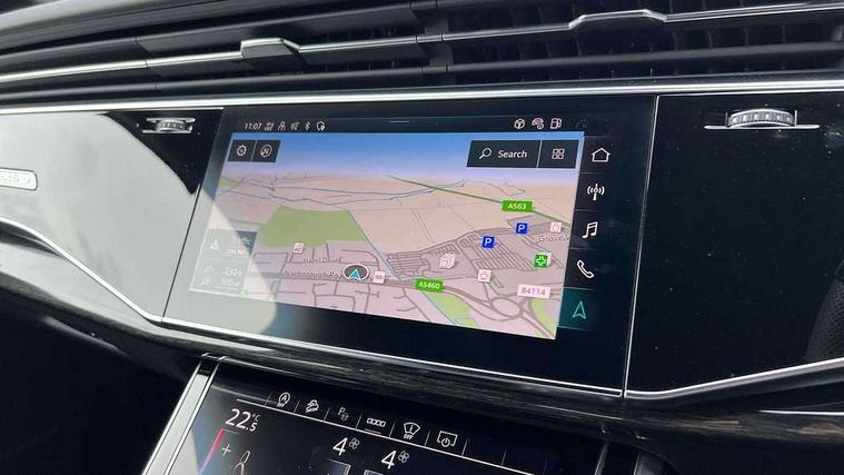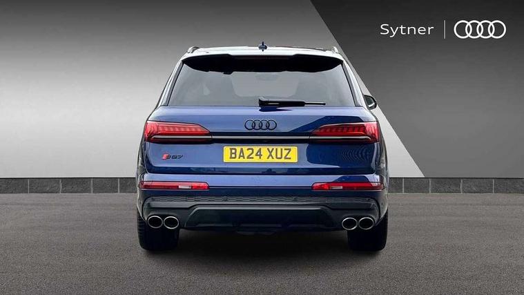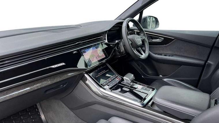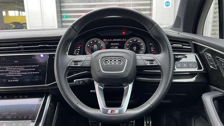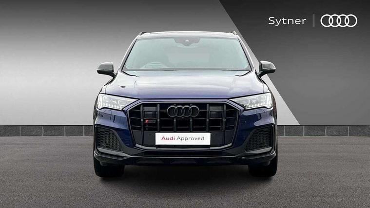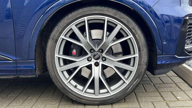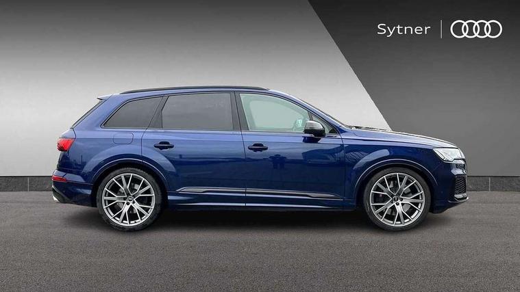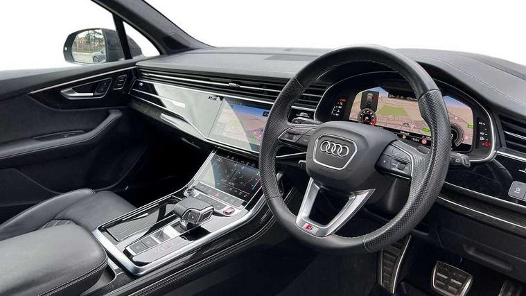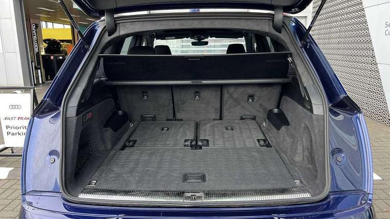 360 degree view camera, Audi connect safety and service (e-call), Audi connect with Amazon Alexa Integration, Audi drive select (Auto, Comfort, Dynamic, Efficiency, Individual, Off-road and All road), Audi phone box light with wireless charging, Audi virtual cockpit plus, Bluetooth interface, Camera based traffic sign recognition, Head up Display, MMI navigation plus with MMI touch screens includes 10.1" and 8.6" screens with haptic feedback, Natural voice recognition, PAS, Power door closure, Power operated tailgate, Smartphone interface includes wireless Apple carplay/Android Auto, Start/stop system, 48V Mild hybrid technology, 85 litre fuel tank, Electromechanical active roll stabilisation, Quattro all wheel drive with self locking centre differential, Quattro with sport differential, S specific adaptive air sport suspension, Audi music interface - front 2 USB-C ports with charger and data functions, Bang + Olufsen premium sound system, DAB digital radio module, 3rd brake light, Adaptive windscreen wipers with integrated washer jets, Audi Beam uses LEDs to project Audi logo onto the ground as you exit your SQ7, Audi HD matrix LED headlights with Audi laser light + dynamic front and rear indicators, Auto dimming frameless rear view mirror, Black roof rails, Electrically adj heated/folding + automatically dimming exterior mirrors with memory + automatic kerb side function for passenger side exterior mirror, Gloss black finish for exterior Audi rings and SQ7 logos, Headlight washers, Heat insulating glass in windshield, Integrated LED indications in door mirrors, LED daytime running lights, LED rear tail lights, Privacy glass - dark tinted rear and rear side windows from B-pillar backwards, Rear side wing doors, Rear wiper, S specific rear bumper with 4 exhaust pipes, 2 seat bench in 3rd row, 3 seat bench in 2nd row, 3 spoke heated leather multi-function sport steering including paddle shift, 4 zone deluxe automatic climate control, 7 seat layout with ISOFIX points for the front passenger seat and rear passenger seat, Ambient lighting in surfaces and edges, Black dinamica headlining, Comfort front centre armrest, Contour lighting accentuates lines and joint contours, Double sun visors with illuminated vanity mirrors, Electric adjustable front seats/backrest bolsters, lumbar support, memory functionality, Electric steering wheel adjustment, Folding rear seats, Front head restraints, Front/rear floor mats, Heated front seats, Illuminated door sill trims with S logo, LED glare-free lights, Luggage compartment sill protection in stainless steel, Manual sunblind for the rear side windows and manual sunblind for the rear window, Rear head restraints, Seat ventilation and massage function in the front, Single front passenger seat, Stainless steel pedals, Valcona leather upholstery with front super sport seat S embossed logo, Anthracite black styling pack - Q7/SQ7, City assist pack - Q7, Extended leather pack - SQ7, Technology Pack Pro S - SQ7, Tour pack with Adaptive cruise assist - Q7, 3 point seatbelts on all rear seats, Audi pre sense front, Child locks on rear doors, Driver and front passenger, front side and curtain airbags, Electromechanical parking brake, Electronic Stabilisation Control (ESC) including ABS, ASR and EDL, Extended pedestrian protection measures, Hill hold assist, Seatbelt monitoring, Tyre pressure loss indicator, Warning triangle and first aid kit, Anti theft alarm, Anti-theft wheel bolts and wheel loosening detection, Remote central locking, 22" 5-V Spoke aluminium star design audi sport matt grey with gloss turned finish alloy wheels, Tool kit, Tyre repair kit,