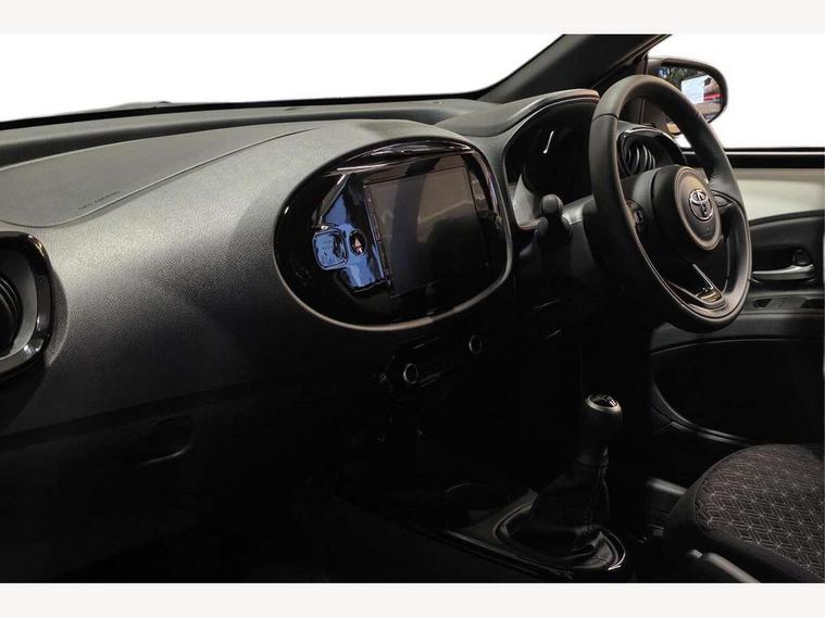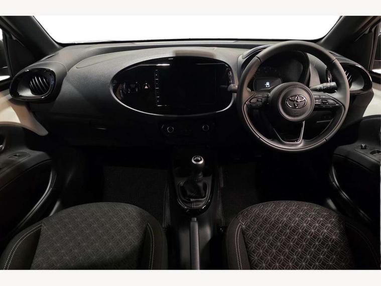 4.2" TFT colour screen, Adjustable speed limiter, Analogue speedometer, Bluetooth connectivity, Digital tachograph, Driver attention alert system, eCall emergency call system, Electric power steering, Intersection turn assist, Key reminder warning, Noise reduction kit, Pre collision system with emergency steering assist, Reversing camera with static guide lines, Smart phone integration with Apple car play/Android Auto, Speed limit display, Start and stop, Vehicle Stability Control (VSC), 4 speakers, 9" HD multimedia display touch screen with Toyota smart connect, DAB digital audio broadcast, USB connector, Auto headlights, Auto wipers, Automatic headlights cut-off, Bicycle towing hook, Black contrast roof, Black side protection mouldings, Black wheel arch mouldings, Body colour door handles, Body coloured front bumper, Boot door scuff plate, Eclipse black rear bumper, Electric heated door mirrors, Follow me home headlights, Front fog lights, Front power windows, Gloss black door mirrors, Gloss black upper front grille, Headlight cut-off reminder, LED daytime running lights, LED front light guide, LED High mounted stop lamp, Manual day/night rear view mirror, Manual headlight levelling, Pagoda roof, Power adjustable door mirrors, Power back door, Privacy glass, Projector halogen headlights, Rain sensor, Rear combination lights LED bulb type, Rear side wing doors, Rear windscreen defogger, Rear windscreen wiper, Short antenna, Variable intermittent windscreen wipers, 12v power outlet - front, 2 seat bench in 2nd row, 3 spoke leather steering wheel, 50/50 split folding rear seat, Adhesive roof headlining, Adjustable speed limiter switch on steering wheel, Audio and telephone switches on steering wheel, Auto air conditioning, Black insert on steering wheel, Black roof lining, Boot light, Centre room light, Chrome interior door handles, Chrome surround on air conditioning buttons, Clean air filter, Console box storage in body color, Fabric upholstery, Floor mats, Front and rear cup holders, Front head rest deco art, Front head restraints, Height adjustable driver seat, Intelligent adaptive cruise control switch on steering wheel, ISOFIX child restraint system on rear seats, Lane departure alert switch on steering wheel, Leather gearshift knob, Manual tilt steering wheel, Manually reclining and sliding driver seat, Manually reclining and sliding front passenger seat, Multimedia switches on steering wheel, Pollen filter, Rear door pockets, Rear head restraints, Satin silver insert on gear shift knob, Single compartment glovebox with lights, Single front passenger seat, Soft tonneau cover, Sun visors with mirror on driver and passenger side, Voice recognition switch on steering wheel, Toyota safety sense pack - Aygo X, Anti lock braking system + Electronic brake force distribution, Child safety door lock, Emergency brake light signal (EBS), Hill start assist control (HAC), Passenger airbag on/off switch, Seat belt reminder for front and rear seats, Supplement restraints system (SRS) - 6 airbags, Traction control, Tyre pressure warning system, Immobiliser, Remote power door locks, Black wheel centre caps, Tyre repair kit,