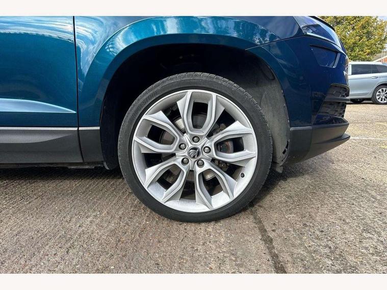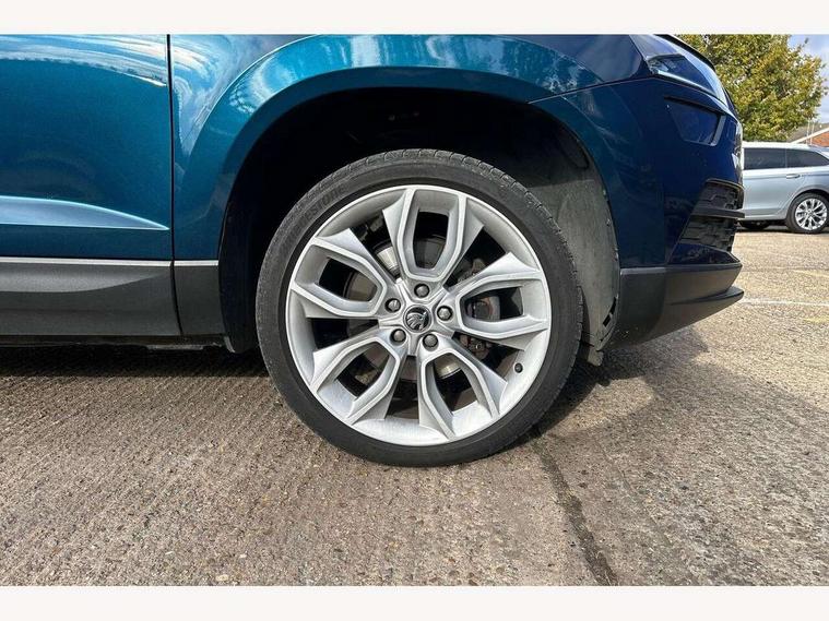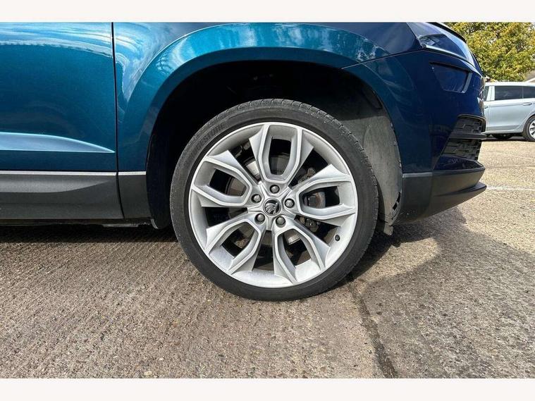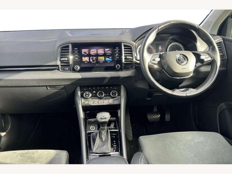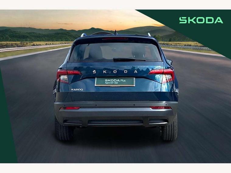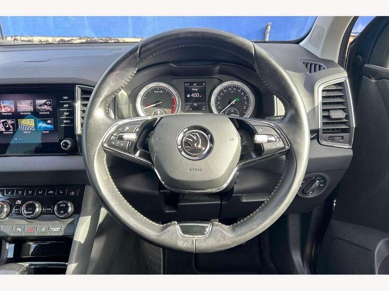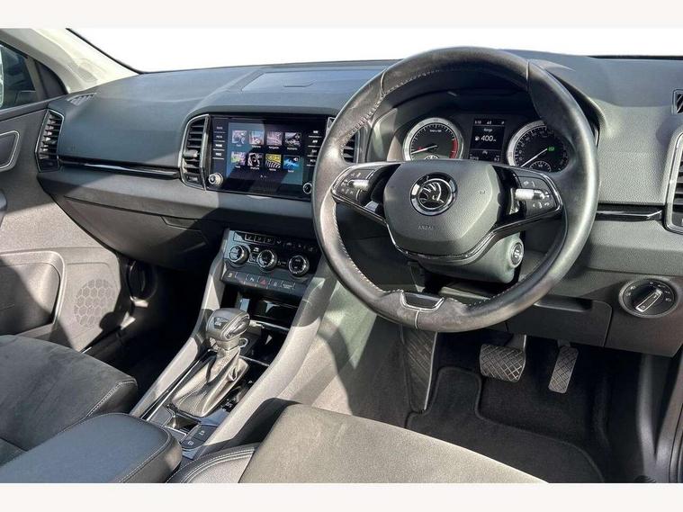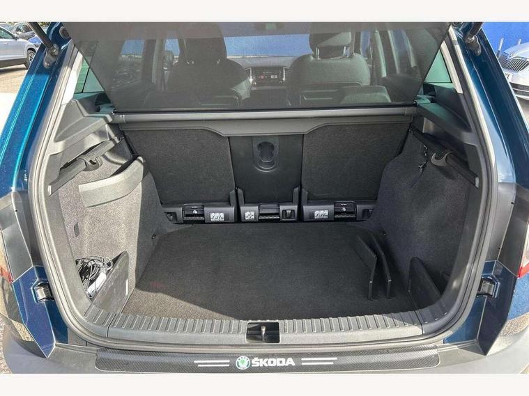 Care connect, Drive mode selector, Driver alert system, Driver fatigue sensor, Driver profile selection, Multifunction colour trip computer, Outside temperature gauge, Rear view camera, Service interval indicator, SmartLink + wireless for Apple and wired for Android, Start/stop system with regenerative braking, USB C Port x 2 in front centre console, DAB radio with Bluetooth, SD card slot, USB connection, Acoustic glass, Aero front windscreen wipers with intermittent function, Automatic headlight control system, Black electric window control buttons, Body colour door mirrors and handles, Body coloured bumpers, Electric front and rear windows with child proof lock, Full LED headlights + adaptive front light system + LED daytime running lights and front cornering fog lights, Headlight washers, Heated rear windscreen, LED rear lights with high functionality, Light assistant (coming/leaving home/tunnel light), Privacy glass, Safety reflectors on front doors, Third brake light, 1.5 litre bottle holders in driver and front passenger door panels, 12V socket in boot, 12v socket in front centre armrest with storage compartment and rear air vents, 2 Folding hooks and nets in boot, 2 Front readings lights for driver and passenger, 3 rear height adjustable headrests, 4 foldable roof handles with rear coat hooks, 4 lashing points on luggage floor, Backrest release, Cargo elements in boot, Chrome inner door handles, Folding tables on the front seat backrests, Front head restraints, Front seat and rear pockets, Height adjustable front three point seats belts with tensioners, Height adjustable passenger seat, Height/reach adjust steering wheel, Ice scraper, Illuminated and cooled glovebox, Illuminated luggage compartment, Isofix child seat preparation outer rear, Net programme in boot, Pen holder, Pollen filter, Rear boot cover, Rear reading lights, Rear seats fixed folding and divided 60:40, Retractable parcel shelf attachable to tailgate, Safety vest holder, Storage box in upper central dashboard closed, Storage compartment below the passenger seat, Sunvisors with illuminated vanity mirrors, Textile floor mats, Umbrella under passenger seat, VarioFlex seats with retractable parcel shelf, Chrome roof rails + chrome pack - Karoq, Airbags - Front side, head, knee and curtain, Automatic door unlocking in case of crash, Automatic fuel cut off in case of crash, Driver airbag, Electronic parking brake with auto hold function, Emergency rear braking signal, ESC including ABS, MSR, ASR, EDS, HBA, DSR, RBS, MKB and traction control, Front assist radar scanning of the space in front of the car with automatic braking, Hill hold control, Passenger airbag with switch-off function, Pedestrian monitor, Seatbelt reminder signalisation and pretensioner for all seats, Three point seatbelts rear, Two tone horn, Tyre pressure display, Tyre pressure monitor, Alarm with interior monitoring, back up horn and tilt sensor with safe function, Electronic engine immobiliser, Keyless entry and keyless start with safe system, Remote central locking with 2 remote folding keys, Chrome framed air vents, 19" Crater alloy wheels with anti theft wheel bolts, Storage on wheel cover,