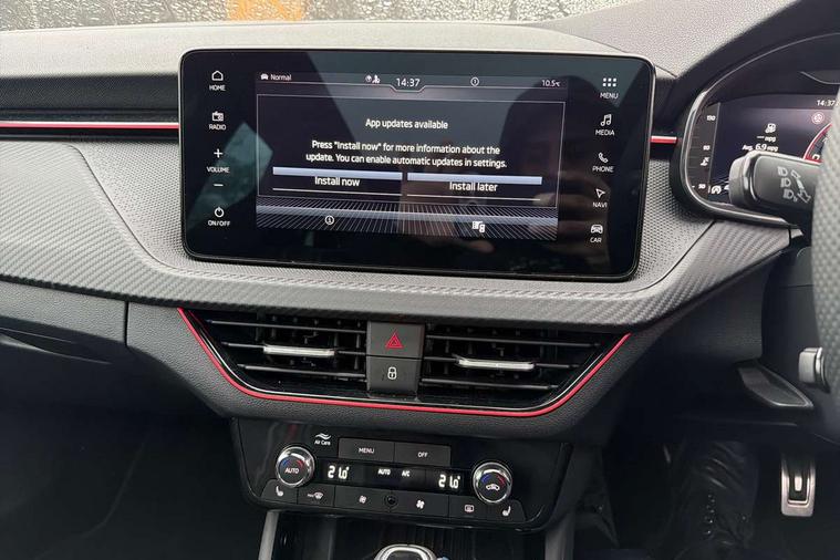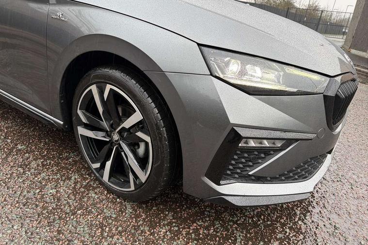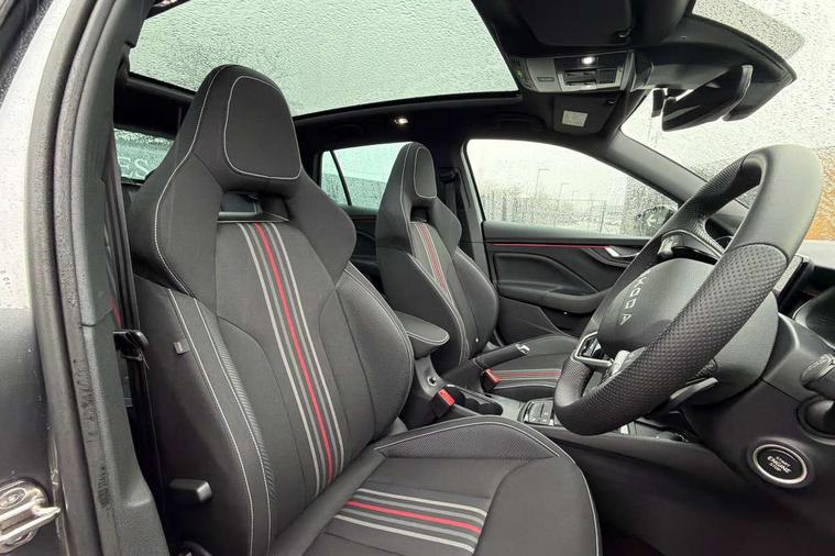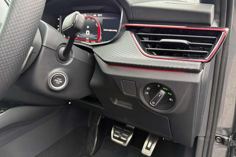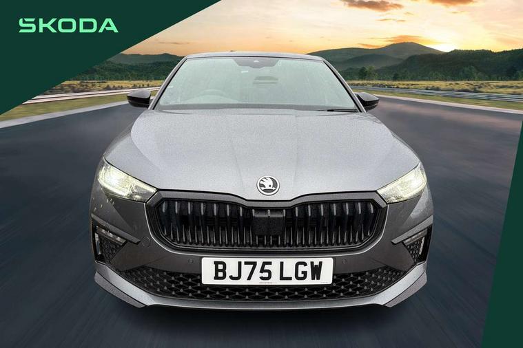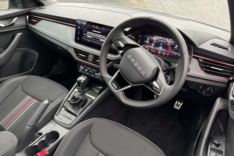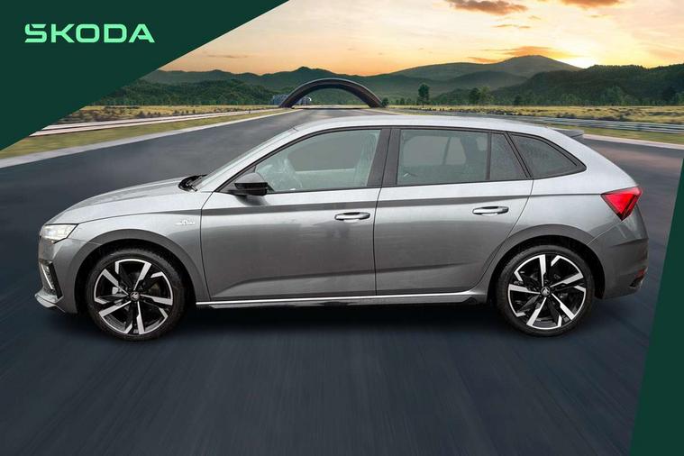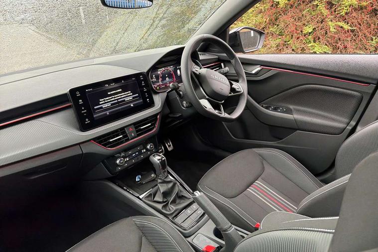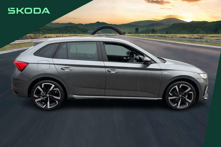 Advanced driver attention and drowsiness monitor, Bluetooth, e-Call (emergency call), Front assist system, PAS, Rear parking sensors, Rear view camera, Speed limiter, Tailgate, Traffic sign recognition, Virtual Cockpit - 10.25" digital display, Voice control system, Wireless smartlink, Drive mode select with Sport Chassis Control and ECO mode, 4 USB C ports, 8 Speakers, 9.2" Skoda navigation display, DAB radio, Auto dimming rear view mirror, Automatic headlight control with manual coming and leaving home feature, Automatic intermittent wipers, Black door mirrors, Black lettering on boot lid, Black radiator grille, Black rear diffuser, Black roof spoiler, Black window frames, Body colour bumpers, Body colour door handles, Extended tailgate glass, Front and rear electric windows, Heated rear window, LED 3rd brake light, LED daytime running lights, LED high beam, LED low beam, Light sensors, Monte carlo plaque, Panoramic glass roof, Privacy glass, Rear LED fog light, Rear side wing doors, Rear wiper, Tinted windows, Unique dark chrome design logo on alloy wheels, 12V socket in luggage compartment, 3 seat bench in 2nd row, Aluminium pedals, Ambient lighting in white/red, Black / White armrest stitching, Black roof headlining, Cargo elements, Chrome inner door handles, Door inserts in art.leather carbon, Driver and passenger sun visors with vanity mirror, Dual zone climate control, Front and rear roof lights, Front centre armrest, Front head restraints, Height adjustable driver seat, Height adjustable passenger seat, Ice scraper, Illuminated glove compartment, Inner circulation control with pollen filter, ISOFIX for front passenger seat, Isofix preparation for back seats, Leather gearknob and handbrake lever, Luggage net under rear parcel shelf, Manual lumbar support for front seats, Monte Carlo cloth upholstery, Net package and top tether hooks in boot space, Pocket on the back of both front seats, incl. mobile phone pockets, Rear centre armrest, Red hotstamping, Single front passenger seat, Skoda lettering on steering wheel, Sport seats, Textile floor mats, Third rear headrest, Ticket holder, Top tether for front passenger seat, Umbrella in driver's door, Light and view plus pack - Scala, 3x3 point rear seatbelts, ABS, Child locks, Curtain airbags and front side airbags, Disc brakes, Driver and front passenger airbags, ESP, Hill hold control, Manual leather parking brake, One tone horn, Passenger airbag switch off function, Seatbelt reminder for driver and front passenger, Tyre pressure monitoring system, Anti theft alarm system with interior monitoring, backup horn and towing protection, Anti-theft wheel bolts, Remote central locking with 2 remote folding keys, SAFE function for remote central locking, Carbon effect decorative inserts, 18" Ursa black diamond cut alloy wheels,