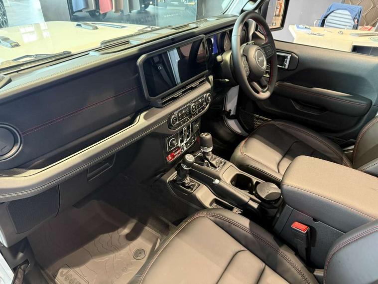 Active speed limiting device, Adaptive cruise control with Stop and Go, Apple car play/Android Auto, Audio Jack Input For Mobile Devices, Blind spot detection with rear cross path, Connected services (e-call), Drowsy driver detection, Emergency response assistance system, Exterior temperature gauge, Global positioning system(GPS), Instrument cluster with 7" colour TFT Display, Integrated Offroad camera, Jeep mapcare, Lane departure warning, Off road plus mode, Parksense front and rear park assist system, Power Steering, Select speed control, Trip computer, Vehicle information centre, 4.10 Rear axle ratio, 700 Amp Maintenance Free Battery, Dana M210 Heavy Duty Tube Front Axle, E-Locker rear axle, Electronic front sway bar disconnect, Electronic roll mitigation, Gasoline particulate filter, Heavy duty rock slider with step assist, Performance suspension, Rock-Trac Hd full time 4Wd system, Alpine premium audio system with subwoofer, Global telematics box module (TBM), Media Hub (SD, USB, Aux), Remote USB port, Steering wheel mounted audio controls, Uconnect 5 Nav with 12.3" Display, USB port A in second row, Auto dimming rear view mirror, Auto high beam, Auto high beam headlamp control, Automatic headlamp levelling, Automatic headlights, Black 3-Piece Hard Top, Black door handles, Black door mirrors, Black fuel filler door, Black hood decal, Centre high mounted stop light, Deep tint sunscreen glass, Exhaust system module, Exhaust system module Ii, Gorilla Glass, Headlamp off time delay, Heated rear window, Injection molded black front and rear bumpers, LED daytime running lights, LED front fog lights, LED Lowbeam, Halogen highbeam headlights, LED tail lamp, Molded-In-Colour Fender Flares (2-Pc), Power adjustable heated door mirrors, Power front windows with one touch, Rain sensor, Rear boot, Rear fog lamps, Rear side wing doors, Rear wiper, Side repeater flashers, Tinted windshield, Tow hooks, Trailer sway damping, Windshield wipers with intermittent and variable, Wrangler decal, 12V auxiliary power outlet in centre console, 12V auxiliary power outlet in rear, 3 seat bench in 2nd row, 4 way electric driver lumbar support, 60/40 split folding rear seat, 8 way electrically adjustable front seats, Auto temp controlled air conditioning, Bright interior accents, Centre console storage, Driver/passenger front seatback pockets, Floor + luggage area carpets, Freedom panel storage bag, Front centre armrest, Front headrests, Hardtop headliner, Headliner parts module, Heated front seats, Heated steering wheel, Illuminated front cupholders, Isofix child seat preparation, Leather wrapped gear shift knob, LED ambient lighting, Lockable glovebox, Nappa leather upholstery, Passenger assist handles, Power passenger lumbar adjust, Premium leather wrapped steering wheel, Rear compartment storage system, Rear luggage cover, Reclining front seats, Red switches, Single front passenger seat, Storage nets, Storage trays, Sunvisors with illuminated vanity mirrors, Three rear seats with head restraints, Tilt adjustable steering column, Smoker's pack - Wrangler, 3x3 point rear seatbelts, ABS, Anti lock 4-Wheel function Disc Hd Brakes, Driver / front passenger multi stage airbags, Electronic stability control, Front and rear side curtain airbags, Front driver/passenger side impact air bag system, Front side airbags, Full speed forword collision warning plus advanced brake assist, Hill start assist, Rear door child safety locks, Rear passenger seatbelt alert, Rear seat reminder alert, Selectable tyre fill alert, TPMS (Tyre pressure monitoring system), Traction control, Vehicle Dynamics Control System (VDC), Keyless entry, Keyless go with 'push to start' button, Locking fuel filler cap, Locking wheel nuts, Passive entry, Premium security alarm, Thatcham security equipment, Premium door trim panel, 17" alloy aluminium painted machine faced wheels with blue pad, Conventional spare tyre, Spare tyre cover, Tool kit,