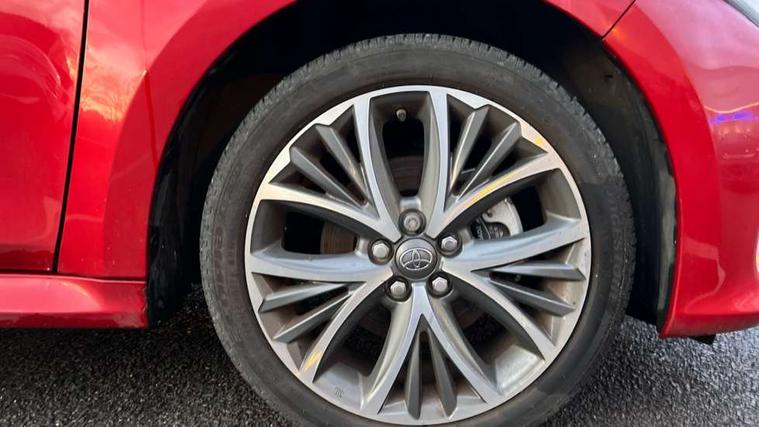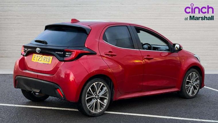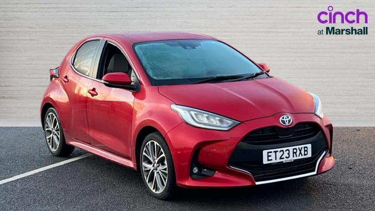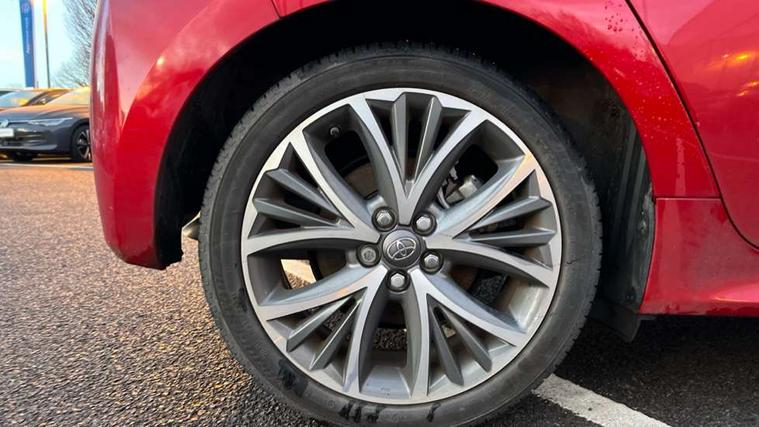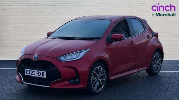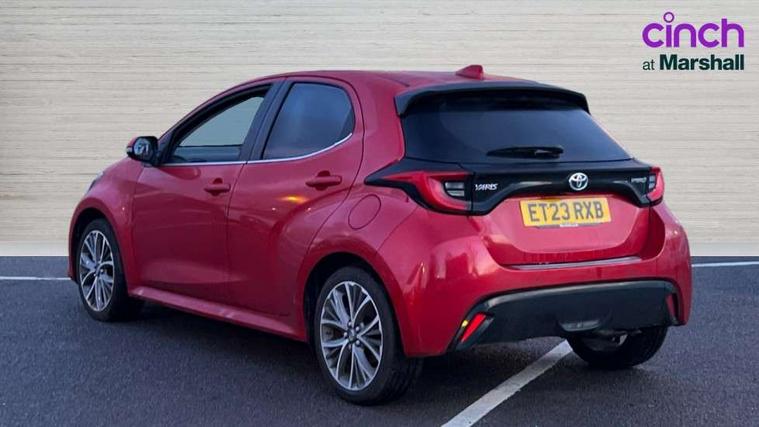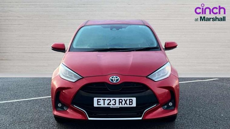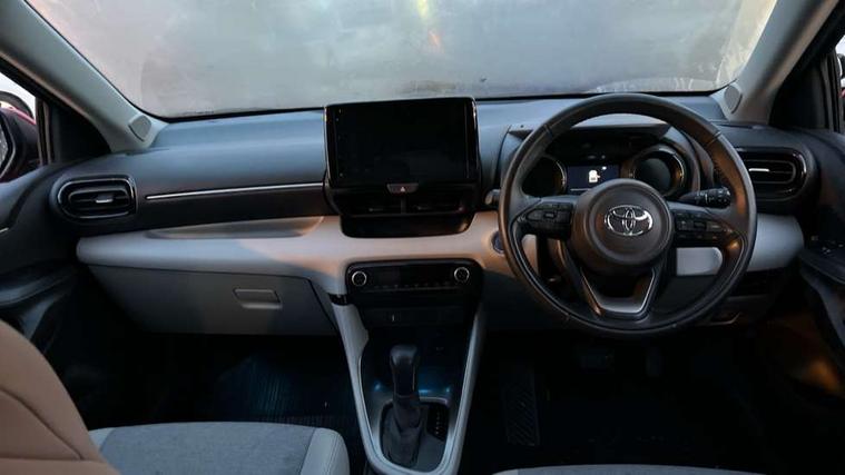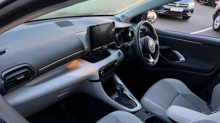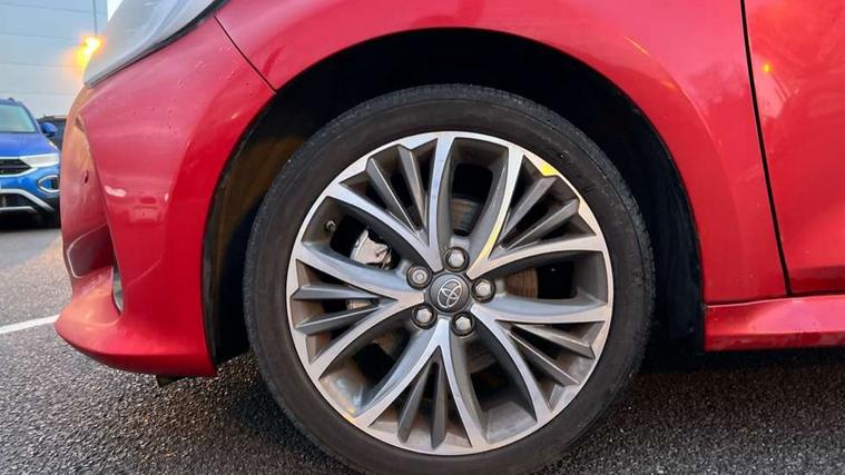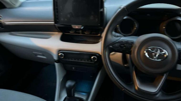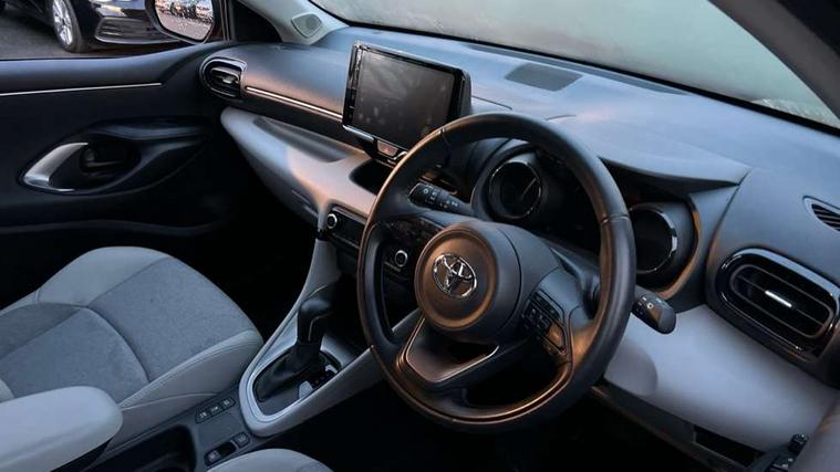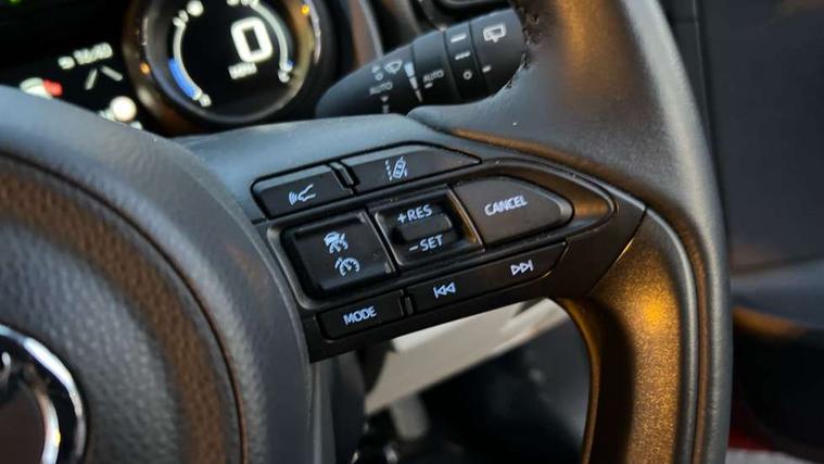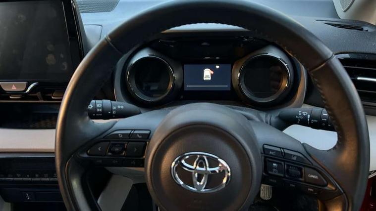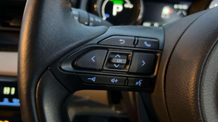Adaptive cruise control, Adjustable speed limit with speed warning, Blind spot monitoring, Bluetooth connectivity, Colour binocular inspired displays with digital speedometer, E-call, Electric power steering, Hybrid energy display, Multi information display switches on steering wheel, Reversing camera, Smartphone integration with Apple CarPlay and Android auto, Tailgate, Touch 2 navigation system, Voice recognition, Vehicle Stability Control (VSC), 6 speakers, 9" HD multimedia display touch screen with Toyota smart connect, USB connection, Acoustic windscreen glass, Auto windscreen wipers, Automatic headlights, Automatically retractable door mirrors, Body coloured door mirrors, Electric adjustable heated door mirrors, Follow me home headlights, Front auto power windows with anti jam protection, Full LED rear lights, LED daytime running lights, LED front fog lights, LED front light guide, LED Headlights, LED High mounted stop lamp, LED Indicators, LED rear light guide, Manual headlight levelling, Painted chequered front grille, Rain sensor, Rear auto power windows with anti jam protection, Rear privacy glass, Rear side wing doors, Rear spoiler, Rear wiper, Satin lower front grille, Shark fin antenna, Turning signal integrated indicators in door mirrors, Variable front intermittent wipers, 3 adjustable rear headrests, 3 seat bench in 2nd row, 3 spoke leather steering wheel, 60/40 split folding rear seat, Active headrests, Adjustable boot height, Coat hooks in rear grab handles, Cup holders (2 front & door), Data Communication Module (DCM) connected services, Dual zone automatic air conditioning, Fabric seat with partial synthetic leather upholstery, Front armrest, Front sport seats, Glovebox, Grey roof lining, Height adjustable driver's seat, Height adjustable passenger seat, Isofix seat fixing, Leather gearshift, Map pockets on the backs of the front seats, Pollen filter, Shopping bag hooks, Single front passenger seat, Tilt/telescopic steering column, Parking pack - Yaris, 3 point seatbelts on all rear seats, ABS+EBD+Brake assist, Electronic parking brake, Emergency brake light system (EBS), Front passenger airbag on/off switch, Front seatbelt reminder, Hill start assist control (HAC), Rear child proof door locks, Rear seat belt reminder, Supplemental Restraint System (SRS) 8 airbags: Driver & passenger's airbags, dual side curtain airbags, side impact airbags, front centre airbag, Toyota Safety Sense 2, Precollison + Night time Pedestrian & Cyclist Detection, Lane Trace Assist, Auto High Beam, Intelligent ACC & Road Sign Assist, Tyre pressure warning system, 2x Master key, Alarm/immobiliser, Keyless smart entry with push button start, Remote AC via MyT, Remote locking via MyT, Remote powered central double locking doors, Satin chrome interior styling, Soft touch instrument panel, Space saver spare wheel,