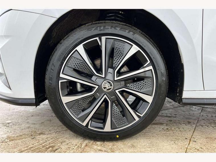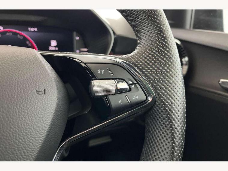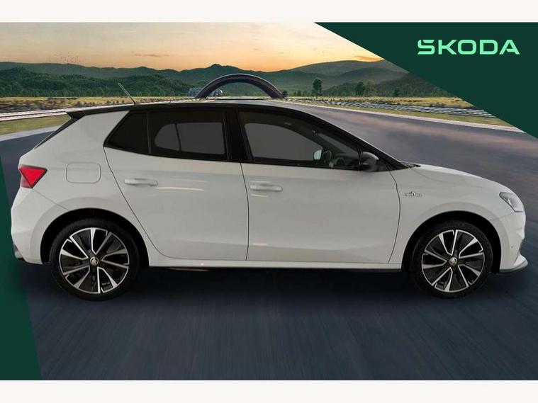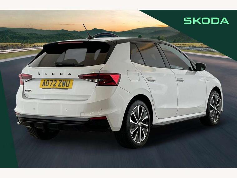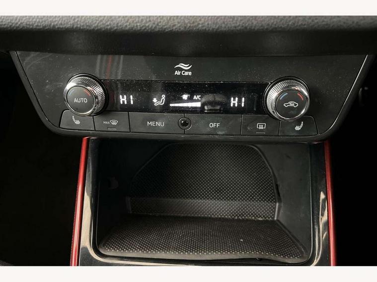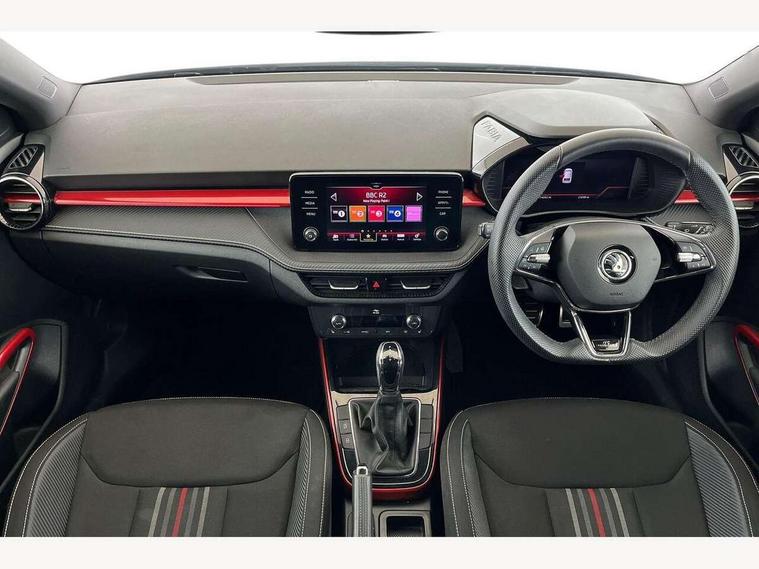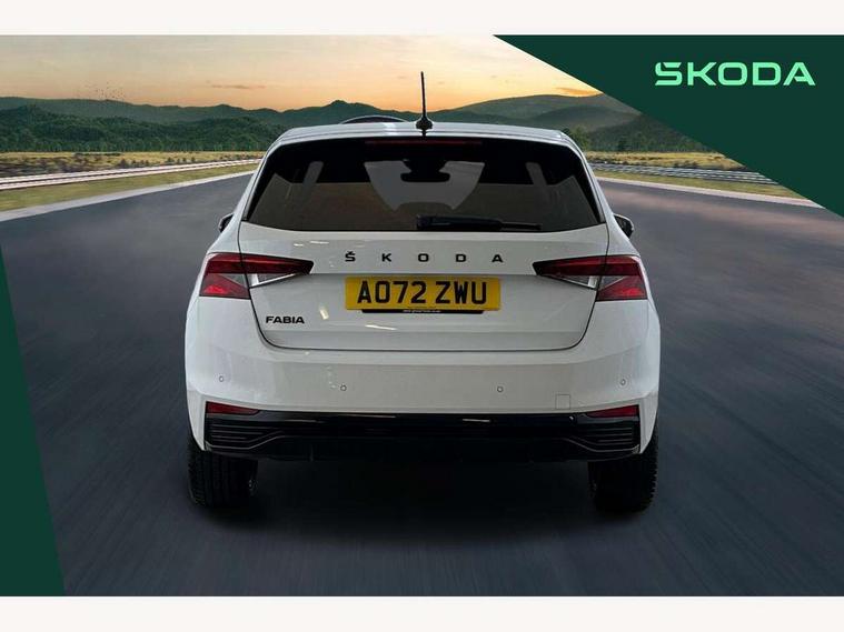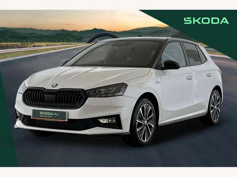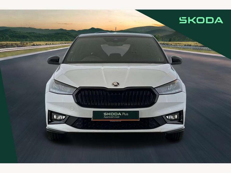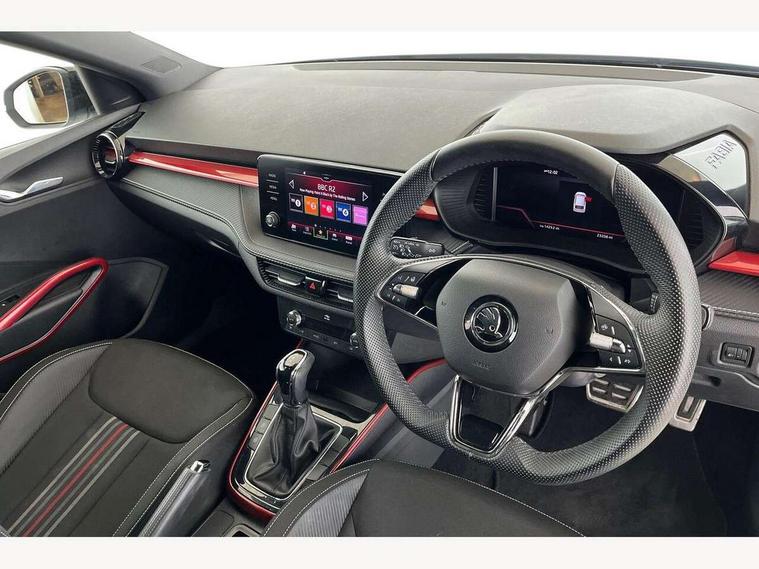 Bluetooth connection, Driver alert system - DAS, Electromechanical power steering, Exterior temperature gauge, Service interval indicator, 2x USB-C in the front (for data transmission and charging), 6 Speakers (4 in front and 2 in rear), Auxiliary socket for external MP3 player, Bolero radio with 8" colour display, DAB digital radio reception, Auto dimming rear view mirror, Basic rear lights, Black radiator grille, Body coloured bumpers, Door mirror integrated indicators, Electrically adjustable and heated door mirrors, Front and rear electric windows, Front window wiper intermittent control, Headlight range control - Automatic, Ice scraper in fuel cap, LED daytime running lights with coming and leaving home feature, Monte Carlo badging, Privacy glass, Rear LED fog light, Rear side wing doors, Rear window wiper with washing nozzles, Roof mounted spoiler, SKODA tailgate lettering in black, Sports bumpers, Third brake light, 3 rear headrests, Aluminium pedals, Backrest split and folding, Black headlining, Central console with removable cup holder and storage box, Chrome handbrake release button, Fabric/artificial leather upholstery, Front sports seats, Gearshift knob/handle in leather, Hand brake lever handle in leather, Height adjustable front headrests, Height adjustable steering wheel, ISOFIX and TopTether anchorage points to the outer rear seats, ISOFIX and TopTether on the front passenger seat, Luggage compartment lighting, Metallic painted red central console cover, Metallic red interior door handles, Monte Carlo door sills, Pollen filter, Rear seat bench unsplit, Single front passenger seat, Sun visors with mirror and airbag label on passenger side, Textile floor mats, Ticket holder, Umbrella in drivers door, Ambient lighting pack 2 - Fabia Hatchback, 3-point height adjustable front seats belts with pretensioner and force limiter, Automatic warning lights in case of crash, Driver and passengers airbag with switch off function, e-Call+, ESC including ABS, MSR, ASR, EDS, HBA and XDS, Front and rear seat belt warning, FRONT ASSIST (AEB City and AEB Inter Urban), Front side airbags, Head airbags, Hill hold assist, One tone horn, Pedestrian protection, Three rear 3-points safety seat belts with pretensioner and force limiter including stop function for outer rear seat belts, Tyre pressure monitoring system, Anti-theft alarm system including immobiliser, interior monitoring, backup horn, and towing protection, Carbon effect door and side trim panels, Carbon effect lower decorative trim with white stitching, Red metallic upper decorative trim, Anti-theft wheel bolts protection, Super-low rolling resistance tyres,
