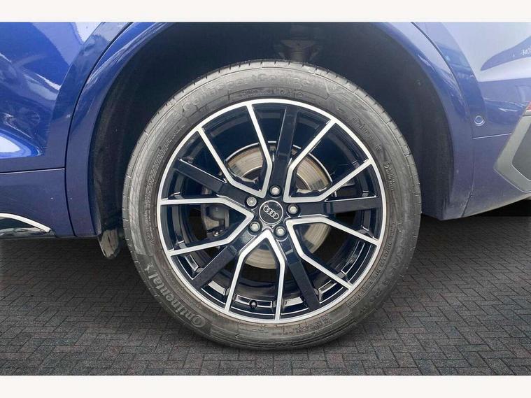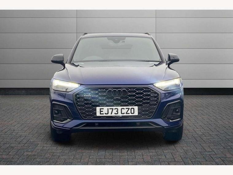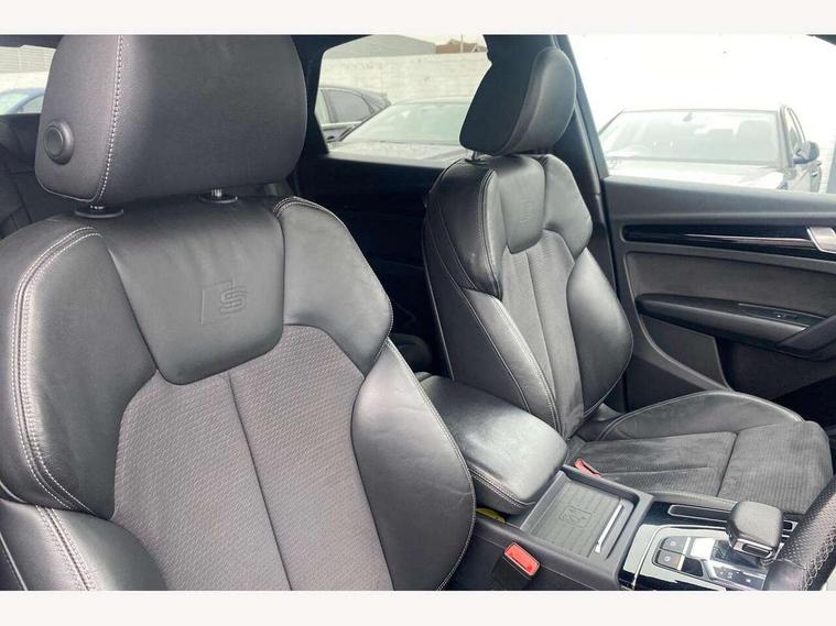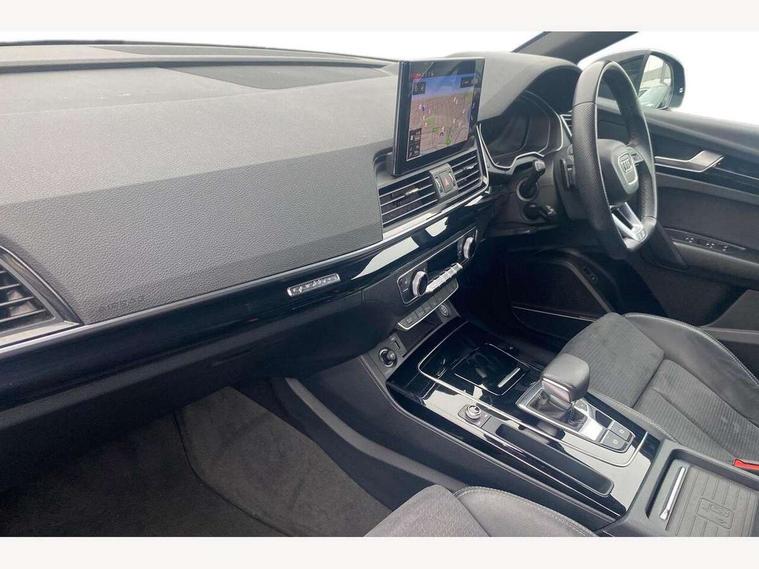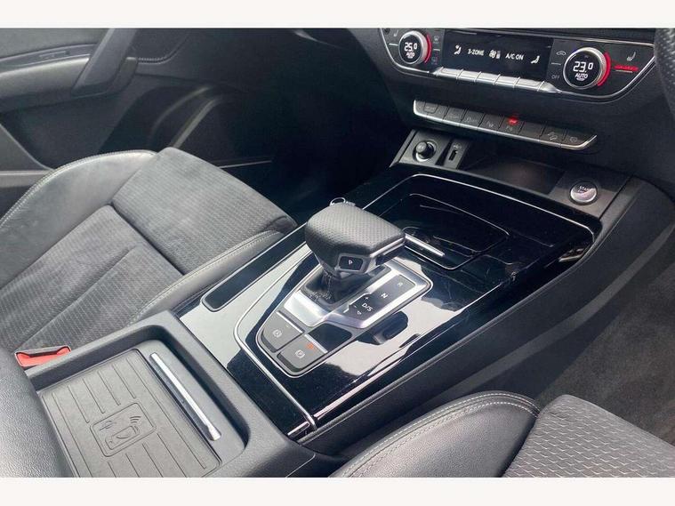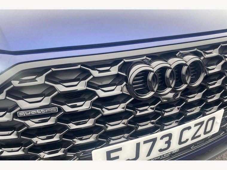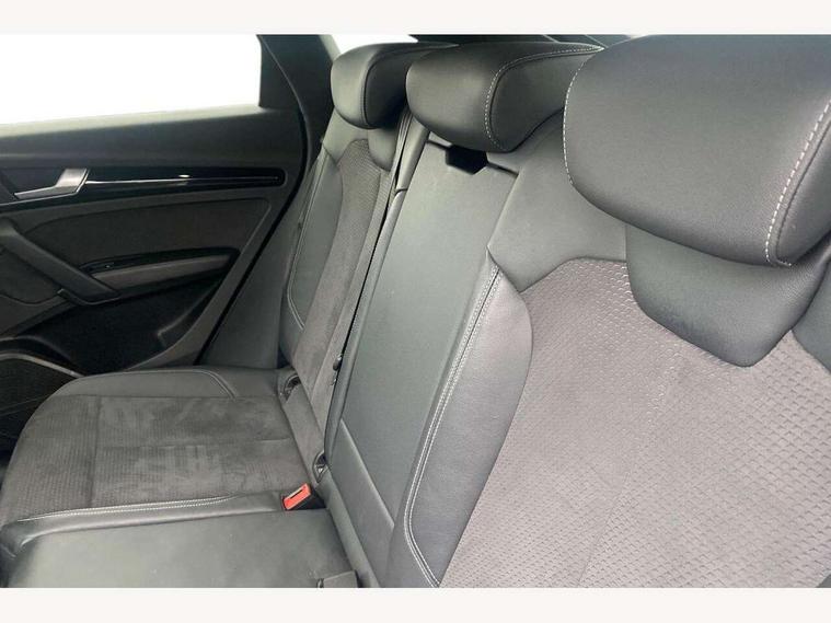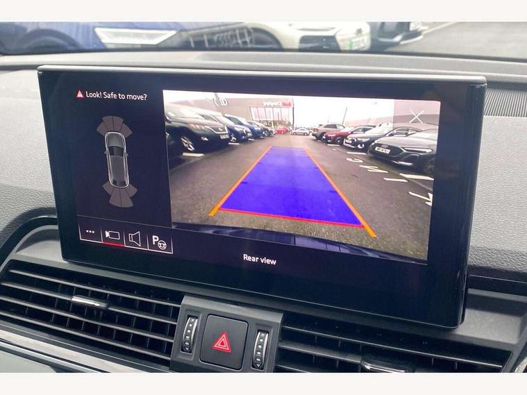 Acoustic front and rear parking sensor, Audi connect safety and service (e-call), Audi drive select, Audi virtual cockpit plus with 12.3" screen and three different layout designs, Audi wireless smartphone interface, Automatic start-stop system with coasting functionality and efficiency programme, Bluetooth interface, Camera based traffic sign recognition, Electro - mechanical power assisted steering, Lane departure warning, MMI navigation plus with 10.1" touch screen, Power tailgate, Reversing camera, Service interval indicator, Voice control system with Audi hotword activation "Hey Audi", Diesel particulate filter, Quattro on demand, S line sports suspension, 2 x USB charging port with aux input socket, 8 loudspeakers, DAB Digital radio, Acoustic windscreen, Auto dimming door mirrors, Auto dimming frameless rear view mirror, Automatic headlight adjustment, Automatic headlights and windscreen wipers, Black roof rails, Black styling with black rings, Body colour bumpers, Body colour rear diffuser with matt aluminium silver surrounds, Body colour underbody protection, Chrome plated exhaust trims, Daytime running lights, Door sills in Selenite silver, Electric adjustable/heated/folding door mirrors, Front air inlet surrounds in aluminium, Front and rear electric windows, Front radiator grille in honeycomb design, LED 3rd brake light, LED headlights and LED tail lights, Loading edge protection in stainless steel, Lower bumpers painted in contrast Manhattan grey, Rear chrome trim strip below lights, Rear privacy glass and rear side windows, Rear side wing doors, Rear wiper, Roof bars, S Line badges on the front wing panels, S Line front and rear bumpers, S Line rear spoiler, S Line side skirts, 3 rear headrests, Black cloth headlining, Comfort front centre armrest, Contrast stitching on seats, steering wheel and gear lever gaiter, Deluxe 3 zone electronic climate control, Front head restraints, Front sport seats with S embossed logo, Front/rear floor mats, Gear lever in black leather, Heated front seats, Height/reach adjustable steering column, Illuminated door sill trims with S logo, Luggage compartment cover, Manual seat adjustment with 4-way electric lumbar support, Single front passenger seat, Stainless steel pedals, Sunvisors with vanity mirrors, Top surface of the rear centre armrest in artificial leather, High gloss pack - Q5, LED interior light pack - Q5, 3 point seatbelts on all seats, 6 airbags - Driver, front passenger, curtain and side airbags, Attention and drowsiness assist, Electrically operated child locks on rear doors, Electromechanical parking brake, Electronic stabilisation control including ABS, ASR and EDL, First aid kit with warning triangle and vests, Front passenger airbag deactivation, Hill descent control, Hill hold assist, ISOFIX child seat mounting for front passenger seat and ISOFIX child seat mounting with Top Tether for outer rear seats, Multi collision brake assist, Pop-up bonnet for pedestrian protection, Pre sense city, Seatbelt monitoring, Tyre pressure warning, Anti theft alarm, Anti-theft wheel bolts, Remote central locking, Remote control key with SAFELOCK and keyless go, Air vents inserts and centre console in gloss black, Tool kit, Tyre repair kit,