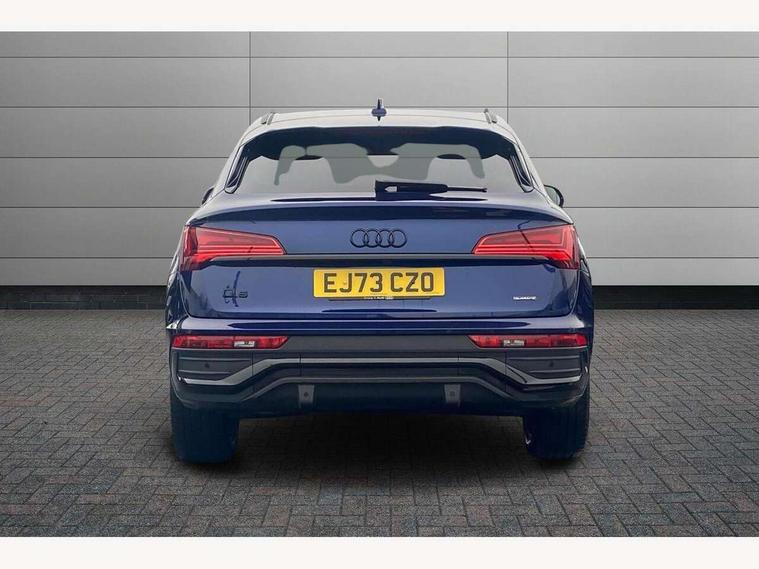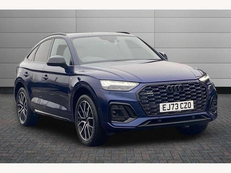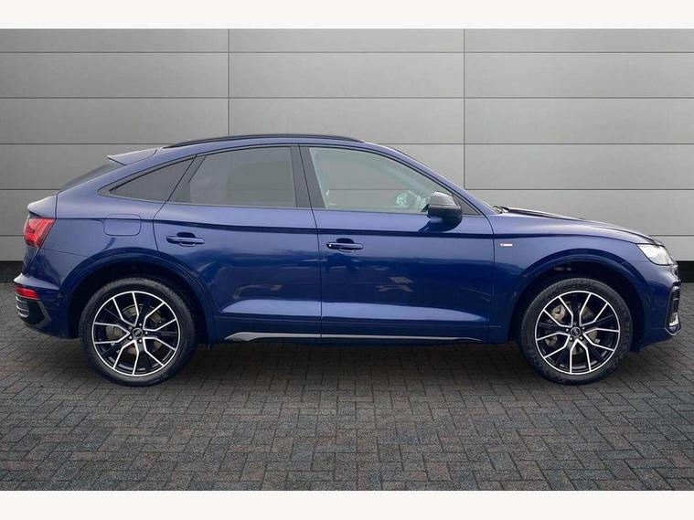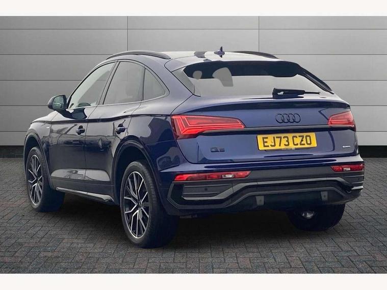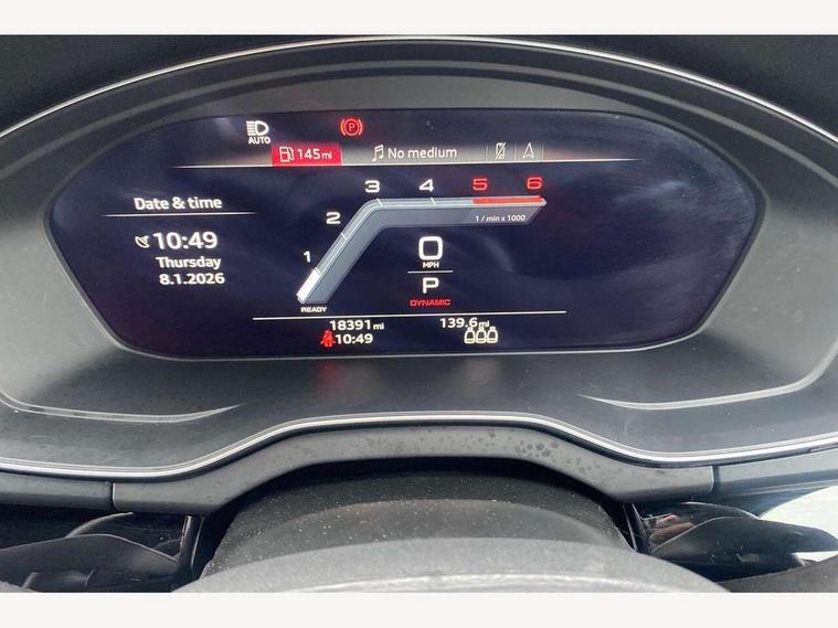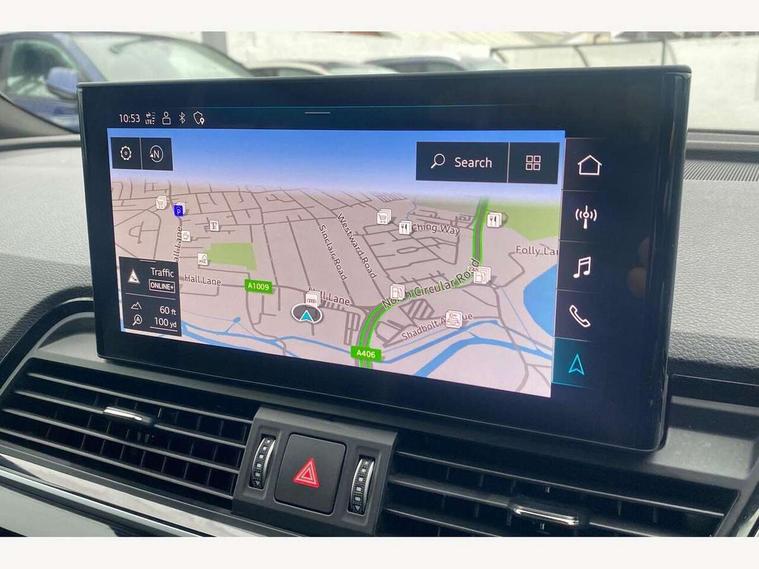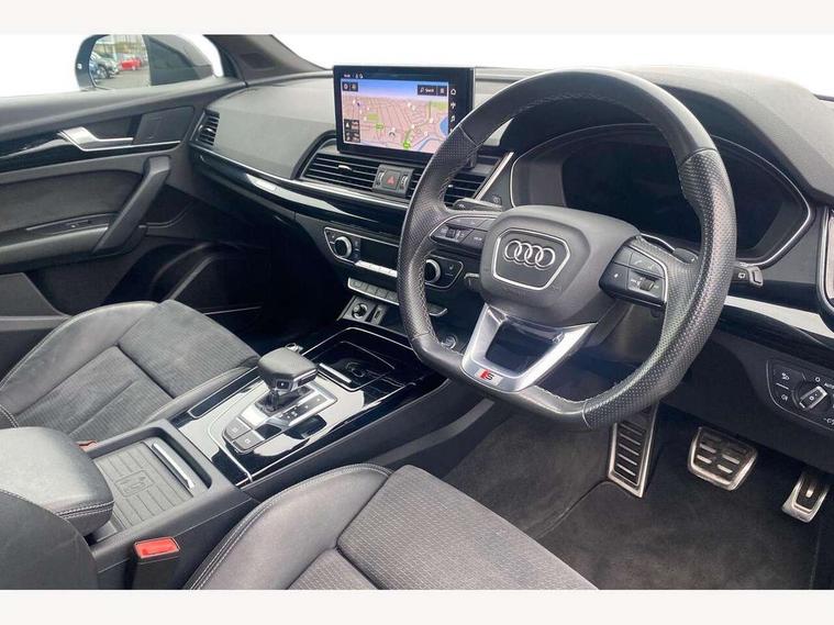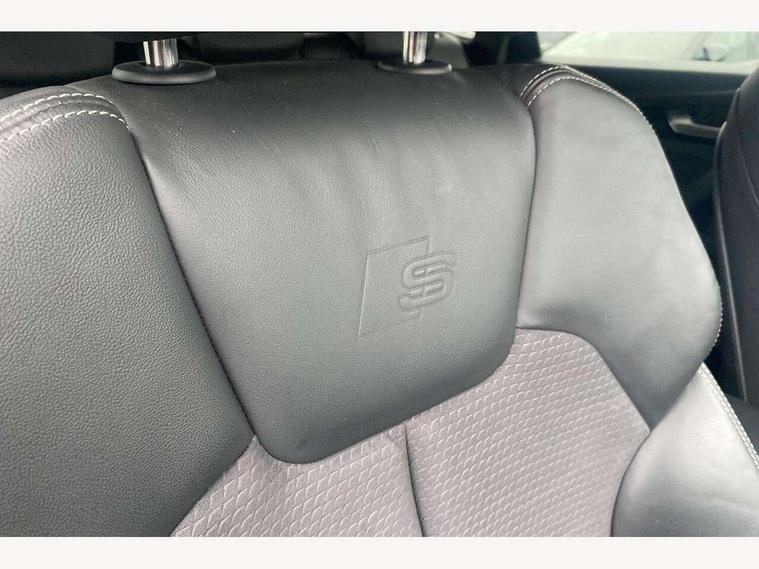Acoustic front and rear parking sensor, Audi connect safety and service (e-call), Audi drive select, Audi virtual cockpit plus with 12.3" screen and three different layout designs, Audi wireless smartphone interface, Automatic start-stop system with coasting functionality and efficiency programme, Bluetooth interface, Camera based traffic sign recognition, Electro - mechanical power assisted steering, Lane departure warning, MMI navigation plus with 10.1" touch screen, Power tailgate, Reversing camera, Service interval indicator, Voice control system with Audi hotword activation "Hey Audi", Diesel particulate filter, Quattro on demand, S line sports suspension, 2 x USB charging port with aux input socket, 8 loudspeakers, DAB Digital radio, Acoustic windscreen, Auto dimming door mirrors, Auto dimming frameless rear view mirror, Automatic headlight adjustment, Automatic headlights and windscreen wipers, Black roof rails, Black styling with black rings, Body colour bumpers, Body colour rear diffuser with matt aluminium silver surrounds, Body colour underbody protection, Chrome plated exhaust trims, Daytime running lights, Door sills in Selenite silver, Electric adjustable/heated/folding door mirrors, Front air inlet surrounds in aluminium, Front and rear electric windows, Front radiator grille in honeycomb design, LED 3rd brake light, LED headlights and LED tail lights, Loading edge protection in stainless steel, Lower bumpers painted in contrast Manhattan grey, Rear chrome trim strip below lights, Rear privacy glass and rear side windows, Rear side wing doors, Rear wiper, Roof bars, S Line badges on the front wing panels, S Line front and rear bumpers, S Line rear spoiler, S Line side skirts, 3 rear headrests, Black cloth headlining, Comfort front centre armrest, Contrast stitching on seats, steering wheel and gear lever gaiter, Deluxe 3 zone electronic climate control, Front head restraints, Front sport seats with S embossed logo, Front/rear floor mats, Gear lever in black leather, Heated front seats, Height/reach adjustable steering column, Illuminated door sill trims with S logo, Luggage compartment cover, Manual seat adjustment with 4-way electric lumbar support, Single front passenger seat, Stainless steel pedals, Sunvisors with vanity mirrors, Top surface of the rear centre armrest in artificial leather, High gloss pack - Q5, LED interior light pack - Q5, 3 point seatbelts on all seats, 6 airbags - Driver, front passenger, curtain and side airbags, Attention and drowsiness assist, Electrically operated child locks on rear doors, Electromechanical parking brake, Electronic stabilisation control including ABS, ASR and EDL, First aid kit with warning triangle and vests, Front passenger airbag deactivation, Hill descent control, Hill hold assist, ISOFIX child seat mounting for front passenger seat and ISOFIX child seat mounting with Top Tether for outer rear seats, Multi collision brake assist, Pop-up bonnet for pedestrian protection, Pre sense city, Seatbelt monitoring, Tyre pressure warning, Anti theft alarm, Anti-theft wheel bolts, Remote central locking, Remote control key with SAFELOCK and keyless go, Air vents inserts and centre console in gloss black, Tool kit, Tyre repair kit,