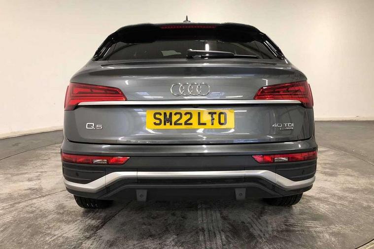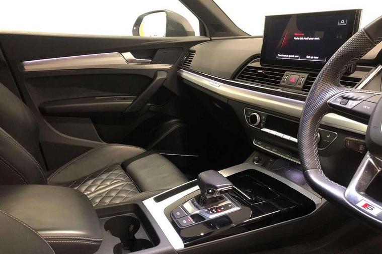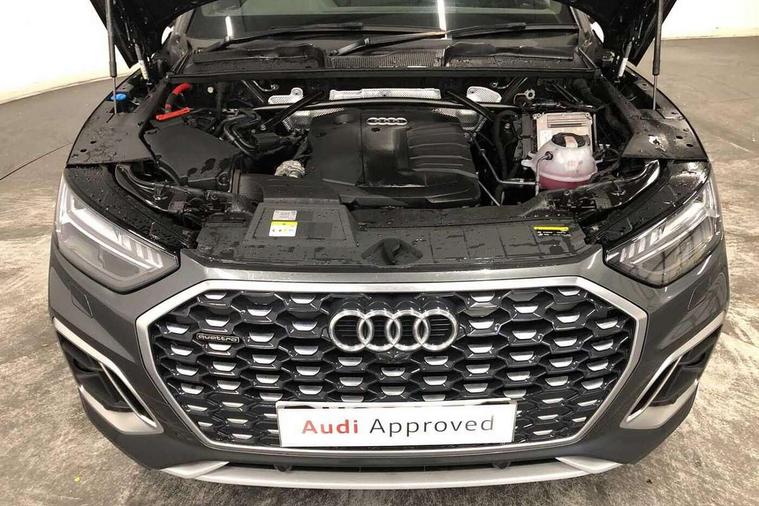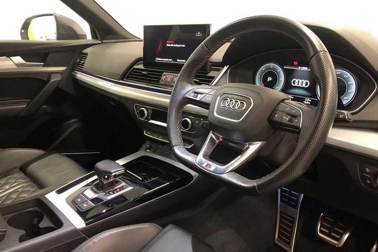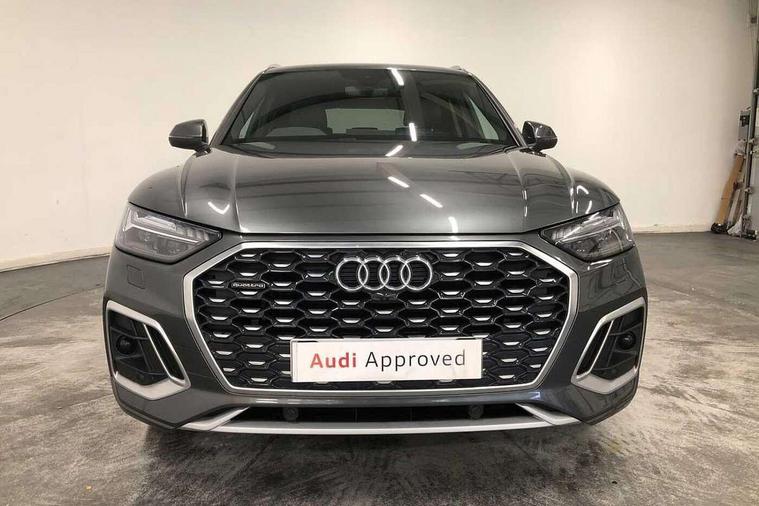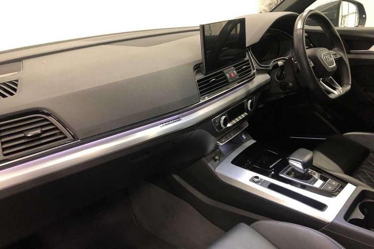 Audi connect safety and service (e-call), Audi connect with Amazon Alexa Integration, Audi drive select, Audi virtual cockpit plus with 12.3" screen and three different layout designs, Audi wireless smartphone interface, Automatic start-stop system with coasting functionality and efficiency programme, Bluetooth interface, Electro - mechanical power assisted steering, MMI navigation plus with 10.1" touch screen, Power tailgate, Reversing camera, Service interval indicator, Voice control system with Audi hotword activation "Hey Audi", Diesel particulate filter, Quattro on demand, S line sports suspension, 2 x USB charging port with aux input socket, DAB Digital radio, Acoustic windscreen, Aluminium roof rails, Audi matrix LED headlights with dynamic front and rear indicators, Auto dimming door mirrors, Auto dimming rear view mirror, Automatic headlights and windscreen wipers, Body colour door mirrors, Body colour rear diffuser with matt aluminium silver surrounds, Body colour underbody protection, Chrome plated exhaust trims, Daytime running lights, Door sills in Selenite silver, Electric adjustable/heated/folding door mirrors, Front air inlet surrounds in aluminium, Front and rear electric windows, Front radiator grille in honeycomb design, Headlight washers, High level LED brake light, Lower bumpers painted in contrast Manhattan grey, Rear chrome trim strip below lights, Rear privacy glass and rear side windows, Rear side wing doors, Rear wiper, Roof bars, S Line badges on the front wings, S Line front and rear bumpers, S Line rear spoiler, S Line side skirts, 3 rear headrests, 40:20:40 split folding 3 rear bench seat in 2nd row with rear centre armrest, Black cloth headlining, Comfort front centre armrest, Contrast stitching on seats, steering wheel and gear lever gaiter, Deluxe 3 zone electronic climate control, Front head restraints, Front/rear floor mats, Gear lever in black leather, Heated front seats, Height/reach adjustable steering column, Illuminated door sill trims with S logo, ISOFIX child seat mounting and top tether, Manual seat adjustment with 4-way electric lumbar support, Removable luggage compartment floor, Single front passenger seat, Stainless steel pedals, Sunvisors with vanity mirrors, Trunk roller cover, High gloss pack - Q5, LED interior light pack - Q5, 3 point seatbelts on all seats, 6 airbags - Driver, front passenger, curtain and side airbags, Electrically operated child locks on rear doors, Electromechanical parking brake, Electronic stabilisation control including ABS, ASR and EDL, Front passenger airbag deactivation, Hill descent control, Hill hold assist, Multi collision brake assist, Pop-up bonnet for pedestrian protection, Pre sense city, Seat belt force limiter, Seatbelt monitoring, Tyre pressure warning, Warning triangle and first aid kit, Anti theft alarm, Anti-theft wheel bolts, Keyless Go access/ignition system, Remote central locking, Matt brushed aluminium inlays,