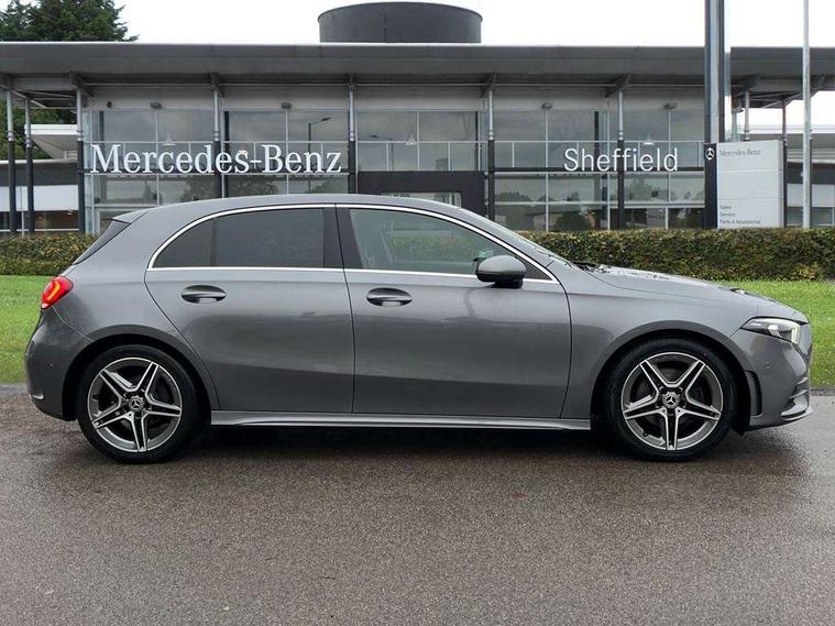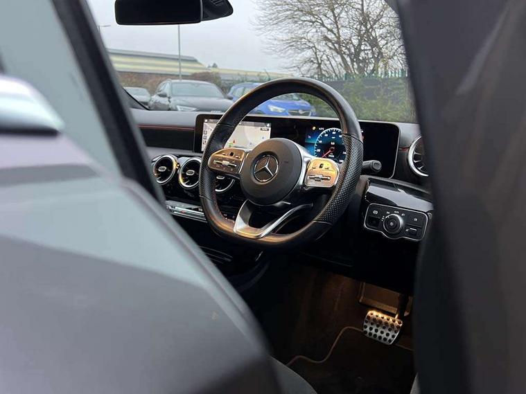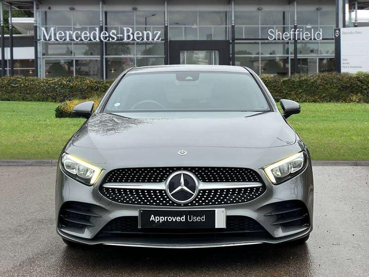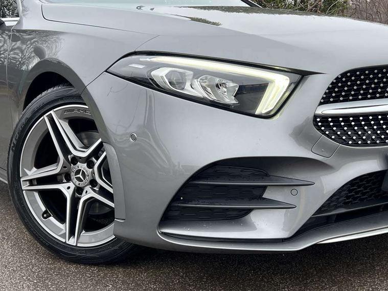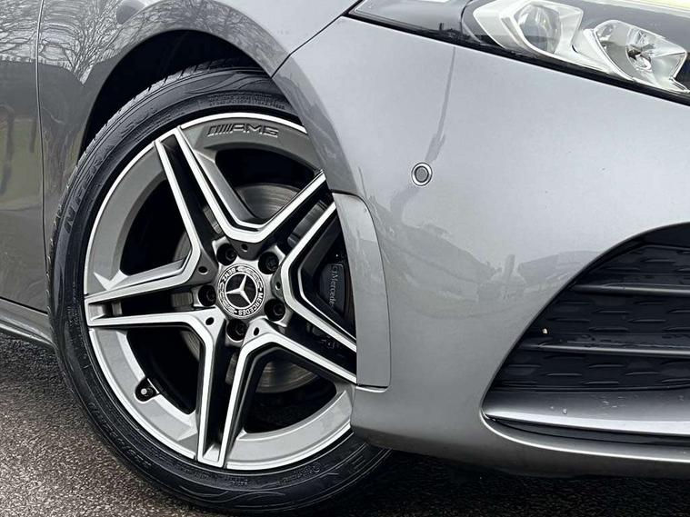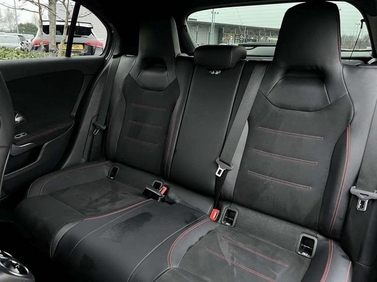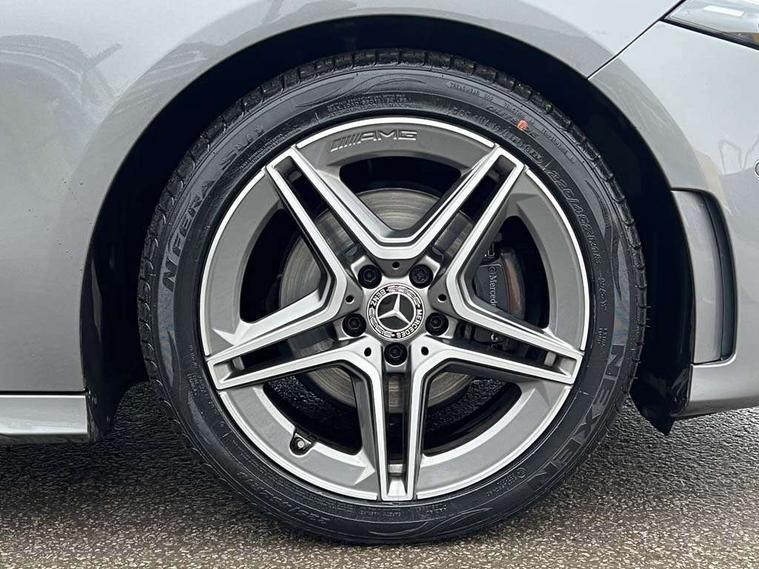 10.25" media display, 180 degree rear view camera with parking guidelines, 7" colour screen in instrument panel, Active lane keep assist, Active park assist with parktronic system including front and rear parking sensors, Attention assist, Brake pad wear indicator warning light, Cruise control + speed limiter, Direct steering, Dual bluetooth interfaces, DYNAMIC SELECT with a choice of driving modes (ECO, Comfort, Sport and Individual), ECO start/stop function, Fluid level warning indicator for fuel, oil, coolant and washer fluid, Hard-disk navigation, Hey Mercedes Voice activation, Lamp failure indicator, Mercedes me connect including emergency call system, accident recovery, breakdown and maintenance management, Outside temperature gauge, Owners manual in English, Pre-installation for private car sharing, Pre-installation for Vehicle Monitoring, Pre-installation for Vehicle Setup, Preinstallation for Mercedes Benz link, Service indicator (ASSYST), Smartphone integration with Apple CarPlay and Android auto, Speed sensitive power steering, Trip computer, Wireless charging, Lowered comfort suspension, Rear axle torsion beam, 2 USB ports (type C) in rear stowage compartment and one in front of center console, 6 speakers, DAB Digital radio, MBUX multimedia system with DAB digital radio and touchpad including satellite navigation, Mercedes-Benz sound system - 100W, 4 Electric Front and Rear windows, Adaptive brake lights, AMG bodystyling - Front apron with splitter in chrome, rear apron with chrome trim and chrome visible trim elements in tailpipe, Black weather strip, Body colour bumpers, Body colour door handles, Body colour side skirt, Body coloured door mirrors, Chrome beltline trim, Diamond radiator grille with chrome pins and silver louvre + chrome insert, Electric adjustable and heated door mirrors with integrated LED side indicators, Exhaust system - Twin visible tailpipes in polished stainless steel, Headlamp assist automatic headlamp activation, Heated glass rear windscreen + timer control, LED high performance headlamps with integrated LED daytime running lights, LED tail lamp, LED third brake light, Privacy glass, Radio aerial, Rain sensing windscreen wipers with two sensitivity settings, Rear fog lights, Rear wiper, Window line trim strip in chrome, 3 Spoke flat bottom leather multi function steering wheel with perforated leather in grip area, 40:20:40 split folding rear seats, Artico man-made leather/Microfibre Dinamica upholstery with red contrast stitching, Auto Mercedes-Benz child seat recognition sensor, Black air vents with surround in silver chrome, Black roof lining, Brushed stainless steel sports pedals with rubber studs, Controller on centre console with chrome surround, Floor mats with stitched edging and AMG lettering, Front centre armrest with storage compartment, Front door sills with Mercedes Benz lettering, Front seat backs luggage nets, Front seat cushion length adjustment, Galvanished gear shift paddles on steering wheel, Heated front seats, Height/reach adjustable steering column, Manual height adjustable front seats, Rear head restraints, Seat occupancy sensor for front passenger seat, Spectacles compartment for driver, Sports seats with integrated headrests, Stowage compartment in centre console with retractable cover, Sunvisors with illuminated vanity mirrors, Touchpad on center console, Twin front cupholders, Two zone thermotronic luxury automatic climate control, Light and sight pack - A Class, Mirror package - A Class, Seat comfort pack - A Class, 3 rear 3 point seatbelts, ABS with Brake Assist, Active bonnet, Active brake assist includes forward collision warning system with autonomous braking, Adaptive brake assist with hold function and hill start assist, Black seatbelts, Childproof locks manually operated for rear doors and electrically operated for rear power windows, Crash responsive emergency lighting, Driver and passenger head and side airbags, Drivers knee airbag, Dual stage driver/passenger airbags, Electronic parking brake, ESP curve dynamic assist, ESP with ASR, Front and rear seatbelt reminder, Front brake callipers with Mercedes Benz lettering, ISOFIX and top tether child seat fixing points in two outer rear seats, Tyre pressure monitoring system, Warning triangle and first aid kit, Window airbags, Alarm system/interior protection/immobiliser, Keyless Go, Remote central locking and crash sensor with emergency opening function, Dinamica microfibre trim in black, 18" AMG 5 twin spoke light alloy wheels in titanium grey with highsheen finish, Summer tyres, Tirefit sealant kit,