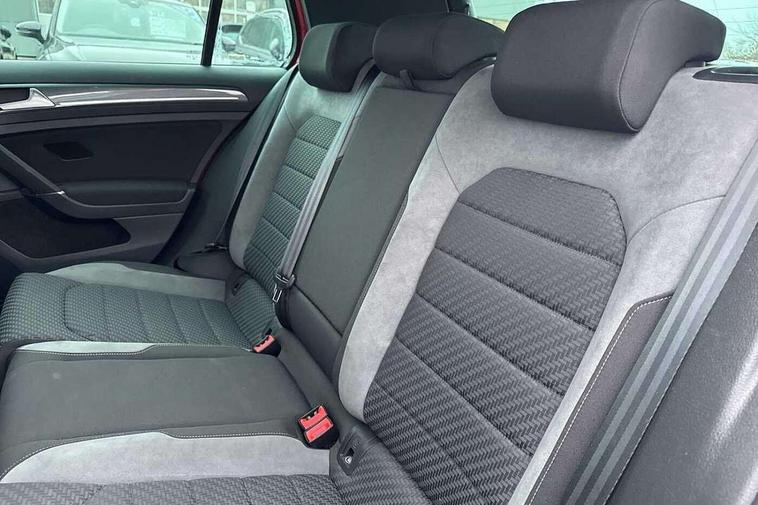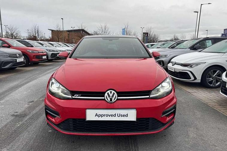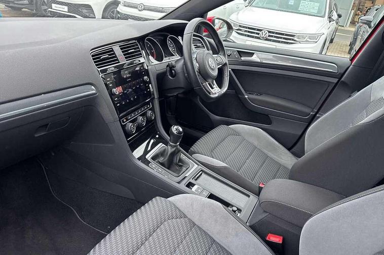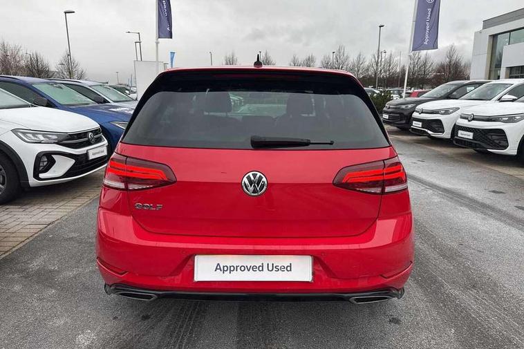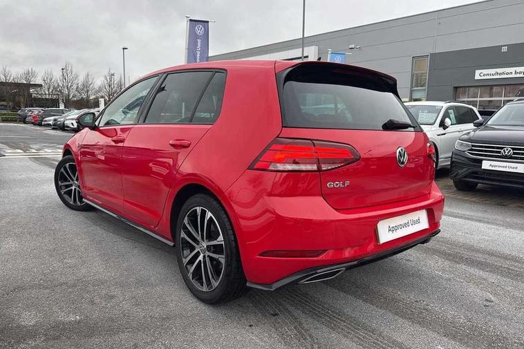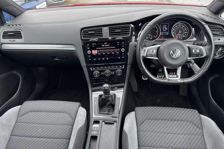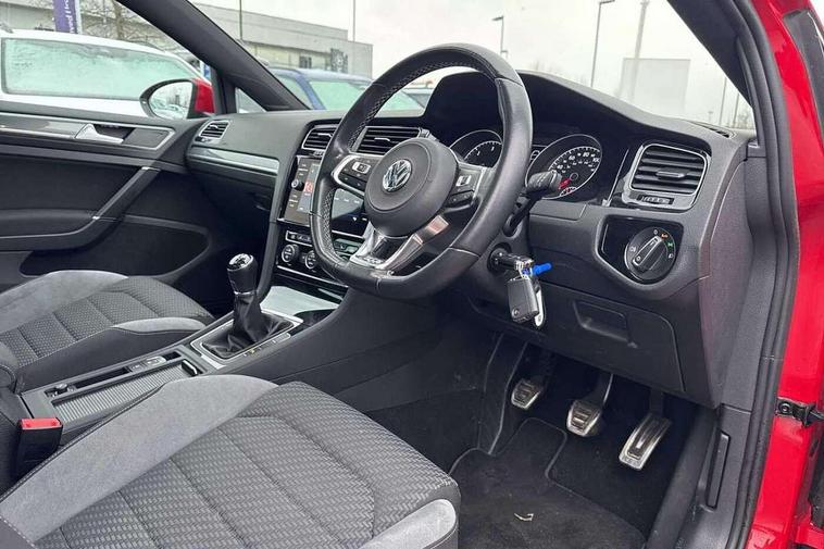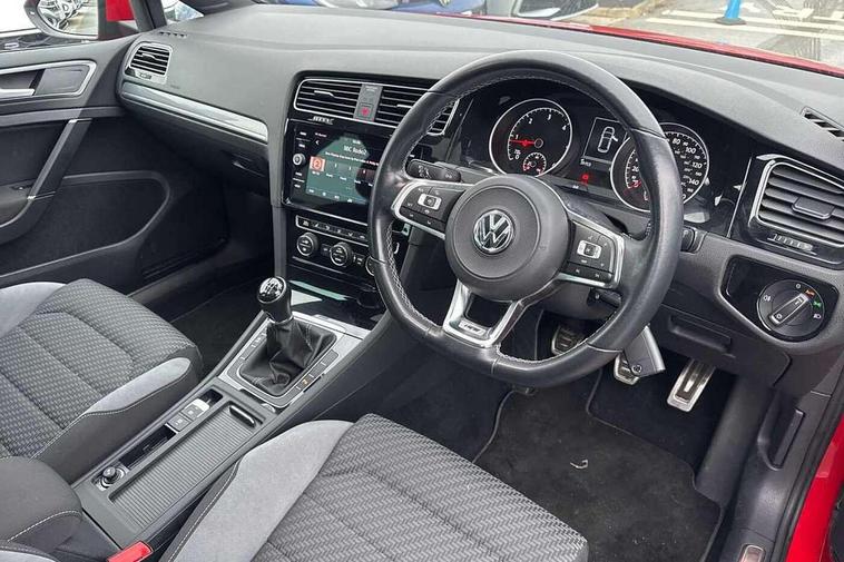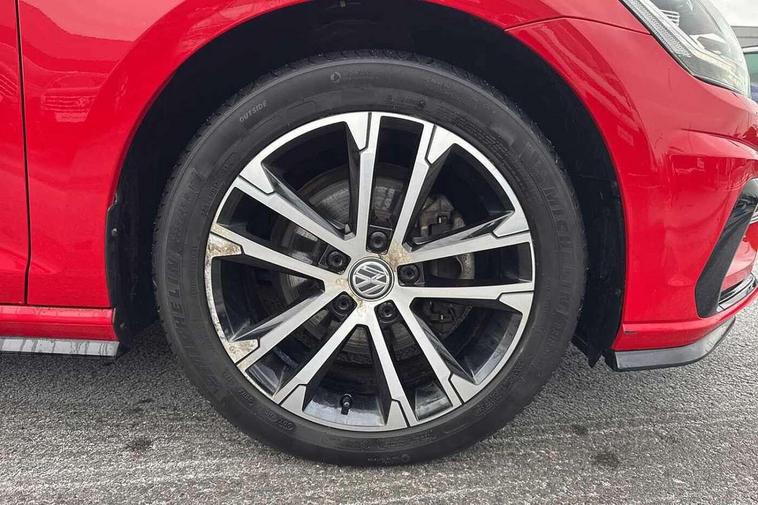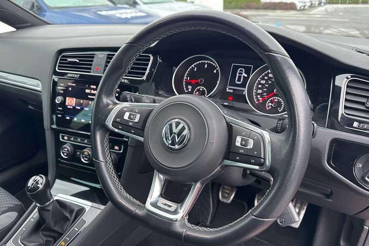'Lights On' Reminder warning buzzer, ACC - Adaptive cruise control with front assist, forward collision warning, distance monitoring, city emergency brake and speed limiter, Bluetooth telephone and audio connection for compatible devices, Brake pad wear indicator warning light, Driver alert system, Driving Mode Selection with four preset modes - Eco, normal, sport or individual modes, Misfuelling protection device, Multifunction computer with visual gear change recommendation for fuel consumption, Power assisted speed sensitive electro-mechanical steering, Push tank flap, Speed limit display, Speedo, rev counter, electronic odometer, trip, service interval display, exterior temperature and fuel gauge, Stop/start system, Think blue trainer driver tips and journey analysis, Warning buzzer and light for front seatbelts unfastened, Battery regeneration during braking, Diesel particulate filter, XDS electronic differential lock, Composition media system, DAB Digital radio receiver, Driver Personalisation profile selection, MP3/WMA compatability, Multi device interface (MDI) via USB connection, Premium USB cable in choice of either Apple or Android smartphone compatibility, SMS Functionality, Title and cover art display, USB and SD card connectivity, Volkswagen media control, Black front air intake and radiator grille with chrome insert, Body colour bumpers, Body colour door handles, Body colour door mirrors with integrated indicators, Dusk sensor + automatic driving lights, Electric front windows, Electric rear windows, Electrically adjustable and heated door mirrors, Fully galvanised body, Heated rear windscreen, High level 3rd brake light incorporating LED Technology, Left and right chrome effect trapezoid dummy exhaust tailpipe surrounds, Range adjustable headlights via infotainment system with LED daytime running lights, Rear diffuser, Rear fog lamp, Rear number plate lights incorporating LED technology, Rear tinted glass 65% light absorbing from B pillar backwards, Rear window aerial, Rear window wash/wipe with intermittent wipe, Reflectors in all doors, Stainless steel door sill protection, Unique R Line badging, Windscreen wipers/ intermittent wipe + 4 position delay, 12V socket in luggage compartment, 3 rear headrests, 4 load lashing points in luggage compartment, 60/40 split folding rear seat backrest, Bag hook in luggage compartment x 2, Black roof lining, Climate control - 2 zone electronic air conditioning with automatic air recirculation and allergy filter, Cooled glovebox, Cover for storage compartment in centre, Dust/pollen filter, Embosseed R line logo on front sport seat backrest, Front + rear carpet mats, Front centre armrest with storage compartment and two rear air vents, Front seat back storage pockets, Grab handles front x 2, rear x 2 with integrated coat hooks, Height and reach adjustable steering wheel, Illuminated vanity mirrors, Instrument lighting white adjustable panel illumination, Interior light delay, Isofix preparation for 2 rear child seats, Leather gear knob and handbrake grip, Load through provision with rear centre armrest and cupholders x2, Luggage compartment lighting, Multifunction sports leather steering wheel with R-Line logo and decorative seams in crystal grey, Overhead storage box, Stainless steel pedals, Storage box in luggage compartment, Storage compartment in roof console with cover, Storage compartments in centre console, Storage compartments in front doors, Storage compartments in rear doors, Stowable luggage compartment cover, Sun visors, Variable boot floor, height adjustable and removable, Ambient lighting pack - Golf, Convenience Pack - Golf, Mirror pack - Golf, R Line Styling pack - Golf, Winter pack - Golf, 3 rear three point seatbelts, Airbags - Driver's and front passenger's, curtain airbag, Driver's knee, front side impact and passenger's airbag deactivation switch, Anti-lock Braking System (ABS) with Hydraulic Brake Assist (HBA), Automatic post collision braking system, Child locks on rear doors, Driver/Passenger optimised head restraints, Electronic parking brake with auto hold, Electronic stability control (ESC) including Electronic differential lock (EDL) and ASR (Traction control) with deactivation via infotainment system, Front ventilated disc brakes and rear disc brakes, Pre crash preventive occupant protection, Three point height adjustable front seatbelts with tensioners, Tyre pressure loss indicator, Alarm with interior protection and deactivation via infotainment system, Electronic engine immobiliser, Chrome plated air vent surround, Chrome plated electric mirror adjustment switch surround, Chrome-plated light switch surround, Dark Diamond decorative inserts in dash and door panels, Piano black decorative inserts in centre console, Steel space saver spare wheel,