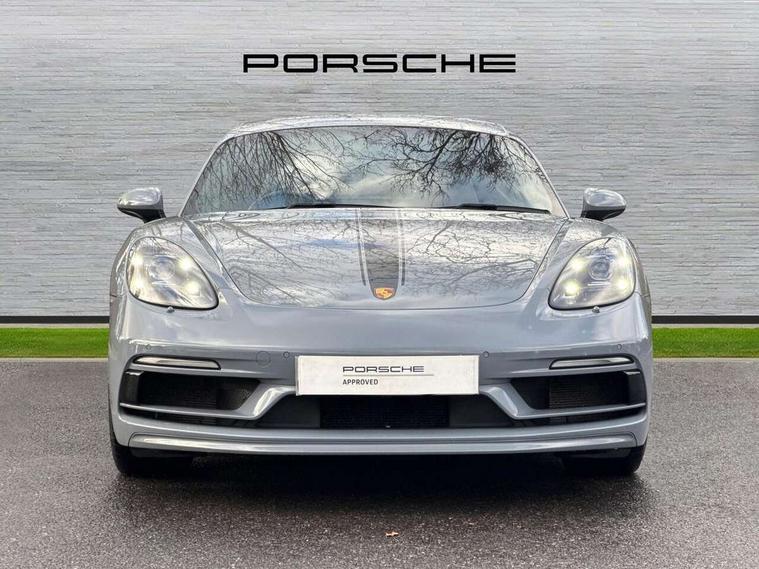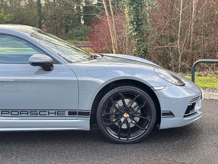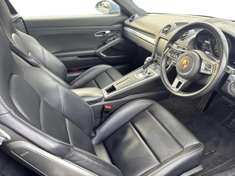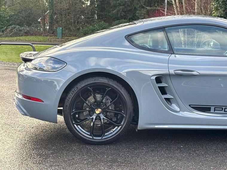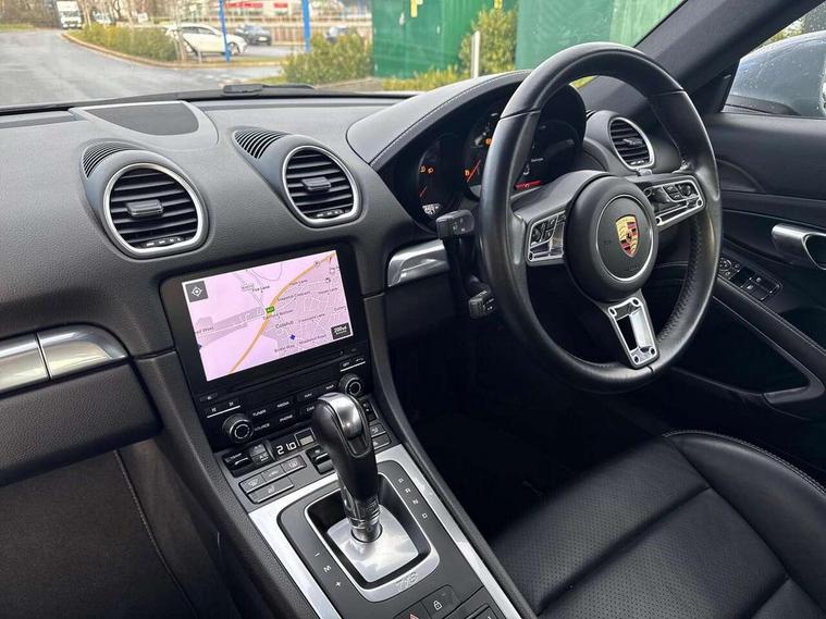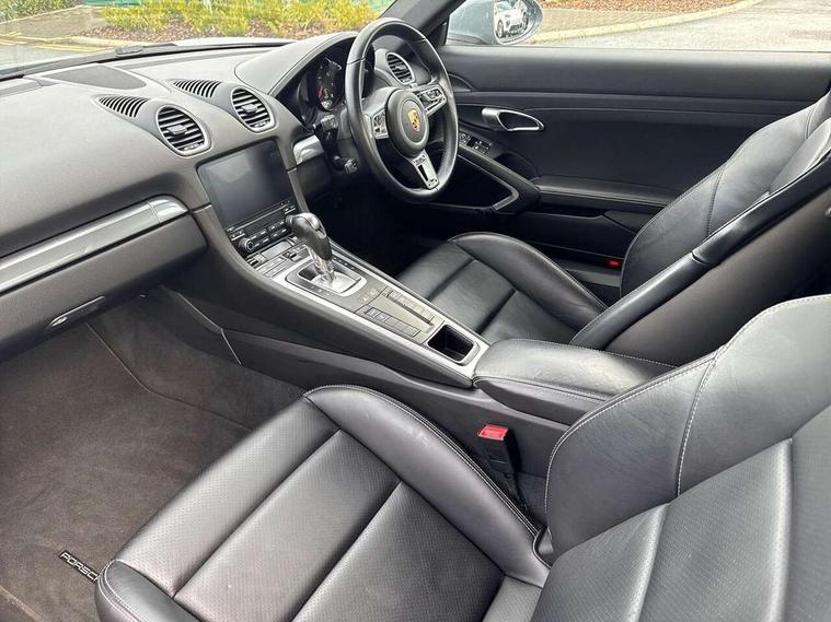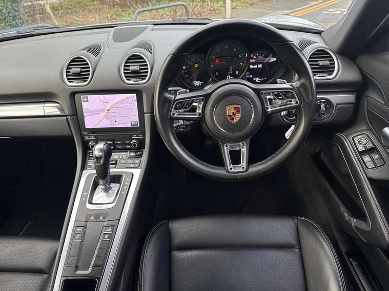Auto start and stop system, Digital displays for vehicle speed, chosen gear, odometer, trip odometer and clock, eCall emergency call system, Instrument cluster with central rev counter and high-resolution 4.6 inch colour display, Porsche Communication Management (PCM) including online navigation module, mobile phone preparation, audio interfaces and voice control system, Reversing camera including front and rear park assist, 3-way catalytic converters and on-board diagnostics for monitoring emission control system and coated particulate filter, 4 valves per cylinder, Aluminium block and cylinder heads, Direct fuel injection (DFI), Gasoline particulate filter, Integrated dry-sump lubrication with an on-demand oil pump, Porsche Doppelkupplung (PDK), Porsche Stability Management (PSM) with ABS, advanced brake functions, Rear wheel drive, Turbocharger with intercooler, Two seater vehicle with mid mounted engine, Water cooled with thermal management, DAB Digital radio, Integrated 4G/LTE compatible SIM including data for the Porsche Connect Services, Integrated compatible SIM including Porsche Connect Services, Navigation incl porsche + Apple Carplay, connect module, wireless internet access, carfinder, remote vehicle status, remote service and vehicle track, Wifi and music streaming, 3rd brake light, Auto deploying rear wing, Automatic headlight activation including welcome home lighting, Automatically dimming mirrors with integrated rain sensor, Automatically extending rear boot spoiler, Body colour bumpers, Body colour door handles, Electrically adjustable heated exterior mirrors on door waist rails, aspherical on driver's side, Green tinted heat insulating glass, Grey top tinted windscreen, Heated rear windscreen, Intelligent lightweight body in Aluminium/Steel composite construction, Power windows with one touch operation and door seal protection, Rain sensor, Rear boot, Separate auxiliary lights in the front end with LED indicators and position lights, Twin tailpipe with special look in highly polished chrome plated stainless steel in black, Wide opening rear hatch with heated screen, Windscreen washer system with two wiper speeds and washer jets, 12V sockets in passenger footwell and centre console storage compartment, 718 logo on gear lever, Adjustable fan with air recirculation and defroster functions, Ascending centre console with uncovered storage compartment and closed storage compartment, Clothes hooks on front seat backrests, Footwell illumination, Front and rear luggage compartments, Front headrests, Heated seats, LED reading lights, orientation, ignition lock, additionally luggage compartment and glove compartment lighting, Lockable glovebox, Porsche crest embossed in headrests, Single front passenger seat, SPORT button to activate dynamic driving settings for engine, transmission (with PDK), Storage compartments in each doors, Two individual cup holders (Passenger side, integrated into dashboard trim strip), Two zone automatic climate control, 3 point automatic seatbelts, ASR, Electrically controlled parking brake, Front and rear 4 piston aluminium monobloc fixed calipers, disc internally vented and cross drilled, front/rear disc diameter, brake calipers in black, Front and rear lightweight spring strut axle, Front seatbelt pretensioners + load limiters, Full size driver and passenger airbags, Passenger airbag deactivate switch, Porsche side impact protection doors with thorax airbag in outer backrest side bolster and head airbag for driver/passenger in door panel, Tyre pressure monitoring system, Alarm system with interior surveillance, Anti-theft wheel bolts, Dashcam prep, Engine immobiliser with in key transponder, central locking and remote control, Tyre repair kit, Wheel centres with full colour Porsche crest,