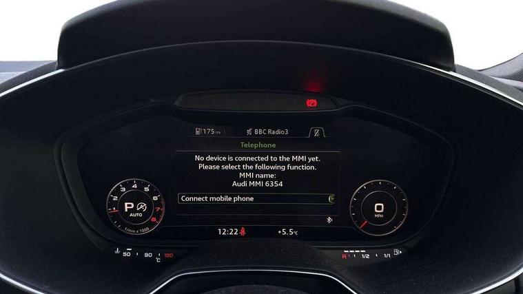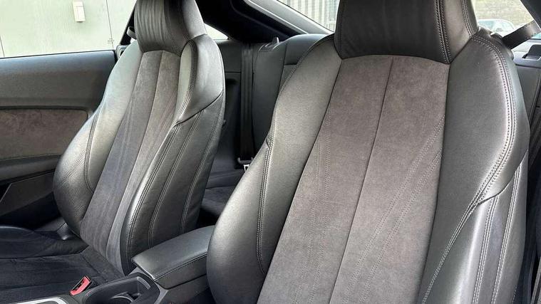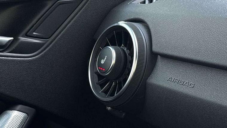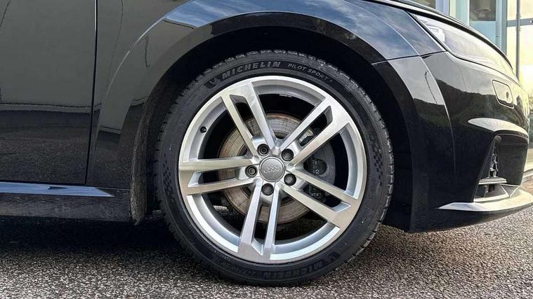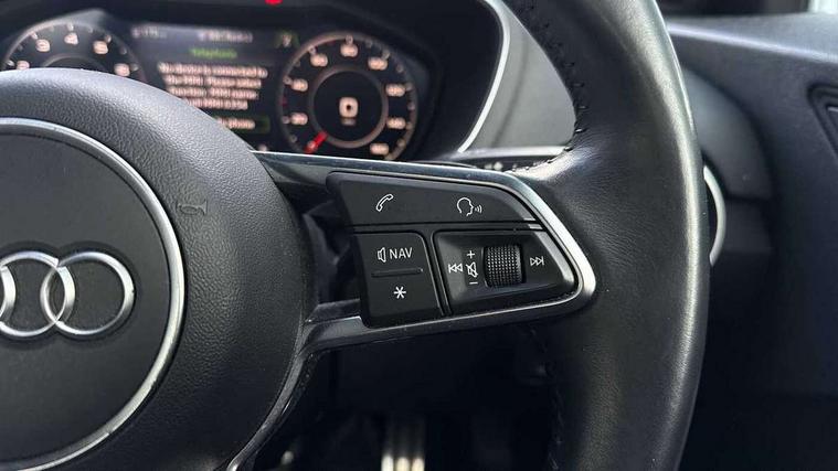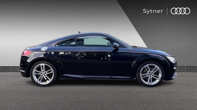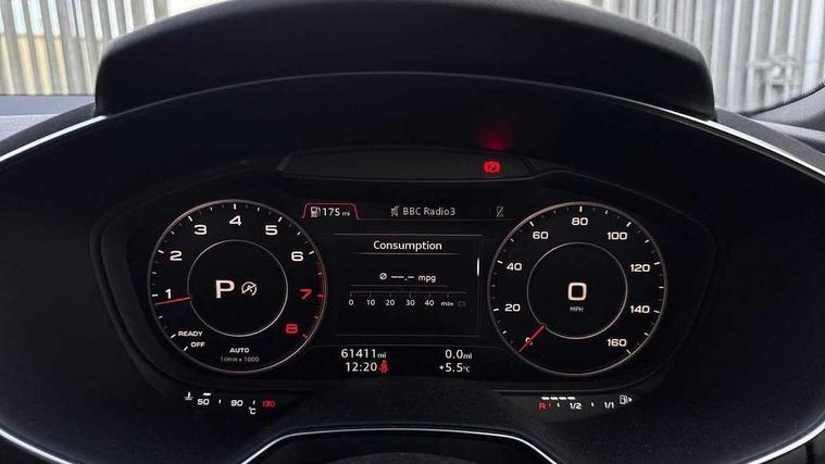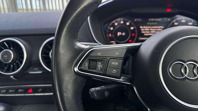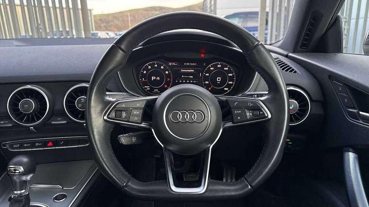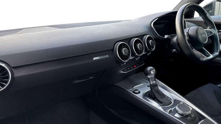 Audi drive select with 4 Pre configured modes, Audi virtual cockpit - 12.3" high-resolution LCD display with fully customisable instrument cluster, Cruise control + speed limiter, MMI touch panel, Mobile phone preparation with bluetooth interface, Progressive power assisted steering, Rear parking sensors, Service interval indicator, Start/Stop system with energy recuperation, TP memo, Sports suspension, 8 Speakers, AM/FM radio, Audi music interface, Bluetooth audio streaming, DAB Digital radio, MMI Radio with CD player and SD/XC card slot, Auto dimming rear view mirror, Body colour bumpers, Electric front windows, Front fog lights, Green tinted heat insulating glass, Light and rain sensors, Retractable rear boot spoiler, Xenon headlights with LED daytime running lights with automatic headline range control + LED rear lights, brake lights and rear indicators, 12V socket, 3 spoke flat bottomed high multi-function leather sport steering wheel with gearshift paddles, Alcantara/Leather upholstery includes seat centre panels, door trim inserts in black Alcantara with side bolsters, head restraints in black leather, Aluminium door sill trims, Front centre armrest, Heated front seats, Height adjustable driver's seat, Height adjustable front head restraints, Height/reach adjust steering wheel, ISOFIX child seat mounting for front passenger seat with airbag deactivation, Reading lights, Rear top tether child seat ISOFIX attachment, Split folding rear seat, Top tether anchor plate for isofix child seat, Non smoking pack - TT/TT RS, 3 point front seat belts, ABS, ASR traction control, Brake energy regeneration, Curtain airbags, Driver and front passenger airbag with front passenger airbag deactivation, EDL traction control, Electromechanical parking brake, ESP, First aid kit, Front side airbags, Head airbags, Hill hold assist, Seatbelt warning, Tyre pressure warning, Warning triangle, Anti theft alarm, Anti theft wheel bolts, Immobiliser, Keyless Go, Remote central locking, Aluminium design inlays, Tool kit, Tyre repair kit,