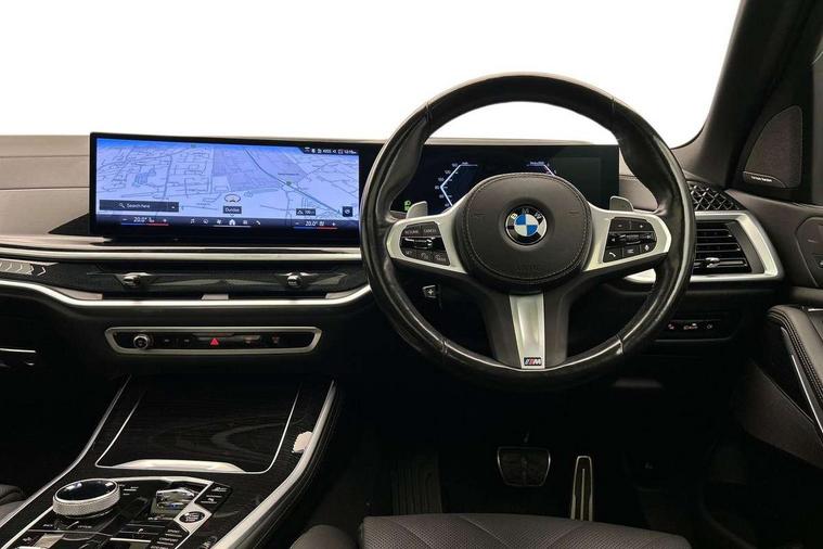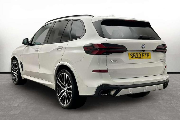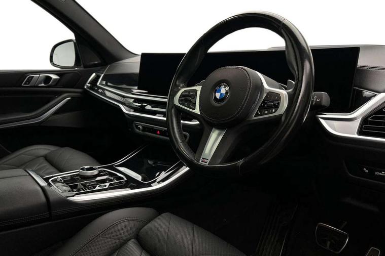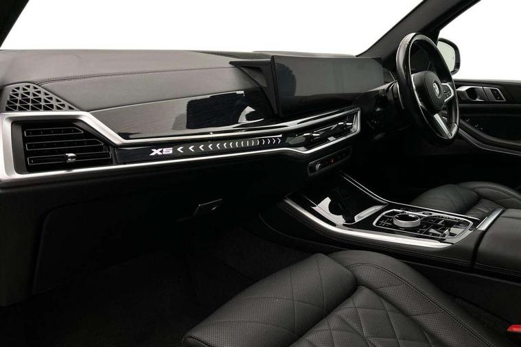 Attentiveness assist, Automatic tailgate operation, BMW ConnectedDrive online services, BMW live cockpit + with curved 12.3 instrument cluster/14.9 central display, nav/Tuner with diversity reception, RDS/4GLTE/remote software upgrade, BMW Recovery system, BMW Teleservices, Condition based service, Cruise control with brake assist, eCall emergency call system, Enhanced bluetooth with wireless charging, Integrated owner's handbook, PAS, Speed limiter, Wi-Fi hotspot, Drive performance control with ECO PRO comfort + sport mode, Eight speed steptronic sport automatic transmission and gearshift paddles on the steering wheel, Hi-Fi loudspeaker system, Adaptive LED Headlights, Front and rear electric windows, High beam assistant, High gloss black shadow line roof rails, LED daytime running lights, Rear side wing doors, Third brake light in rear spoiler, Variable intermittent rear wash/wipe, 12V - Power sockets with 2x centre console and 1x luggage compartment, 3 seat bench in 2nd row, Foldable rear centre armrest with 2 cupholders and storage compartment, Front and rear side armrest integrated into door trim, Headrests for all seats, Luggage compartment separating net, Single front passenger seat, Three spoke sport M leather steering wheel, Velour floormats, Ambient light interior pack - X5, Driving assistant pack with radar based driver assistance system - X5, Expanded exterior mirror pack - X5/X5 M, M aerodynamics pack - X5, 3 rear seatbelts, Active protection, Airbags - driver/front passenger, rear and side, first and second row seats head airbags, front passenger seat airbag deactivation + knee airbag, Anti-lock braking system (ABS), Automatic Stability Control (ASC), Brake energy regeneration, Cornering brake control (CBC), Crash sensor activating central locking release, hazard warning lights, fuel cut off, interior lighting + activation of safety battery terminal clamp, DSC - Dynamic Stability Control, Dynamic Traction Control - DTC, Electromechanical parking brake with automatic drive away release and auto hold function, Electronic brake force distribution, Hill start assistant, M Sport blue painted brake calipers with 'M' designation, Mechanical child proof lock on rear doors, Tyre pressure monitoring system, Tyre pressure sensors, Ventilated front and rear disc brakes, Warning triangle and first aid kit, Closing system with central locking, Comfort access system, Locking wheel bolts, Sensatec instrument panel,