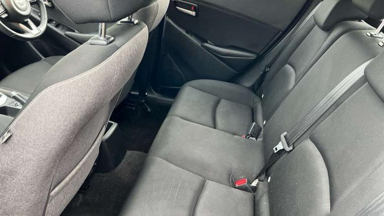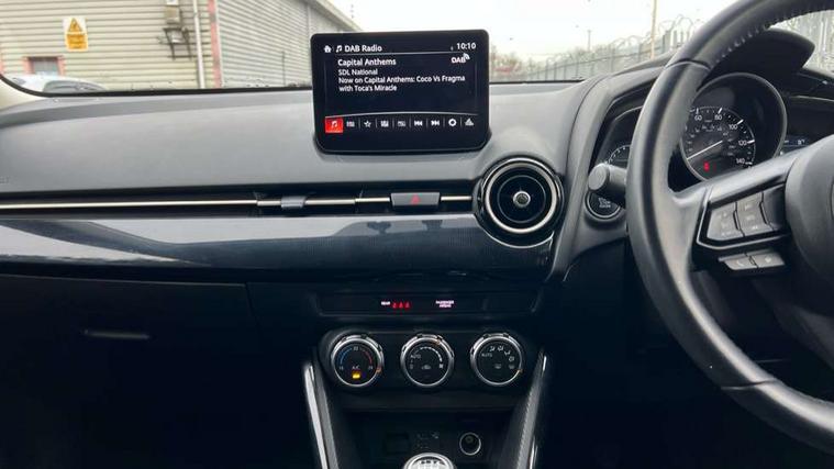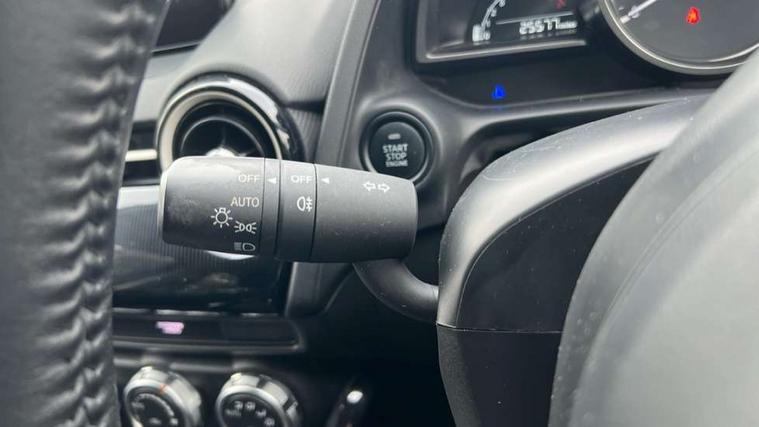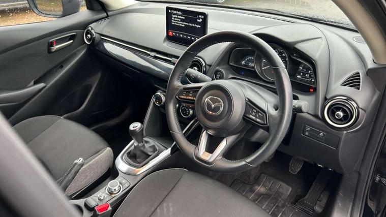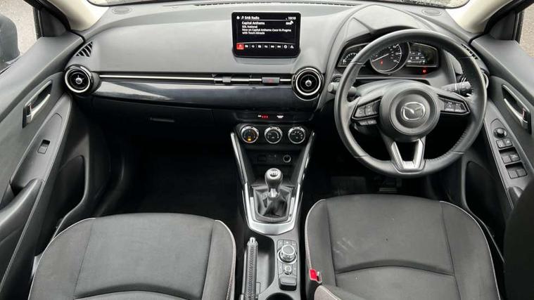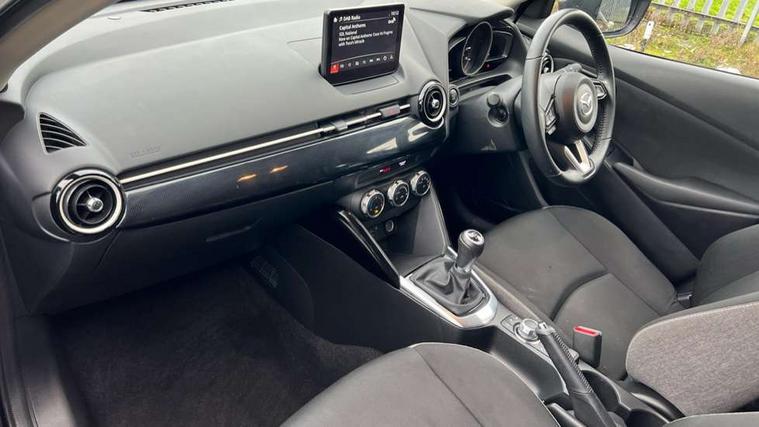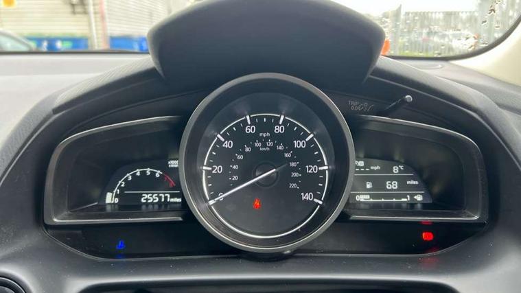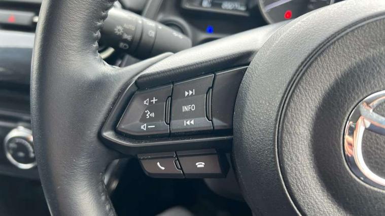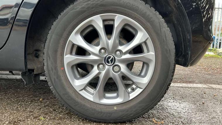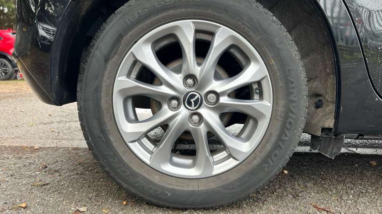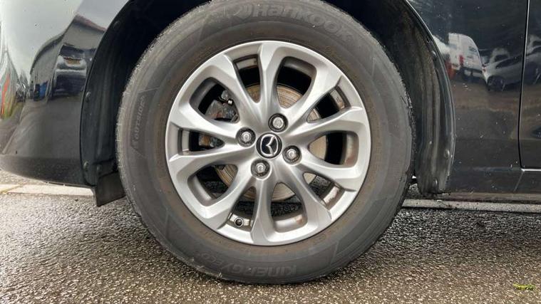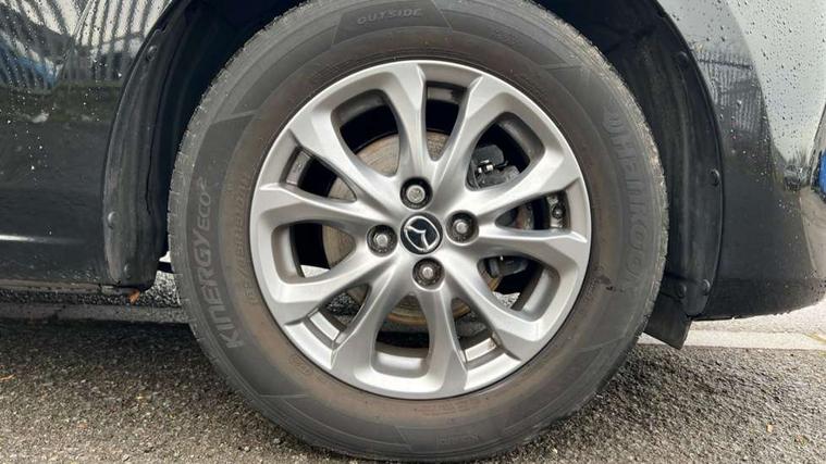 Adjustable speed limiter, Analogue speed display meter, Cruise control, Digital instrument cluster, Digital rev counter, E-call, Emergency stop signalling system, Engine start/stop button, Integrated bluetooth, Mazda connect with 8" colour touch screen, Navigation system, PAS, Rear parking sensor with audible and visual warning, Service indicator, Tailgate, Trip computer, Wireless Apple CarPlay and wired Android Auto, i-stop, AM/FM/DAB radio with 6 speakers with USB and AUX inputs, Multimedia Commander including separate volume dial, Steering wheel mounted audio/bluetooth controls, Auto dimming rear view mirror, Auto headlight levelling, Body colour door mirrors, Body coloured front bumper with black lower bezel, Body coloured rear bumper with black lower mouldings and yellow accent, Coming/leaving home lighting function, Dusk sensing headlights, Electric adjustable/heated/folding door mirrors, Electric front/rear windows with one touch auto up/down for driver's window, Gloss black finish signature wing, Halogen daytime running lights, Heated rear window, LED Headlights, LED indicator lights, LED third brake light, Rain sensing front wipers with adjustable sensitivity and speed, Rear side wing doors, Rear wiper, 3 seat bench in 2nd row, 60/40 split rear seats, Black/white air vent accents, Climate control air conditioning, Driver, Front passenger and two rear grab handles with coathooks, Drivers seat manual slide recline and height adjustment, Drivers/front passengers covered vanity mirrors and drivers ticket holder, Front centre storage with two cupholders, Front head restraints, Front passenger and driver door pockets, Front passenger seat manual slide, recline and height adjust, Front passenger seatback pockets, Gear shift indicator, Glovebox, Interior courtesy light with integrated spotlight, ISOFIX child seat anchorage points attached on outer rear seats, Leather handbrake, Leather steering wheel and gear knob, Luggage compartment light, Premium cloth upholstery, Single front passenger seat, Three height adjustable rear head restraints, Tilt/telescopic adjustable steering wheel, 2x3 point front seatbelts with pre-tensioners, 3 point seatbelts on all rear seats, Anti-lock braking system (ABS), Collision mitigation braking system, Dynamic stability control + Traction control, ESP, Front and rear curtain airbags, Front driver, passenger and rear seat seatbelt warning, Front dual stage driver and single stage front passenger airbags, Front side airbags, G-Vectoring control plus, Hill launch assist, Manual child lock in rear doors, Passenger airbag cut-off switch, Tyre pressure monitoring system, Deadlocking system, Power door locks, Remote central locking, Thatcham accredited alarm and immobiliser, 15" Silver alloy wheels, Emergency tyre repair kit,