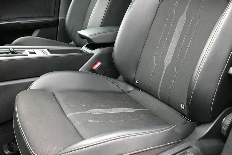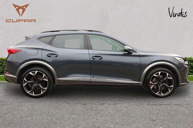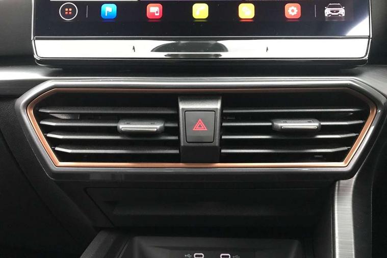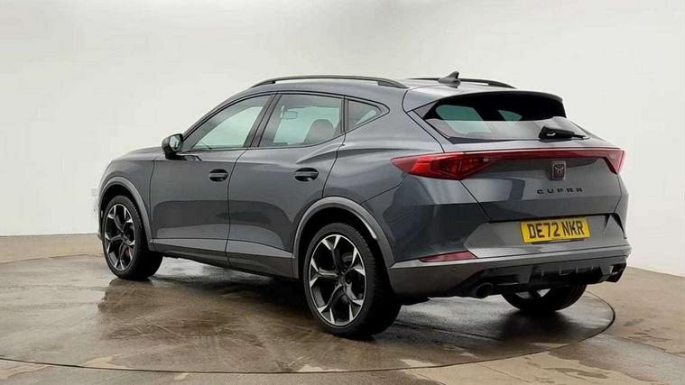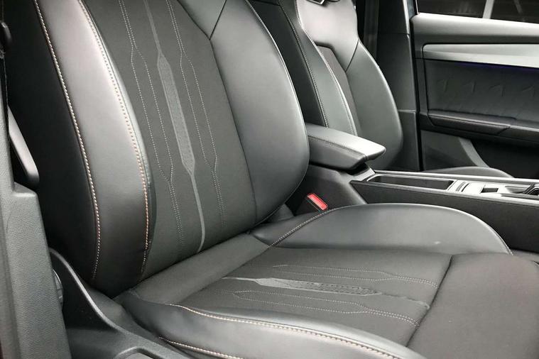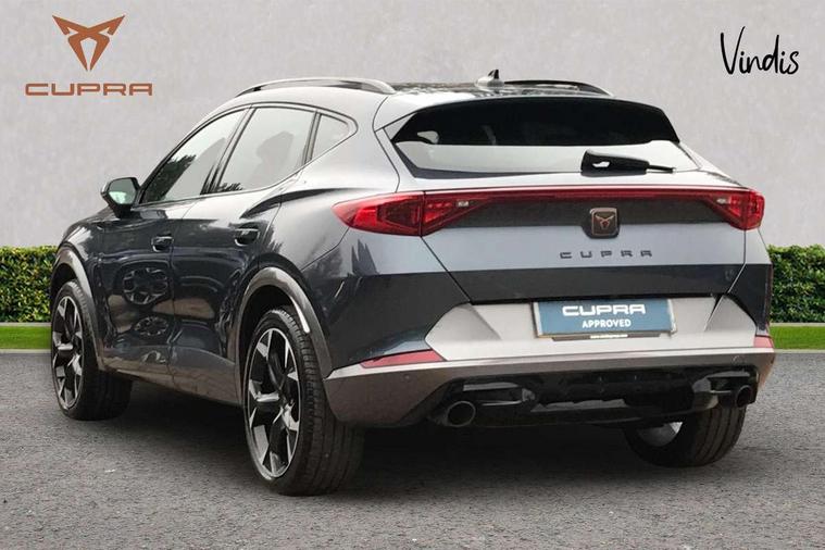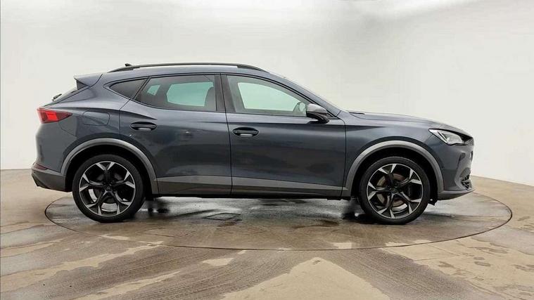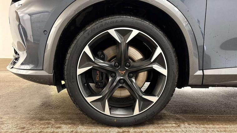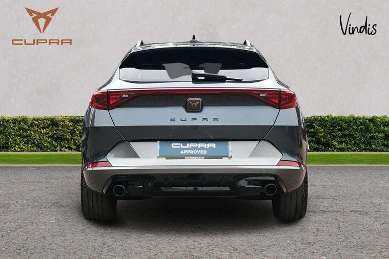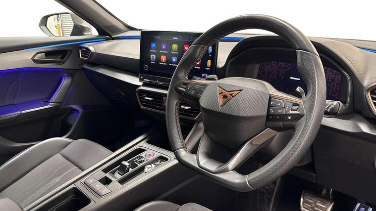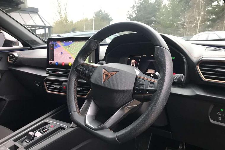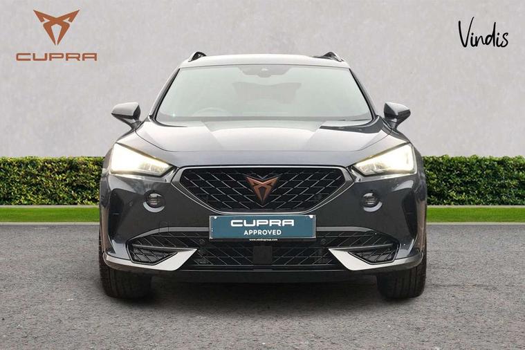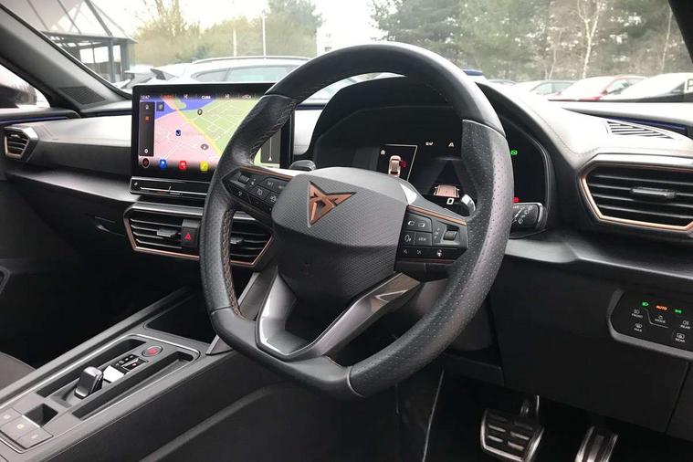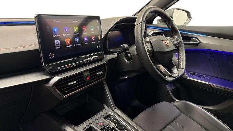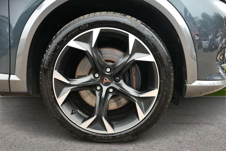 Digital cockpit and configurable dashboard, Driver alert system, Dynamic chassis control with driving profile selection (Comfort, Sport, CUPRA, Individual), E-call, Forward collision warning with automatic braking, Lane assist, Navigation system with 12'' Touchscreen Display, Park assist (inc front/rear parking sensors), Predictive adaptive cruise control with speed limiter, Rear view camera, RPM, trip computer, outside temp gauge, instrument light brightness, low fuel warning light, lights on reminder, gearshift indicator, Service interval indicator, Speed sensitive power steering, Start/stop system with regenerative braking, Virtual pedal and electric tailgate, Voice control system, Wireless apple carplay, Wireless phone charger, Sports suspension with front shock absoption, 2 front and 2 rear USB type C sockets, Auxiliary input socket, DAB radio, Auto dimming rear view mirror, Body colour door handles, Body coloured bumpers, Dark grey wing mirror, Daytime running light with automatic headlight control and coming home feature, Dynamic headlight range control, Electric front/rear windows, Electrically adjustable, heated and folding door mirrors, Front fog lamps with cornering function, Gloss black roof rails and window surrounds, LED Headlights, LED Taillights with dynamic indicator, Rain sensing wipers, Rear diffuser with single exhaust pipe on each side, Rear side wing doors, Rear wash/wipe, Sports bumpers, Third brake light, Tinted rear windows, Welcome lights, 12v power supply in centre console, 12V socket, 12v socket in loadspace, 2 front and 2 rear reading lights, 230V socket, 3 seat bench in 2nd row, 60/40 split rear bench seat with armrest and mechanical seat release, Black headlining, Cupra sports pedals, Dust/pollen filter, Front and rear head restraints, Front centre armrest, Height/reach adjust steering wheel, Illuminated interior front door sills, Illuminated sunvisor with mirror, Isofix, Leather multi function heated steering wheel with gear shift paddles, Luggage tie-down hooks, Manually adjustable height and lumbar support for front seats, PVC/Cloth upholstery with copper stitching + bucket seats, Single front passenger seat, Three zone climate control with control panel in rear, Variable luggage/load compartment floor, Wraparound lighting, 3 point seatbelts on all rear seats, ABS, Brake control system - ESC and brake booster, Child proof door locks, Driver and front passenger airbags with front passenger airbag de-activation, Electronic parking brake, Front and rear disc brakes, Front side curtain airbags, Hill hold control, Seat belt reminder for front and rear seats, Tyre pressure monitoring system, Anti theft alarm system, Keyless entry and start system (KESSY), Locking wheel bolts, Copper and aluminium interior detailing, 19" 'Exclusive' machined sport matte black and silver alloy wheels, Space saver spare wheel,