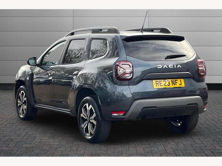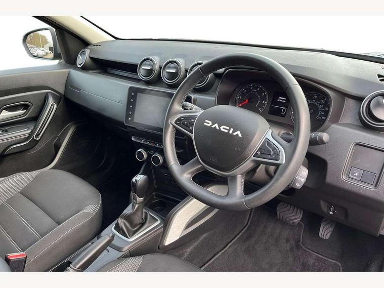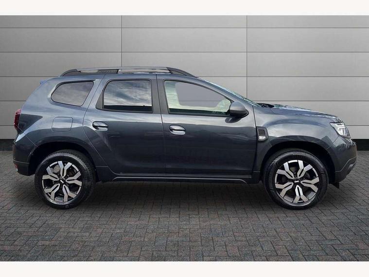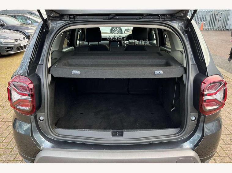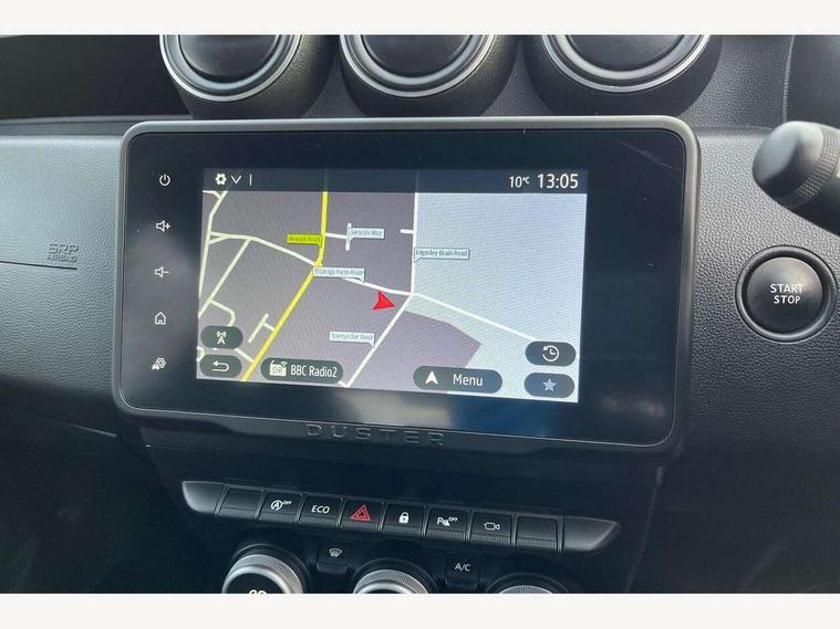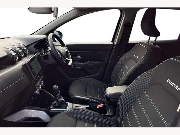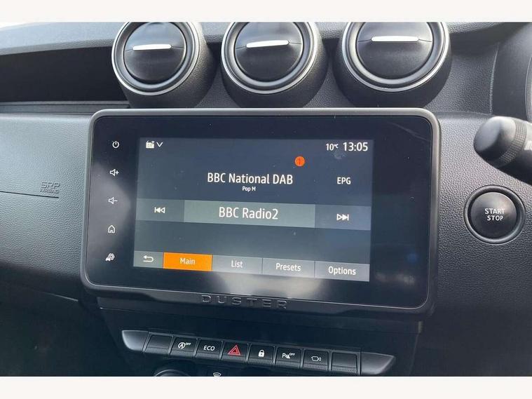Blind spot warning, Cruise control and speed limiter, eCall emergency system, Eco mode, Electric power assisted steering, Multi view camera, On board computer, odometer, trip computer, average fuel consumption, average speed, service indicator, outside temperature gauge, Rear parking sensors, Rev counter, Reversing camera, Stop/start system, 8" Media Navigation with wireless smartphone replication, Dacia plug and radio/MP3/USB/bluetooth/DAB/steering wheel control, 3 speed windscreen wipers, Acoustic windshield, Automatic front wipers, Black side sills, Black/satin chrome tailgate trim with Duster inscription in black background and lettering, Body coloured door handles, Chrome front grille with hot stamping, Chrome logo surround on steering wheel, Dark glass on lateral rear windows, Daytime running lights, Drivers window one touch up/down, Dusk sensor, Electric adjustable/heated door mirrors, Electric folding door mirrors, Electric front windows, Electric rear windows, Front and rear body coloured bumpers, Front door sill protection strip, Front fog lights, Grey quartz longitudinal roof bars with Duster inscription, Heated rear window, High level third rear brake light, Modular roof bars, Rain sensor, Rear side wing doors, Rear spoiler, Rear wash/wipe, Satin chrome door mirrors, Underbody protection skid plates, Y shaped LED headlights with rear LED lights, 3 rear height adjustable headrests, 3 seat bench in 2nd row, 60/40 split folding rear seat, Automatic air conditioning, Backlighted steering wheel buttons, Boot light, Driver seat lumbar adjustment, Fabric decorative insert on door panels, Fabric upholstery, Front head restraints, Front passenger reading light, Gear shift indicator, Glovebox light, Heated seats, Height adjustable driver seat, Height adjustable front and rear headrests, Height and depth adjustable steering wheel, High centre console with driver armrest, Isofix points for child seats in both outer rear seats, Map pocket on front seat backs, Passenger sunvisor with vanity mirror, Rear passenger reading light, Satin chrome gear lever cap insert, Satin chrome interior door handles, Satin chrome lower steering wheel insert, Single front passenger seat, Soft feel leather steering wheel, 3x3 point rear seatbelts, ABS and Emergency brake assist, ASR traction control with Electronic stability control, Child locks on rear doors, Door open visual and audible warning, Driver airbag, Driver and passenger seatbelt not fastened - visual and audible warning, EBD - Electronic brakeforce distribution, Front passenger airbag, Front passenger airbag deactivation, Front seatbelt pretensioners, Front side airbags, Height adjustable front seatbelts, Hill start assist, Tyre pressure monitor, Keyless entry, Remote central locking, Thatcham approved engine immobiliser, Charcoal grey central console surround, Matt black central console fascia, Matt black decorative insert on rear door panels, Piano black decorative insert on front door panels, Satin chrome air vent surround, Satin chrome instrument dial surrounds, 17" Alloy wheels,