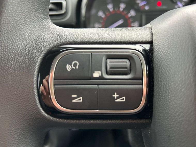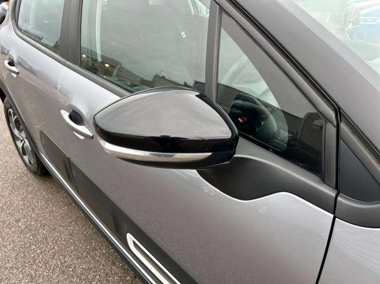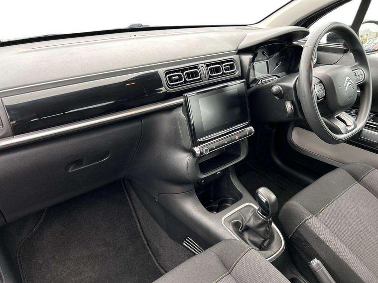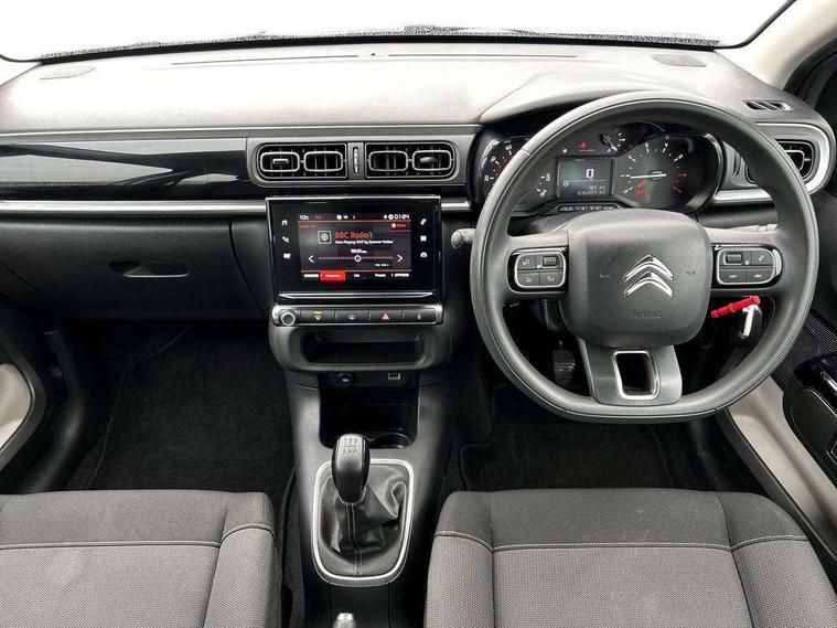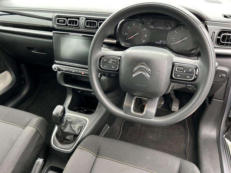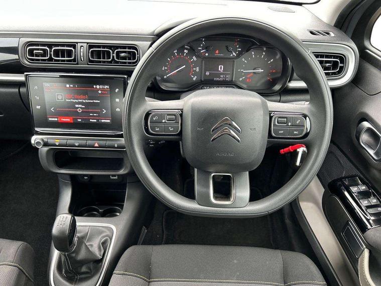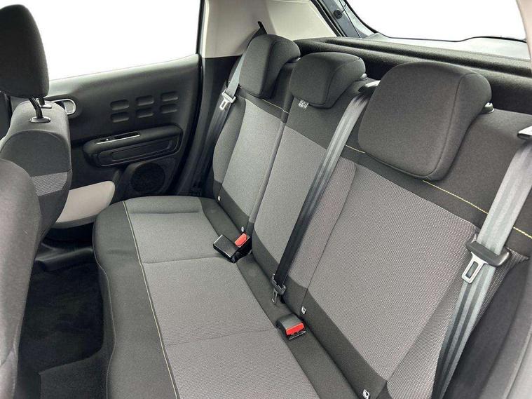 Coffee Break Alert, Cruise control + speed limiter, Exterior temperature display, Instrument cluster with white LCD and analogue gauges, Multi function trip computer, Rear parking sensors, Variable assistance power steering, USB connection, 3D rear light signature, Automatic activation of hazard warning lights, Body colour bumpers, Body colour door handles, Chrome decoration on front face, under chevrons and around daytime running lights, Citroen illuminated signature in LED headlights and LED daytime running lights, Electric folding and heated door mirrors, Electric front windows with one touch/anti-pinch, Fog lights integrated into front bumper, LED Headlights, Manual rear windows, Matt black finish B pillar, Rear windscreen wiper with intermittent mode linked to vehicle speed and automatic activation when reverse gear selected, Roof colour rear view mirror caps, Standard day night switchable interior rear view mirror, Tinted side windows, 1/3 to 2/3 split folding rear seat, 12V socket, Automatic air conditioning, Driver and passenger's sun visor with courtesy mirror, Driver's seat height adjustment, Fixing boot light, Front lighting panel with map reading lights, Front seats adjustable with forward back slide and adjustable backrest, Height adjustable front head restraints, Height/reach adjust steering wheel, ISOFIX mounting on outer rear seats with top tether and labels indicating fixing points, Mica cloth upholstery, Parcel shelf, Seatbelt unfastened on the move audible and visual alert for front and rear seats, Soft touch gear lever with leather effect gaiter and overstitching, Storage space under touchscreen with rubber mat, Three rear seats with head restraints, Upholstered armrest in front and rear doors, Safety pack 1 - C3, Visibility pack with automatic lights - C3, ABS with Electronic brakeforce distribution and Emergency braking assistance, Driver and front passenger seatbelts with pyrotechnic pretensioners and force limiters, Driver's airbag, Electric child locks, ESP with anti skid system, Front passenger airbag, Front passenger airbag deactivation, Front side airbags + front/rear curtain airbags, Hill start assist, Manual parking brake with chrome finish button, Mono-tone horn, Three rear three point seatbelts with outer seats have pretensioners and force limiters, Tyre pressure monitoring system, Anti theft alarm, Automatic door and boot locking with automatic unlocking in case of impact, Central locking with locked indicator and interior one touch lock button, Immobiliser, Remote control central locking with two plip keys, Gloss black dashboard finish with grey surround, 16" Hellix diamond black alloy wheels, Tyre puncture repair kit,