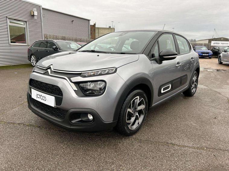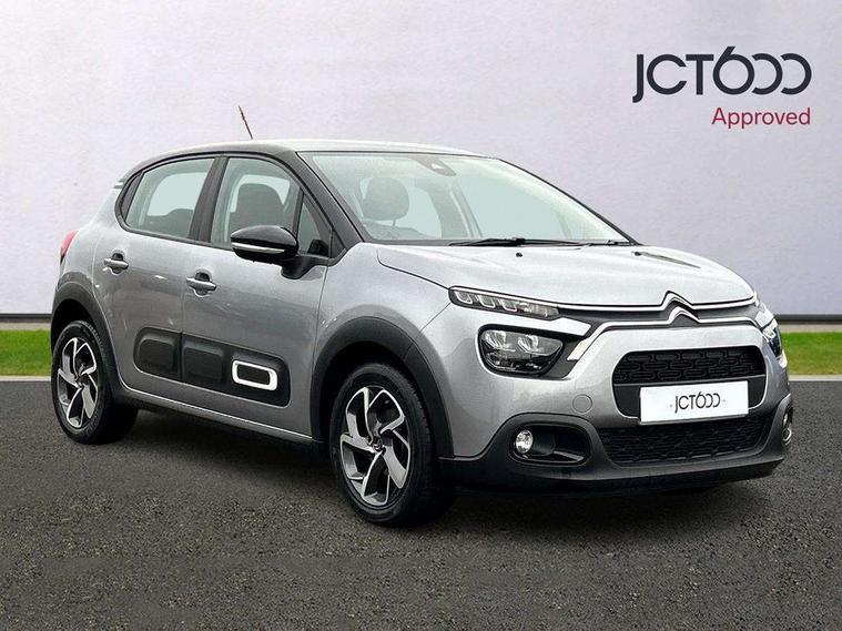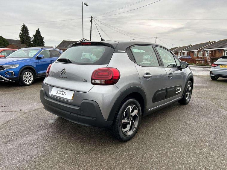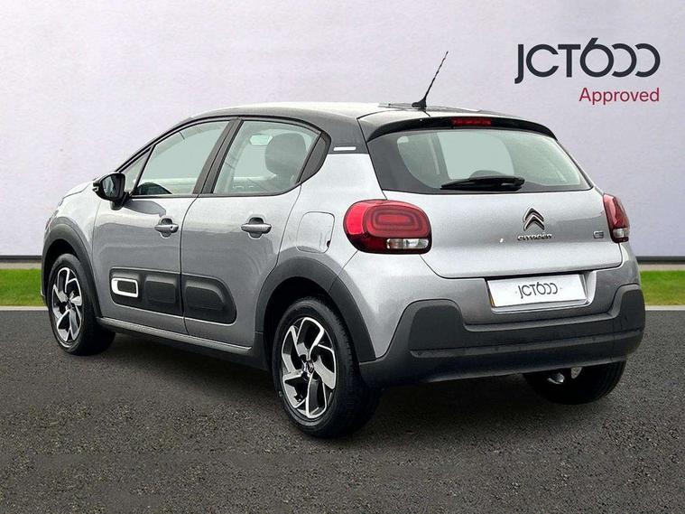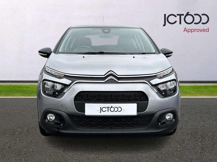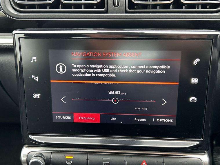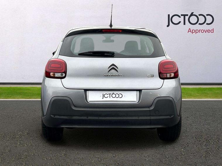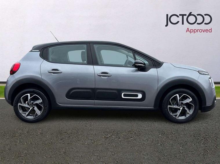 Coffee Break Alert, Cruise control + speed limiter, Exterior temperature display, Instrument cluster with white LCD and analogue gauges, Multi function trip computer, Rear parking sensors, Variable assistance power steering, USB connection, 3D rear light signature, Automatic activation of hazard warning lights, Body colour bumpers, Body colour door handles, Chrome decoration on front face, under chevrons and around daytime running lights, Citroen illuminated signature in LED headlights and LED daytime running lights, Electric folding and heated door mirrors, Electric front windows with one touch/anti-pinch, Fog lights integrated into front bumper, LED Headlights, Manual rear windows, Matt black finish B pillar, Rear windscreen wiper with intermittent mode linked to vehicle speed and automatic activation when reverse gear selected, Roof colour rear view mirror caps, Standard day night switchable interior rear view mirror, Tinted side windows, 1/3 to 2/3 split folding rear seat, 12V socket, Automatic air conditioning, Driver and passenger's sun visor with courtesy mirror, Driver's seat height adjustment, Fixing boot light, Front lighting panel with map reading lights, Front seats adjustable with forward back slide and adjustable backrest, Height adjustable front head restraints, Height/reach adjust steering wheel, ISOFIX mounting on outer rear seats with top tether and labels indicating fixing points, Mica cloth upholstery, Parcel shelf, Seatbelt unfastened on the move audible and visual alert for front and rear seats, Soft touch gear lever with leather effect gaiter and overstitching, Storage space under touchscreen with rubber mat, Three rear seats with head restraints, Upholstered armrest in front and rear doors, Safety pack 1 - C3, Visibility pack with automatic lights - C3, ABS with Electronic brakeforce distribution and Emergency braking assistance, Driver and front passenger seatbelts with pyrotechnic pretensioners and force limiters, Driver's airbag, Electric child locks, ESP with anti skid system, Front passenger airbag, Front passenger airbag deactivation, Front side airbags + front/rear curtain airbags, Hill start assist, Manual parking brake with chrome finish button, Mono-tone horn, Three rear three point seatbelts with outer seats have pretensioners and force limiters, Tyre pressure monitoring system, Anti theft alarm, Automatic door and boot locking with automatic unlocking in case of impact, Central locking with locked indicator and interior one touch lock button, Immobiliser, Remote control central locking with two plip keys, Gloss black dashboard finish with grey surround, 16" Hellix diamond black alloy wheels, Tyre puncture repair kit,